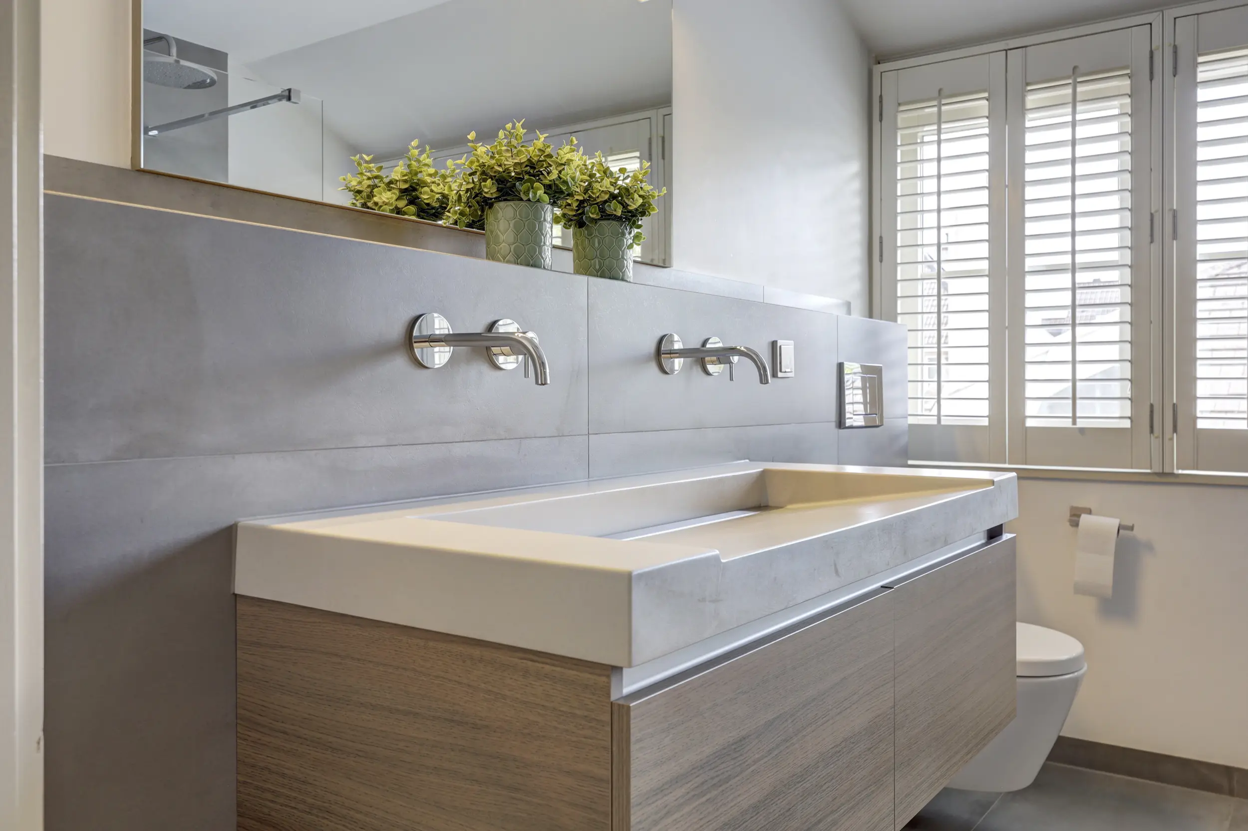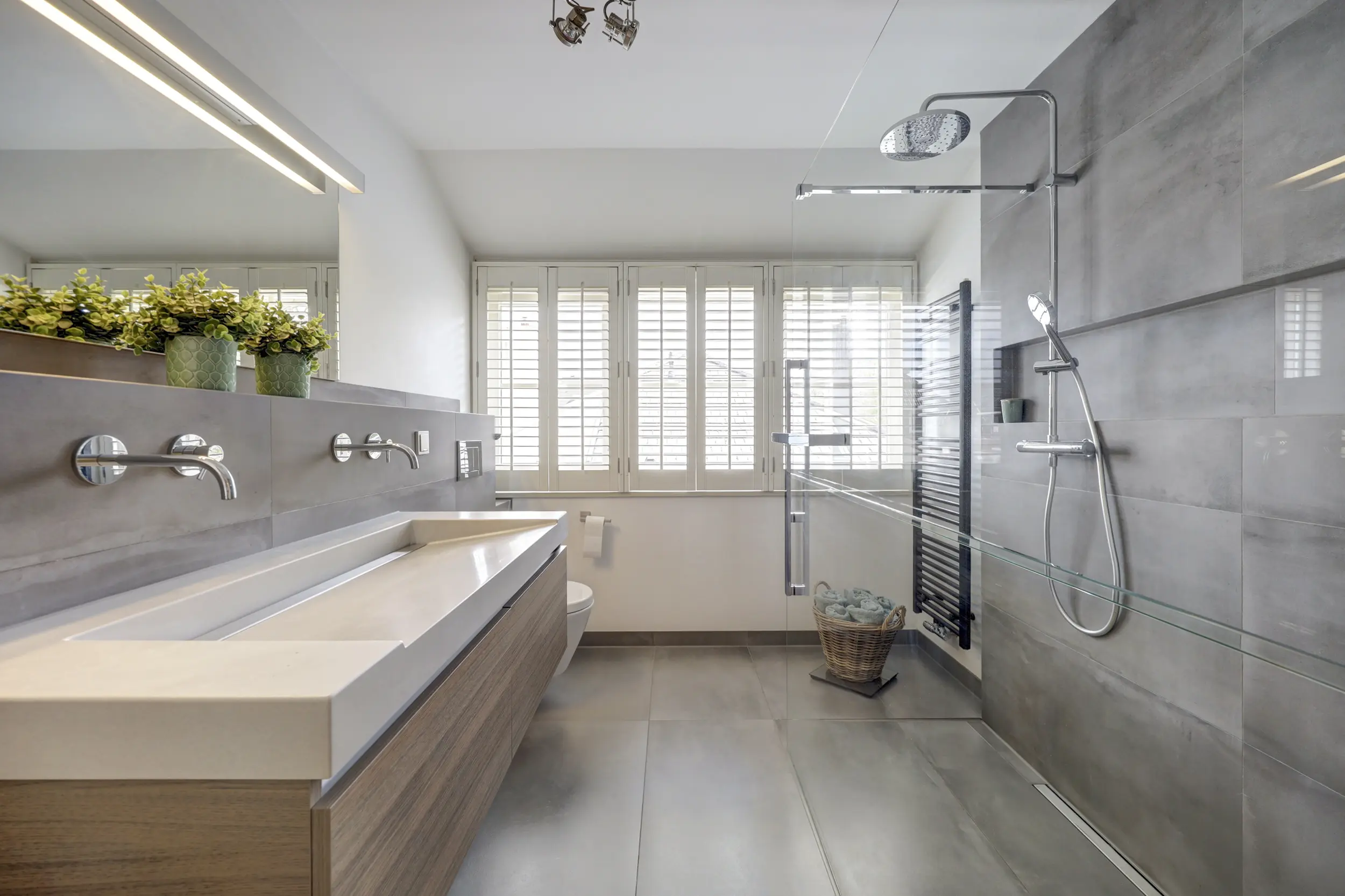 De badkamer voldoet aan alle wensen: een ruime glazen inloopdouche met dubbele stort- en handdouche, dubbel wastafelmeubel met strakke lijnen en in de muur geïntegreerde kranen, 2e toilet, radiator en fraai tegelwerk.