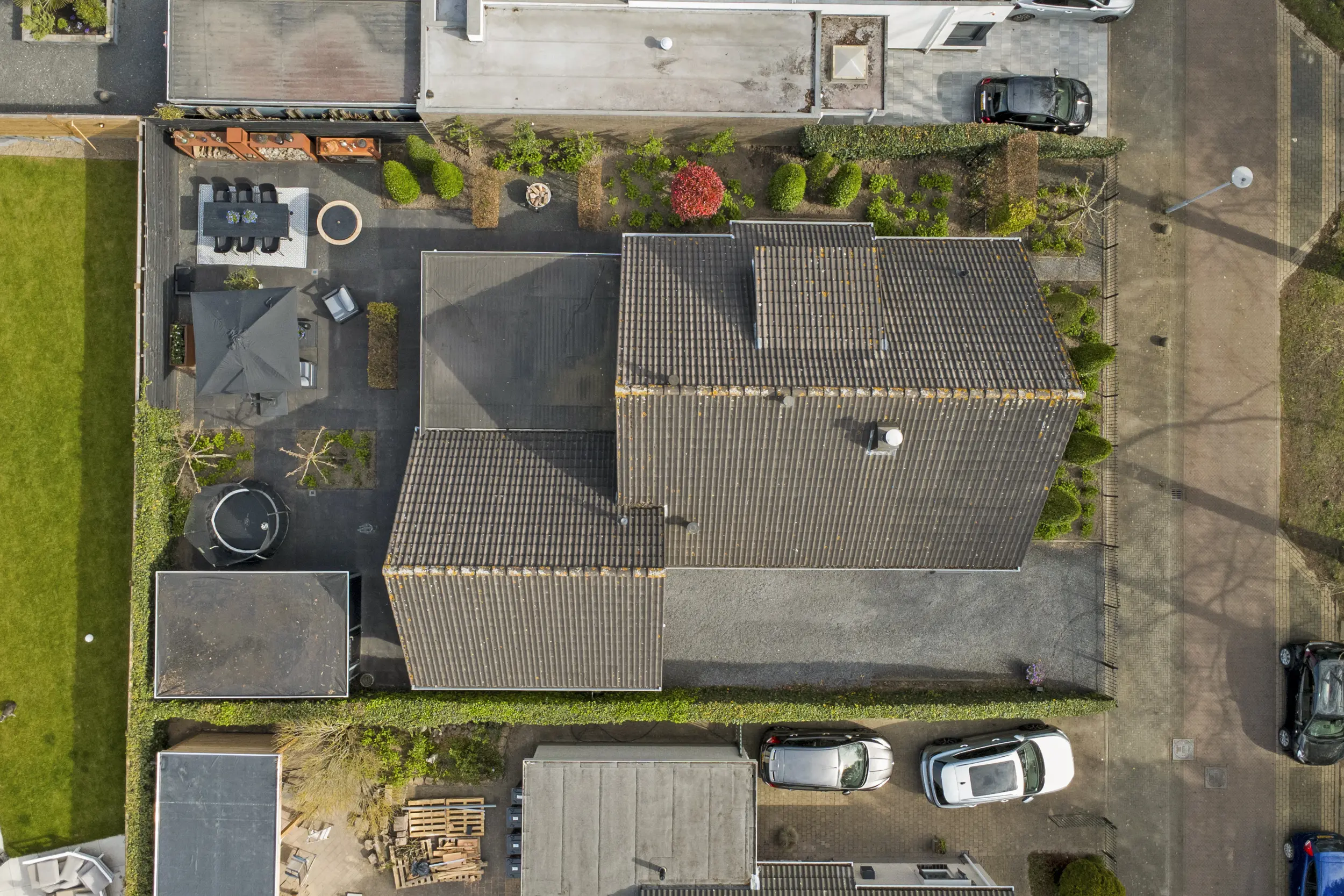 Aan de voorzijde kun je meerdere auto's parkeren om de oprit, of natuurlijk in je eigen garage.