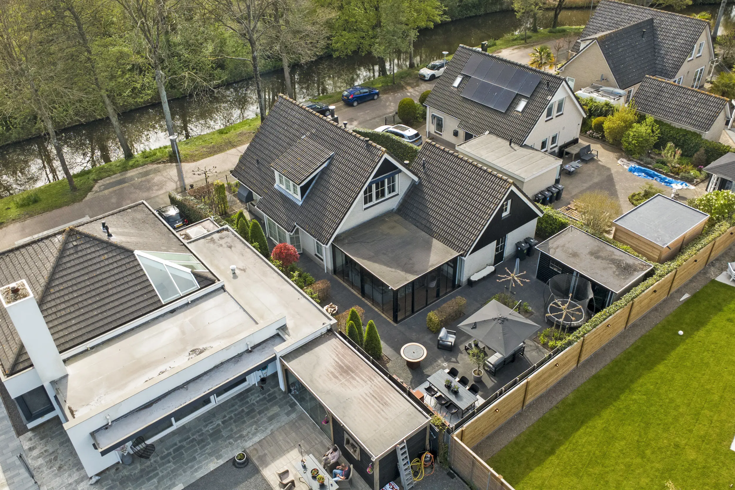 - Fraaie tuin rondom met overkapping voorzien van glazen schuifwanden.