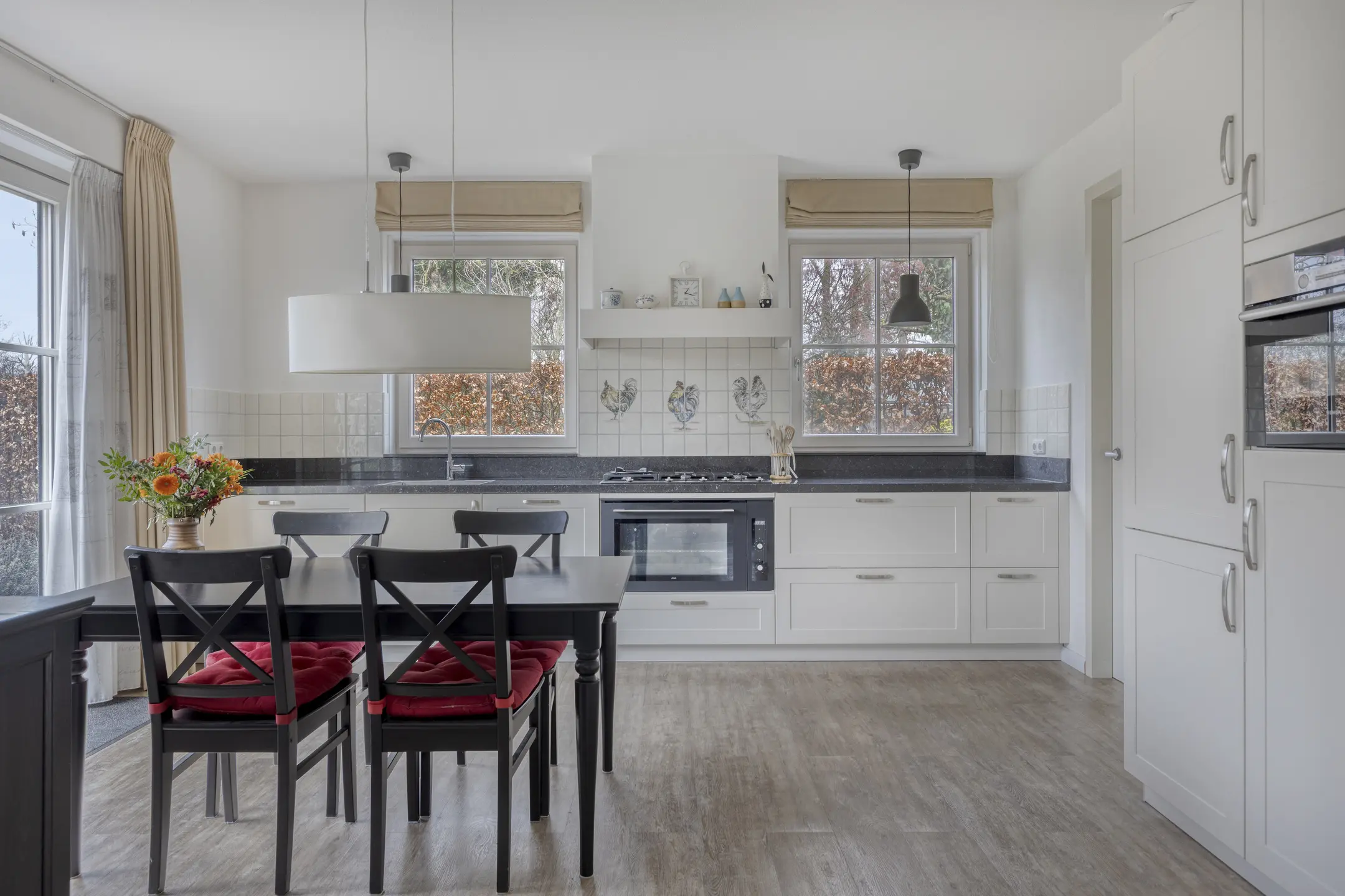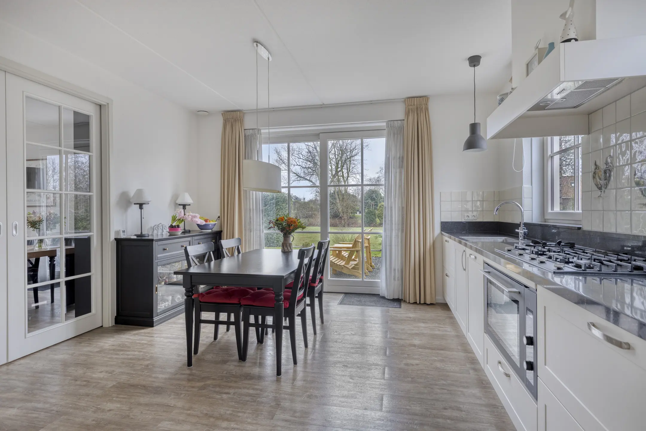 De begane grond biedt een royale en lichte woonomgeving met grote ramen aan zowel de voor- als achterzijde, waardoor er de hele dag door veel natuurlijk licht binnenvalt. De woonkamer is ruim van opzet en biedt verschillende mogelijkheden voor een comfortabele zithoek, een eethoek en eventueel een werk- of leeshoek. De open keuken grenst direct aan de woonkamer en is voorzien van moderne inbouwapparatuur, waaronder een fornuis, oven, afzuigkap, koelkast, vriezer en vaatwasser. De indeling maakt het eenvoudig om een sociale leefruimte te creëren waar koken, eten en ontspannen samenkomen.