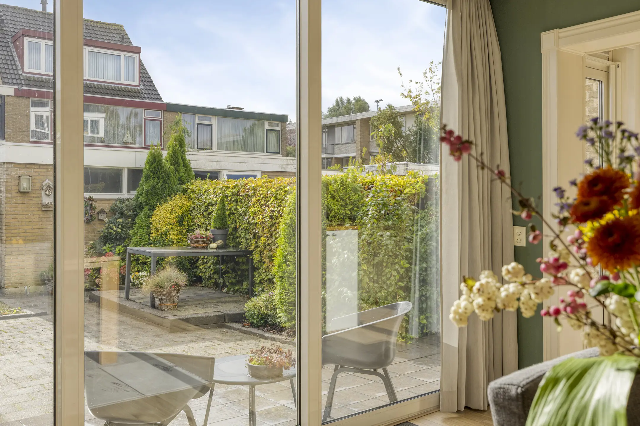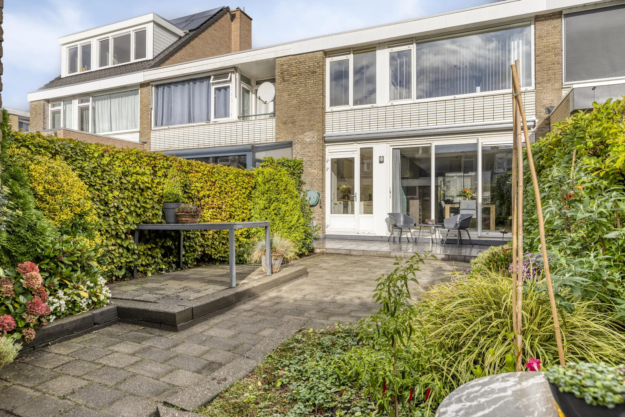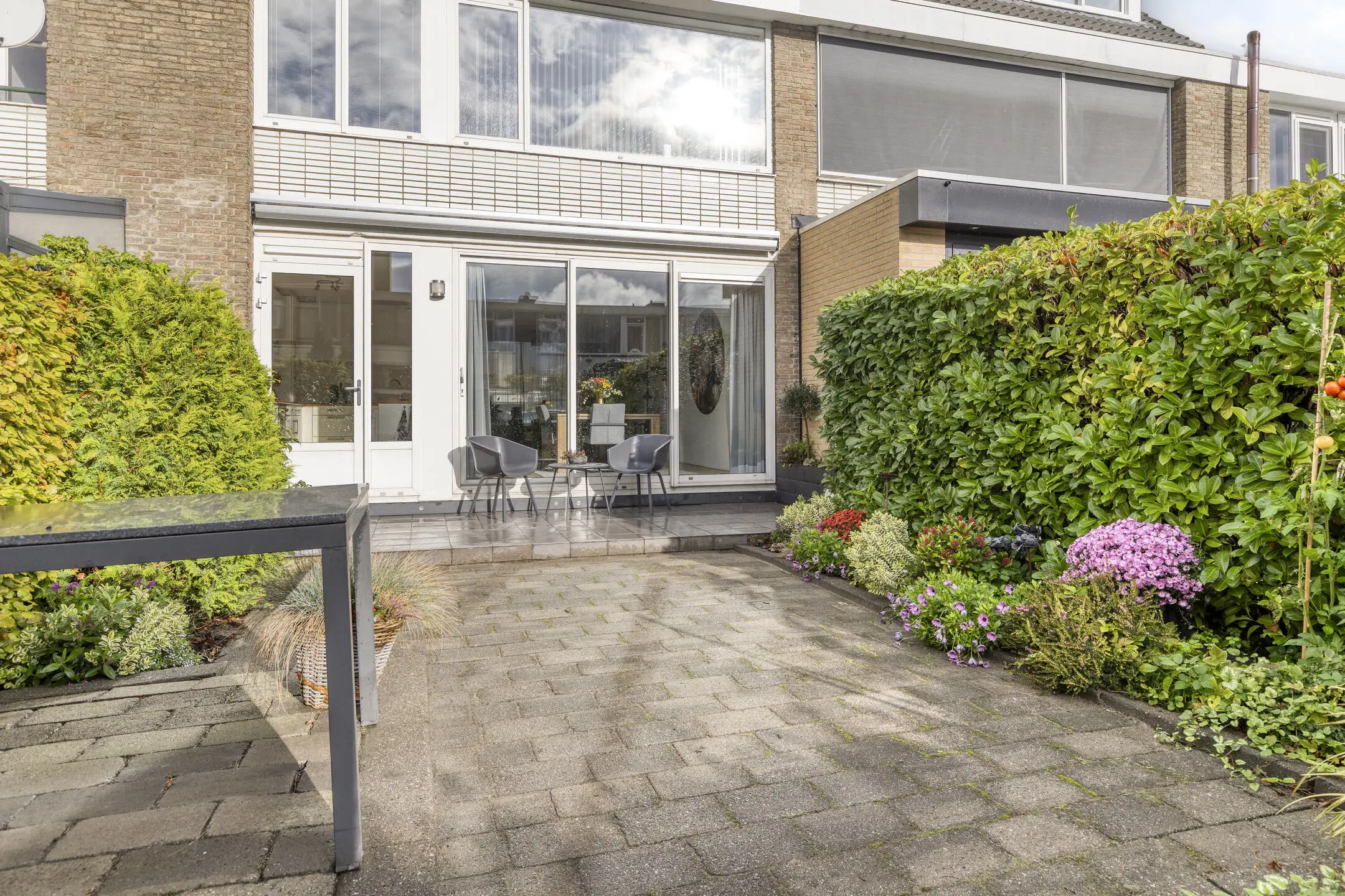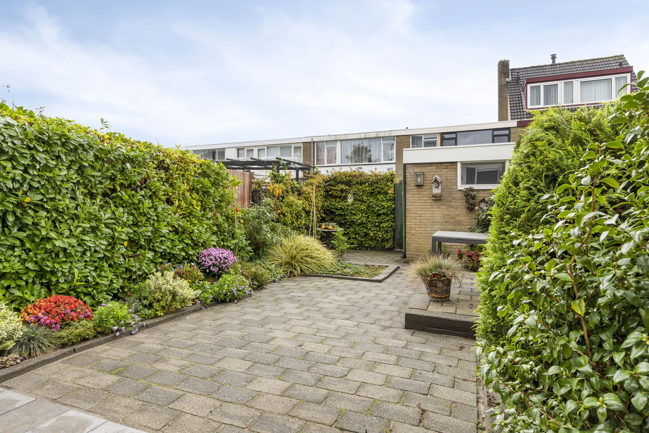 Onderhoudsvriendelijke op noorden gelegen voortuin met buitenkraan en aangrenzend een parkeerpleintje. De gunstig op het zuiden gelegen achtertuin is een heerlijke plek om vrijwel de gehele dag van de zon te genieten. Het terras direct achter de woning is onderheid. Het elektrisch bedienbare zonnescherm met gestreept doek houdt de zon uit de woning. De tuin is onderhoudsvriendelijk aangelegd en er is een buitenkraan aanwezig en een achterpoort. De stenen berging met elektra biedt voldoende bergruimte.