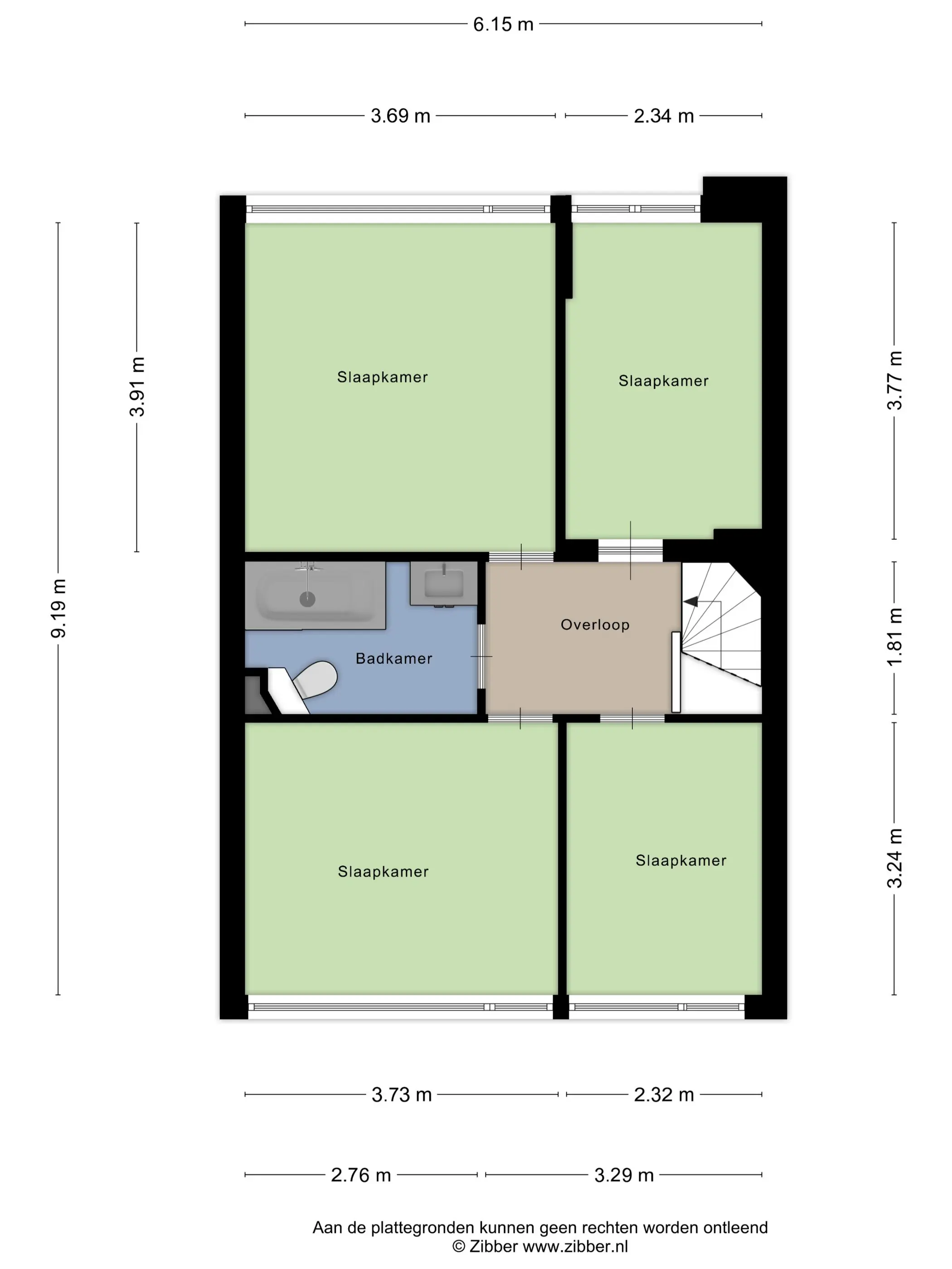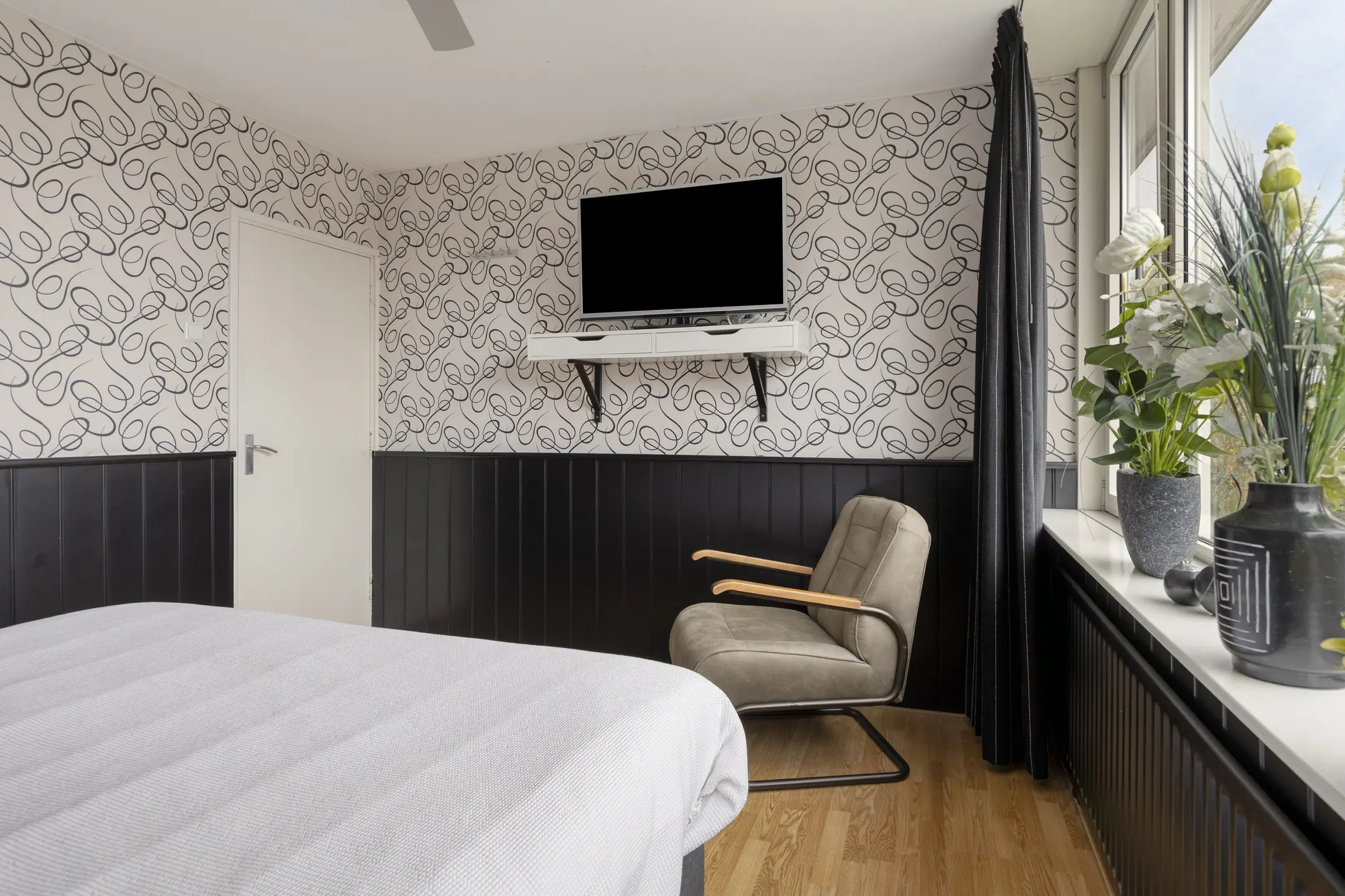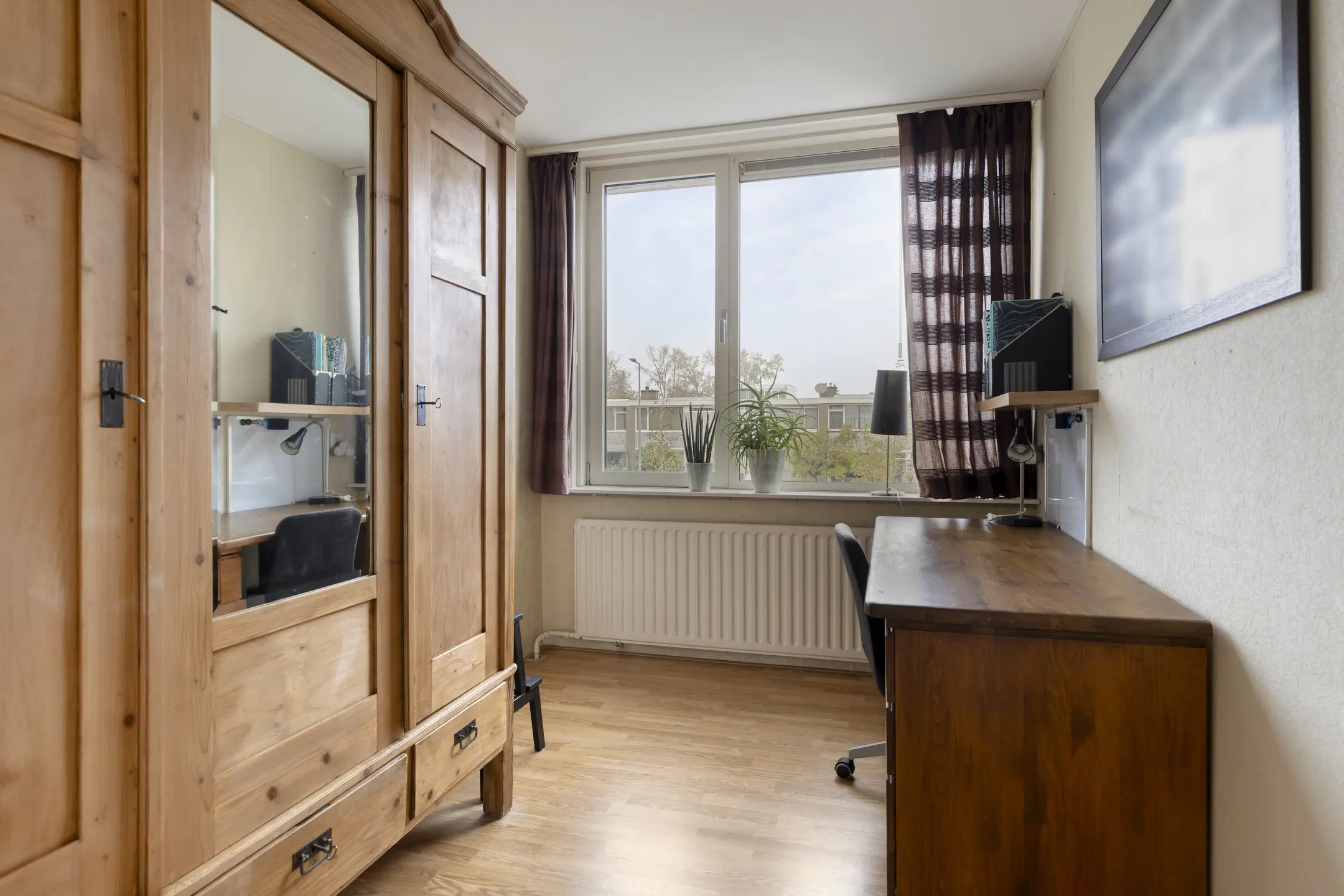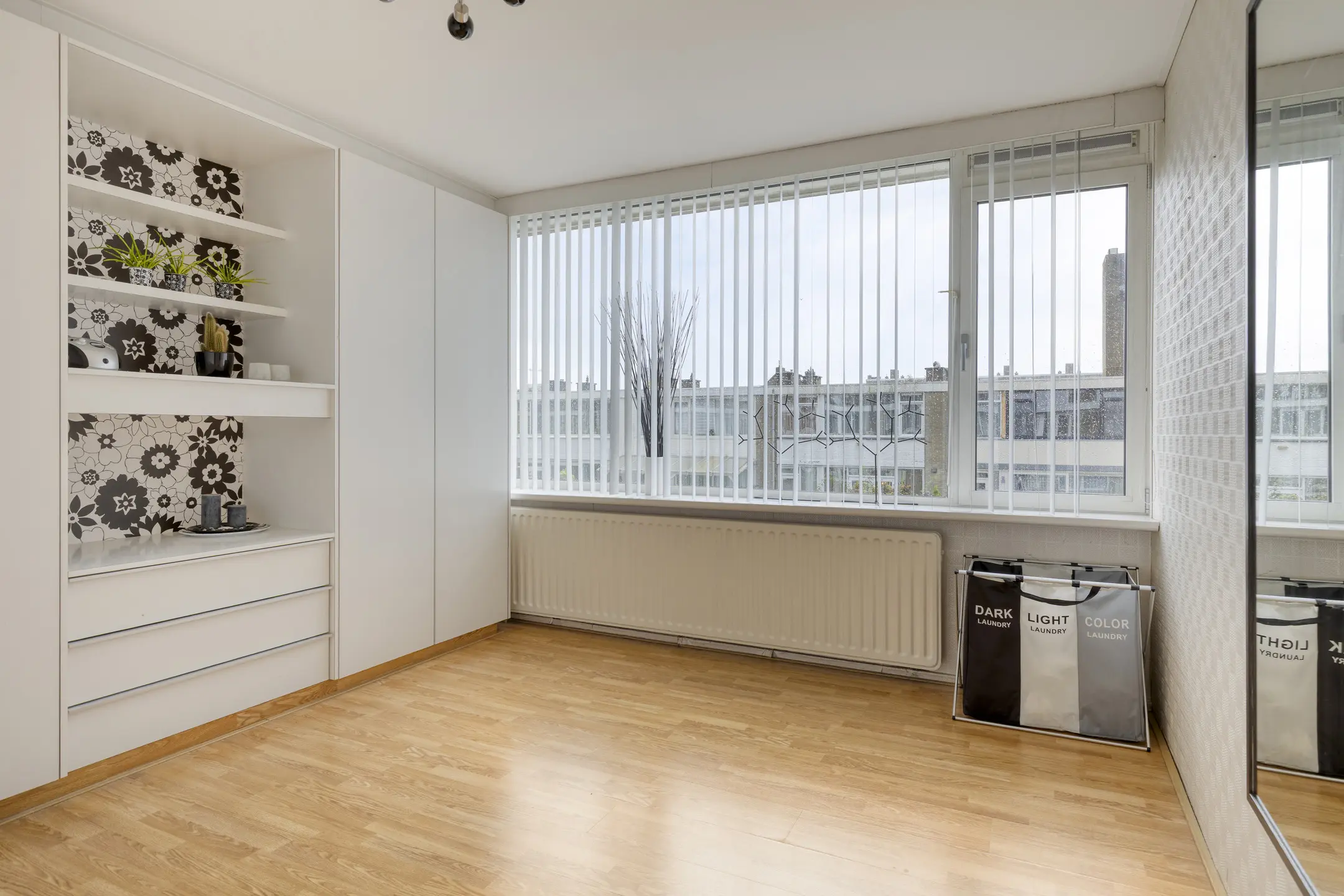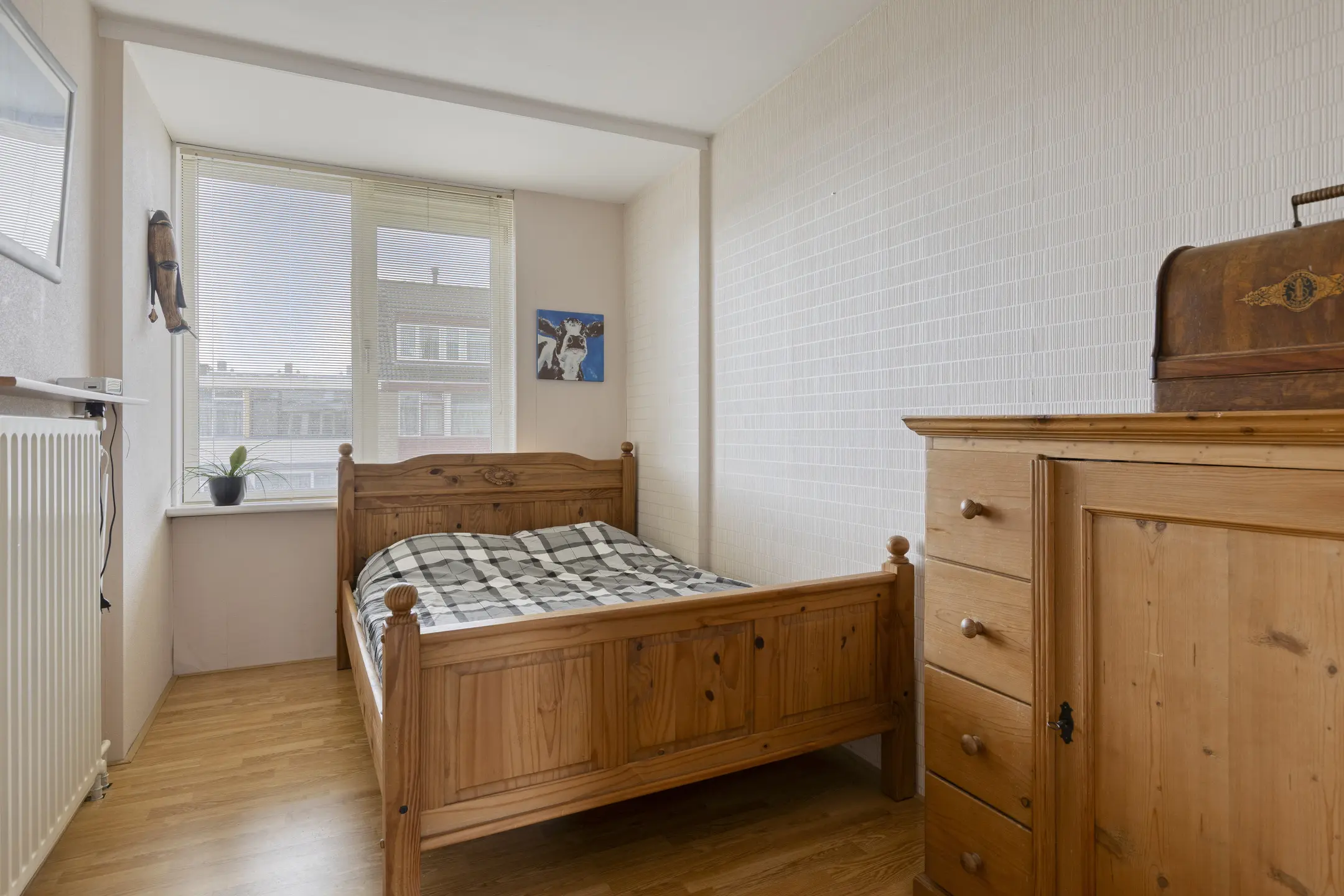 Ruime overloop met toegang tot alle vertrekken; twee slaapkamers aan de voorzijde en twee slaapkamers aan de achterzijde van de woning. Dit zijn allen kamers van goed formaat. Eén van de kamers is momenteel in gebruik als kastenkamer met een mooie witte op maat gemaakte kast in hoekopstelling. Op de overloop en in de kamers ligt een laminaatvloer welke drempelloos is doorgelegd. In de geheel betegelde badkamer zijn een ligbad met douchescherm, wandcloset, radiator, wastafelmeubel en spiegelkast aanwezig.