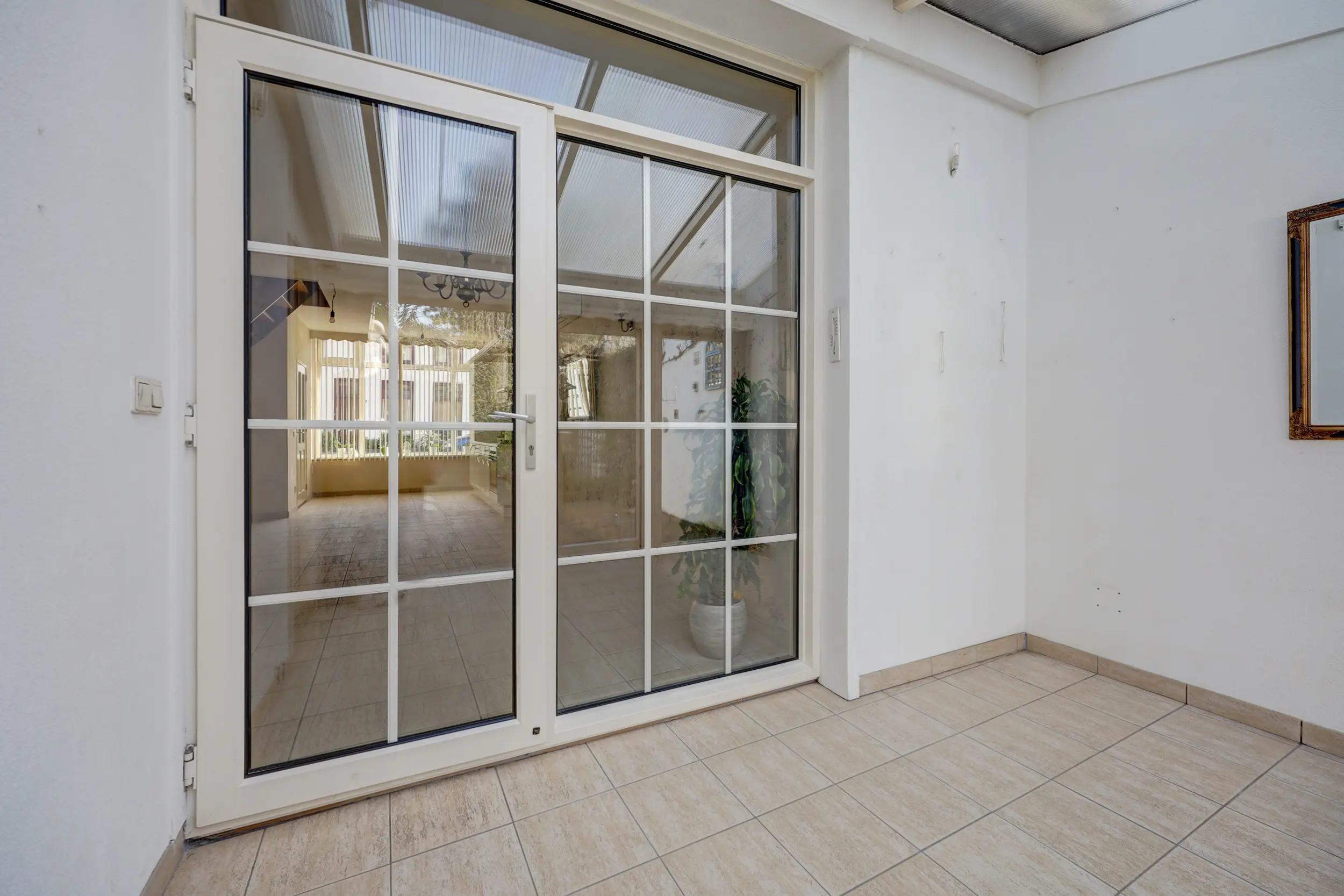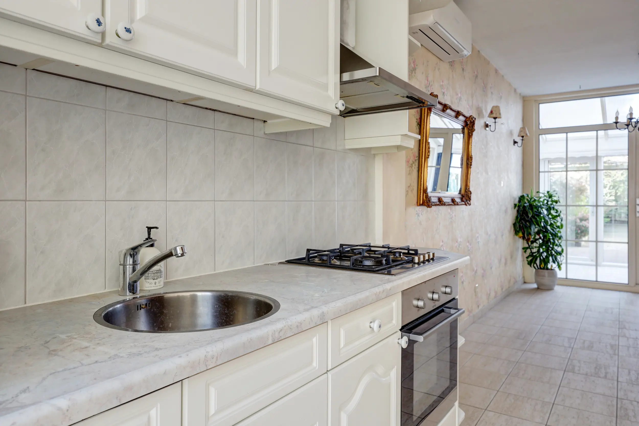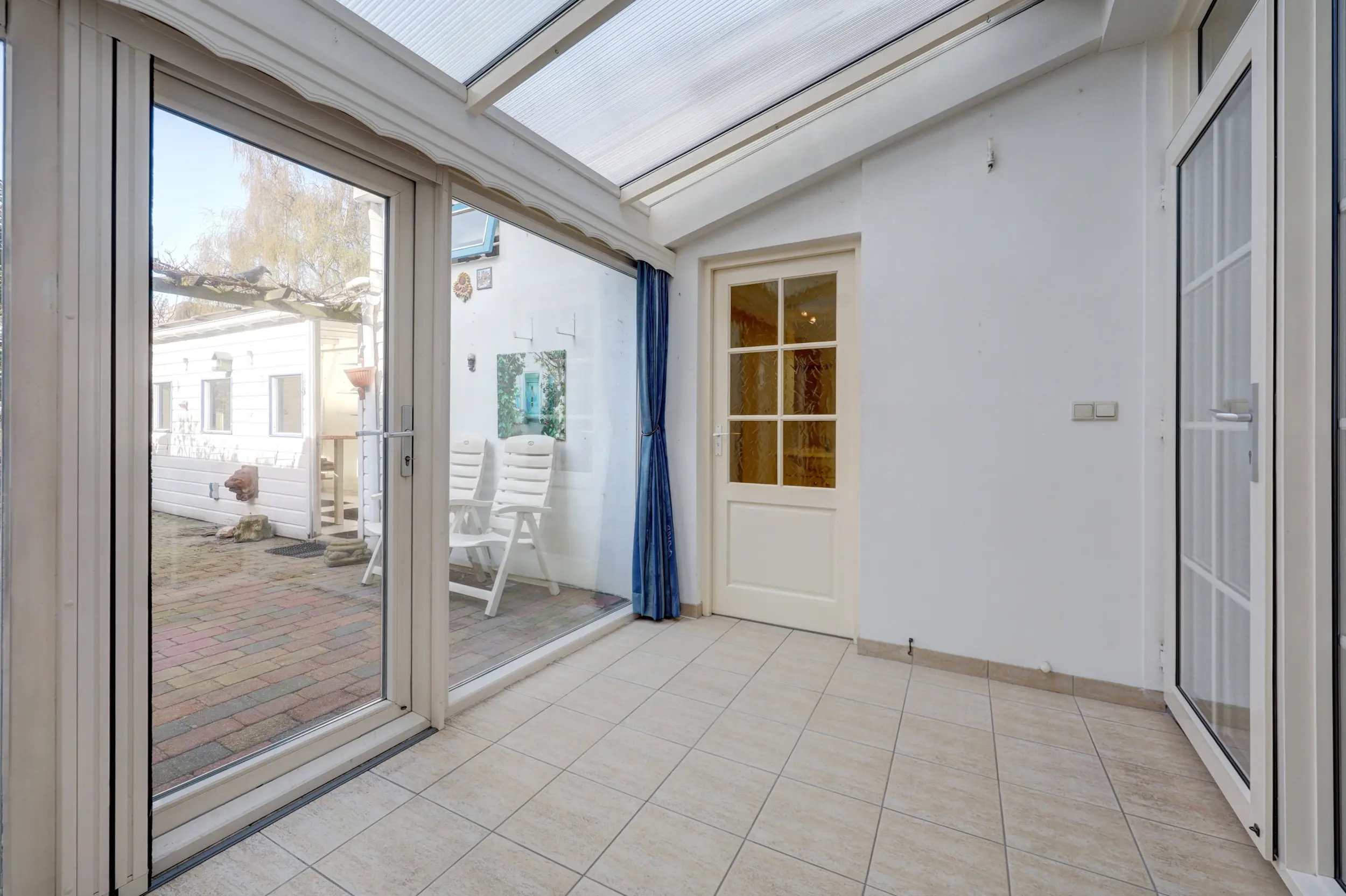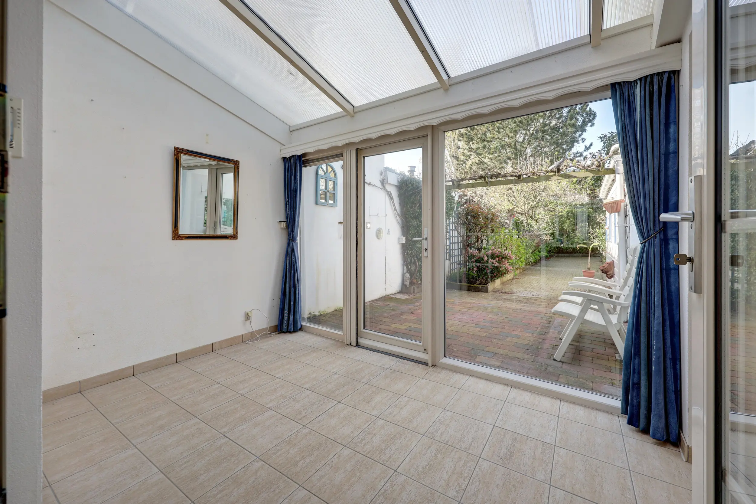 De ruime en lichte woonkamer met open keuken is voorzien van airconditioning en vloerverwarming en staat in directe verbinding met de serre. Deze serre vormt een prachtige verlenging van de woonruimte, waardoor binnen en buiten in elkaar overlopen.