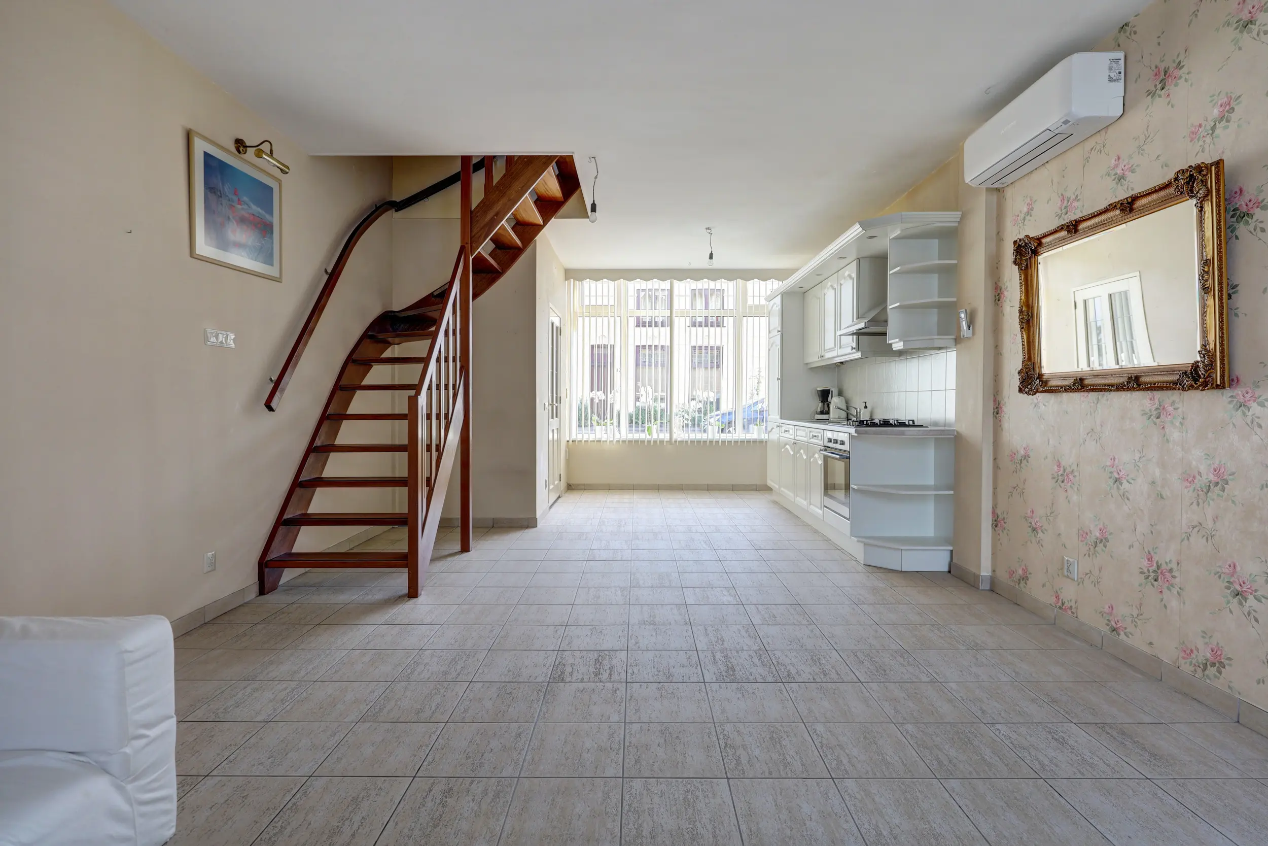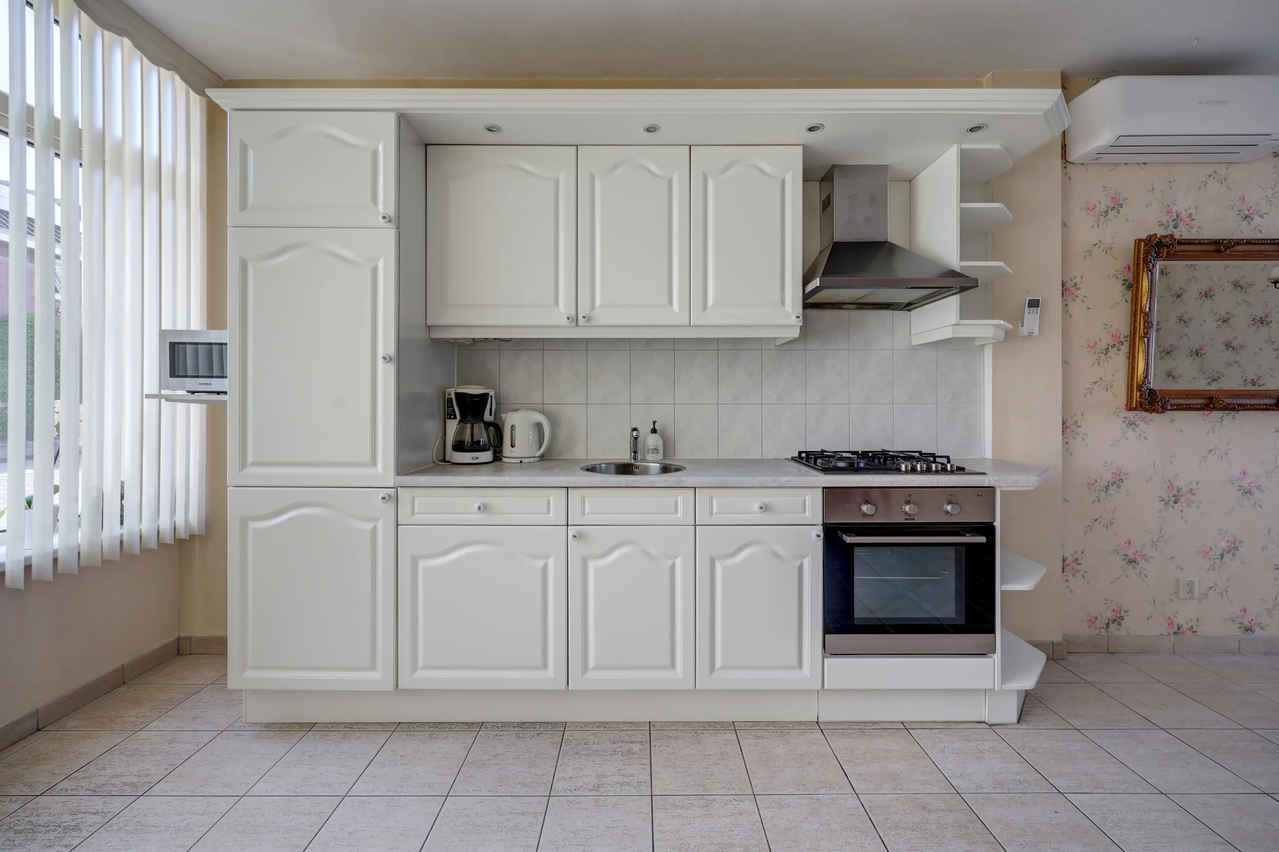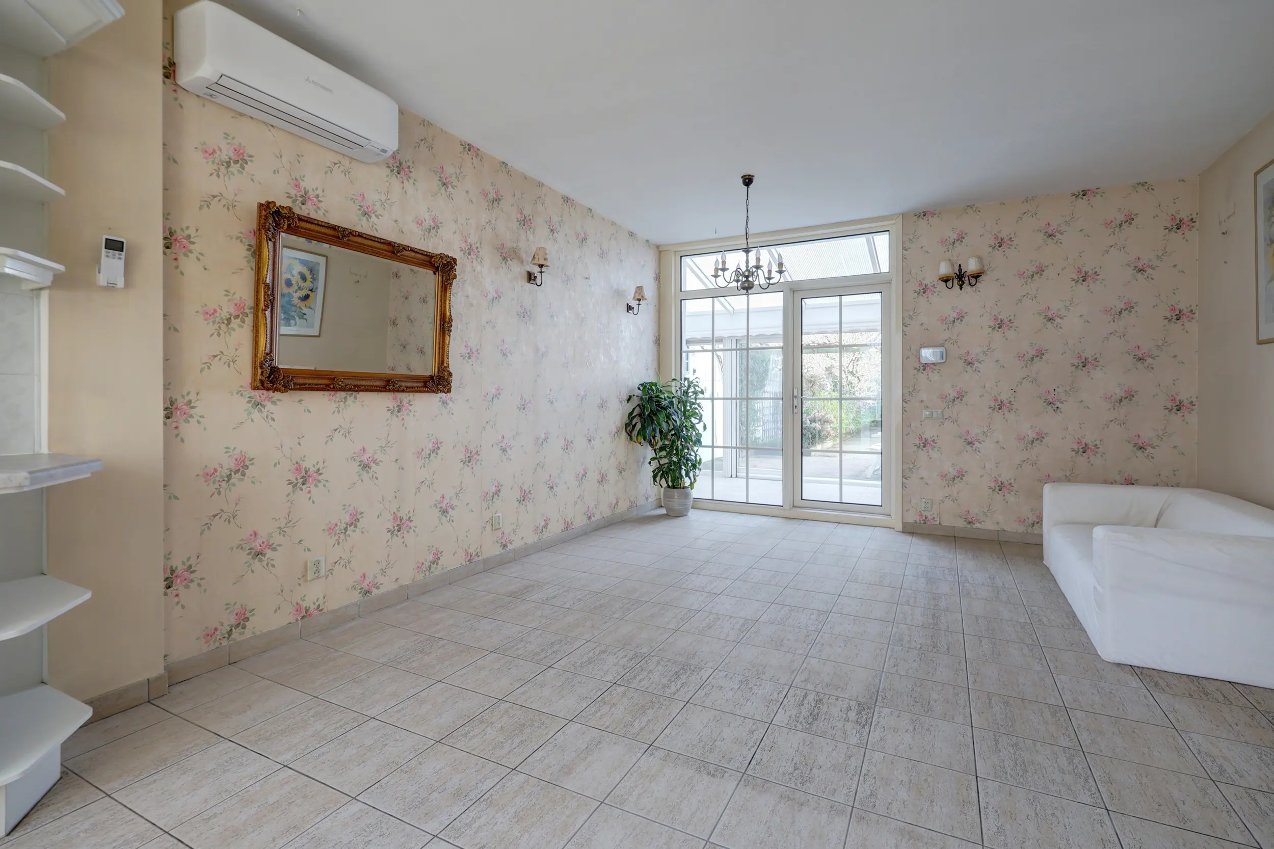 De ruime en lichte woonkamer met open keuken is voorzien van airconditioning en vloerverwarming en staat in directe verbinding met de serre. Deze serre vormt een prachtige verlenging van de woonruimte, waardoor binnen en buiten in elkaar overlopen.