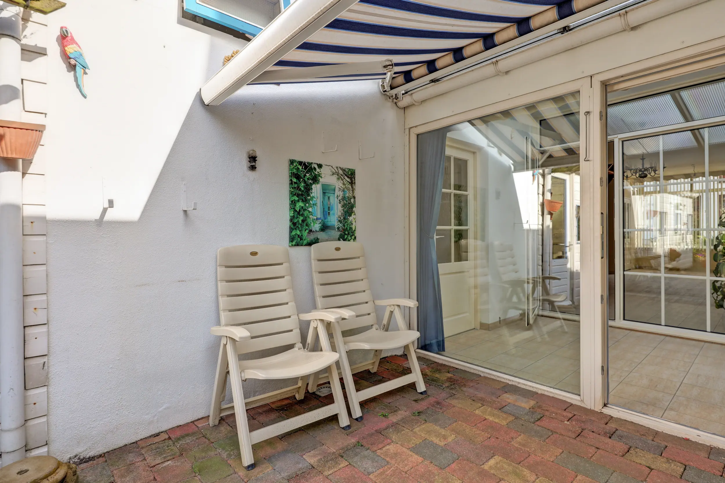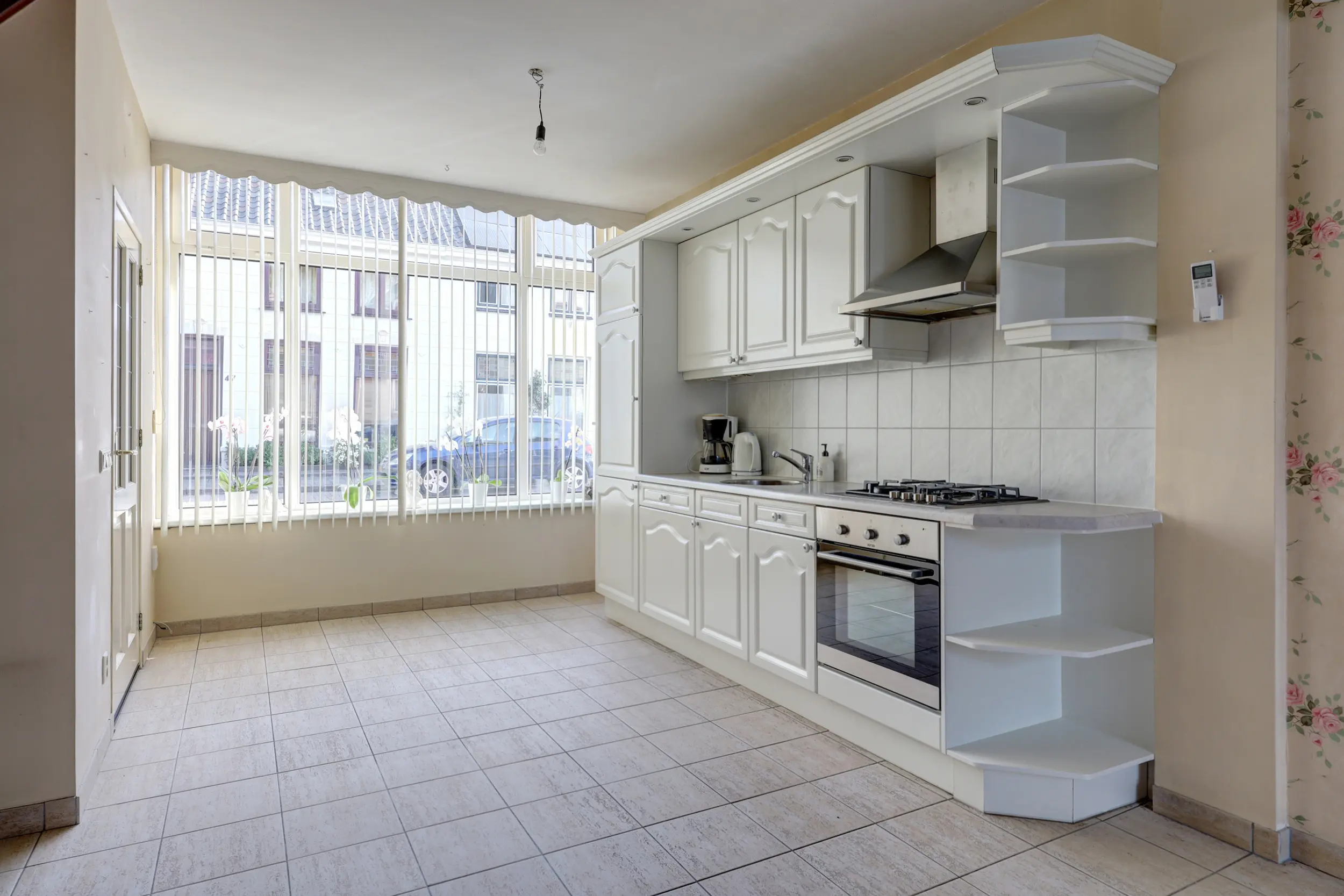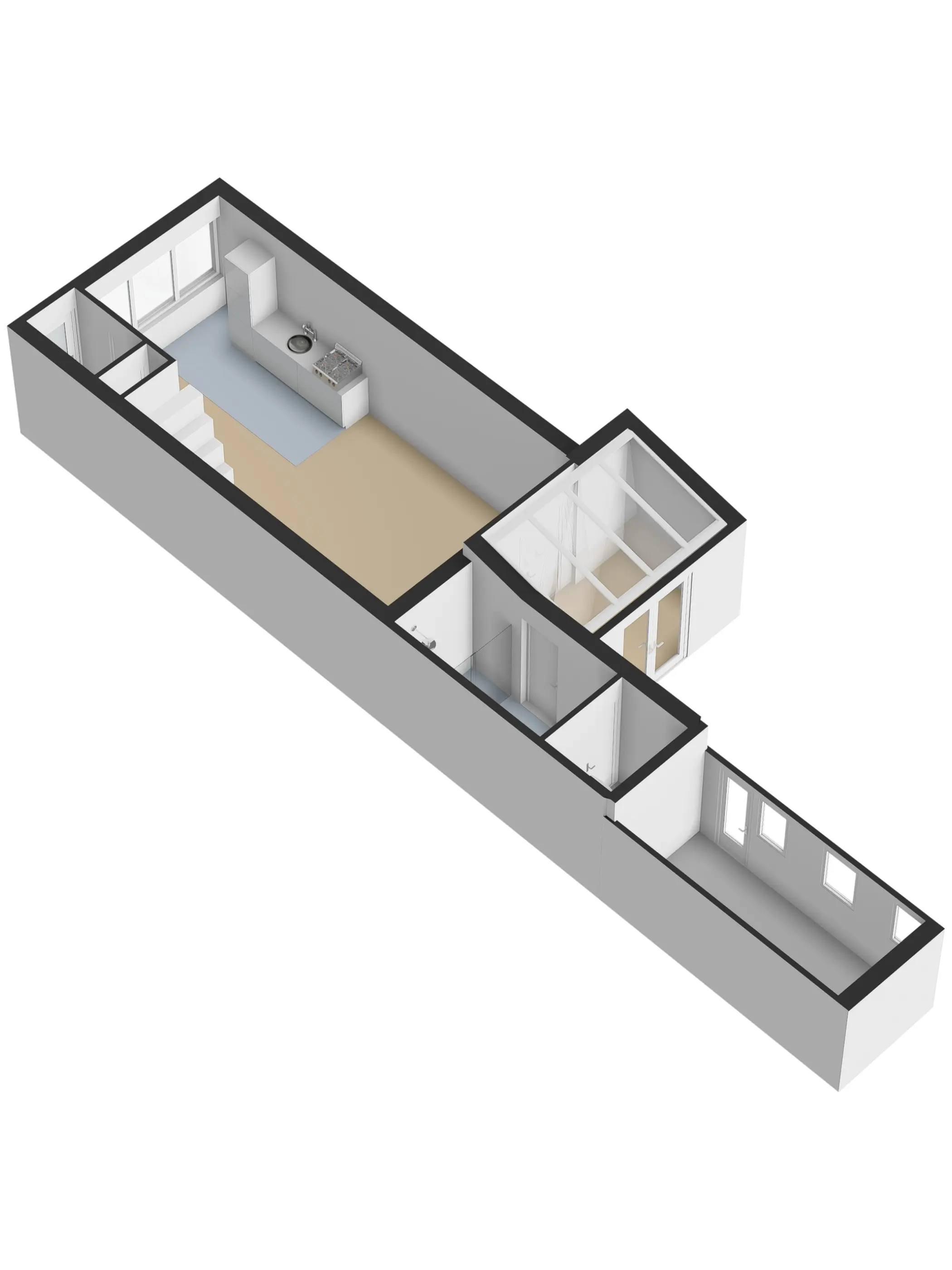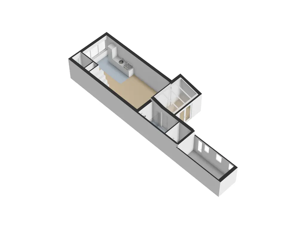 De ruime en lichte woonkamer met open keuken is voorzien van airconditioning en vloerverwarming en staat in directe verbinding met de serre. Deze serre vormt een prachtige verlenging van de woonruimte, waardoor binnen en buiten in elkaar overlopen.