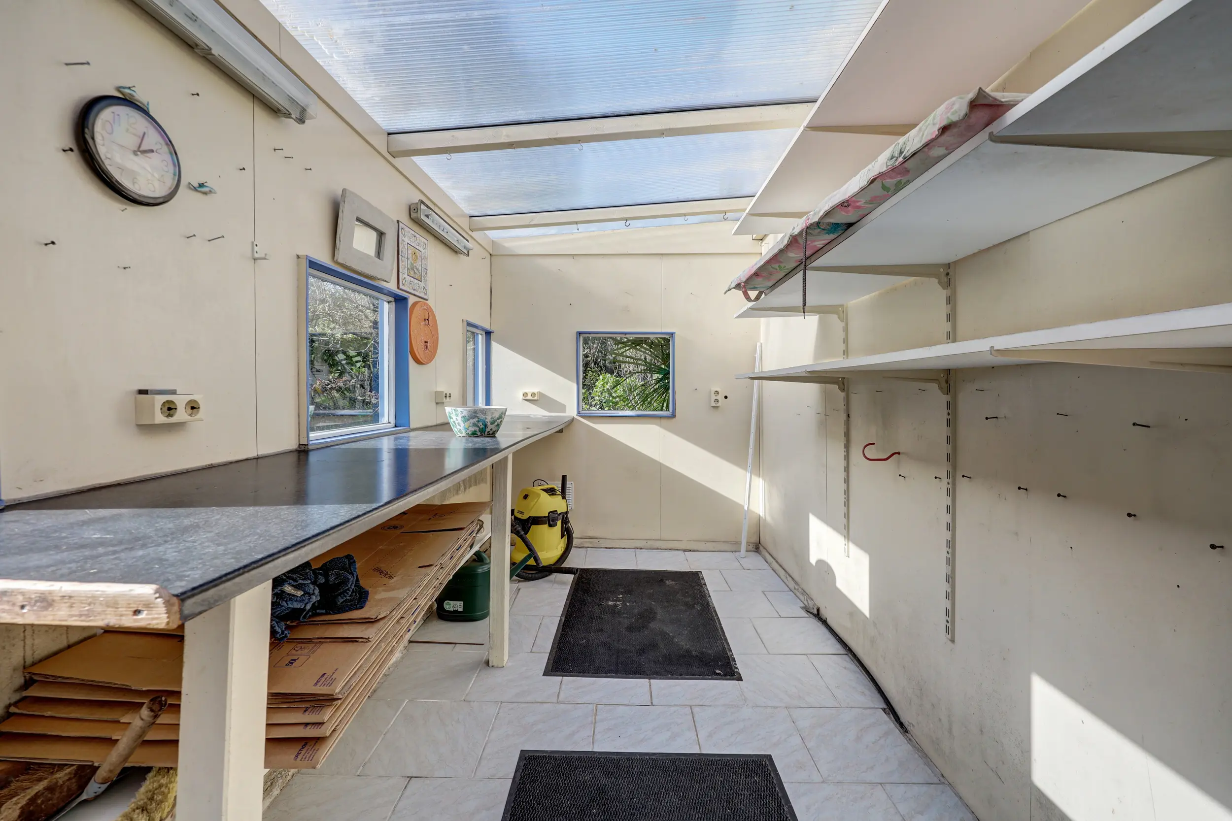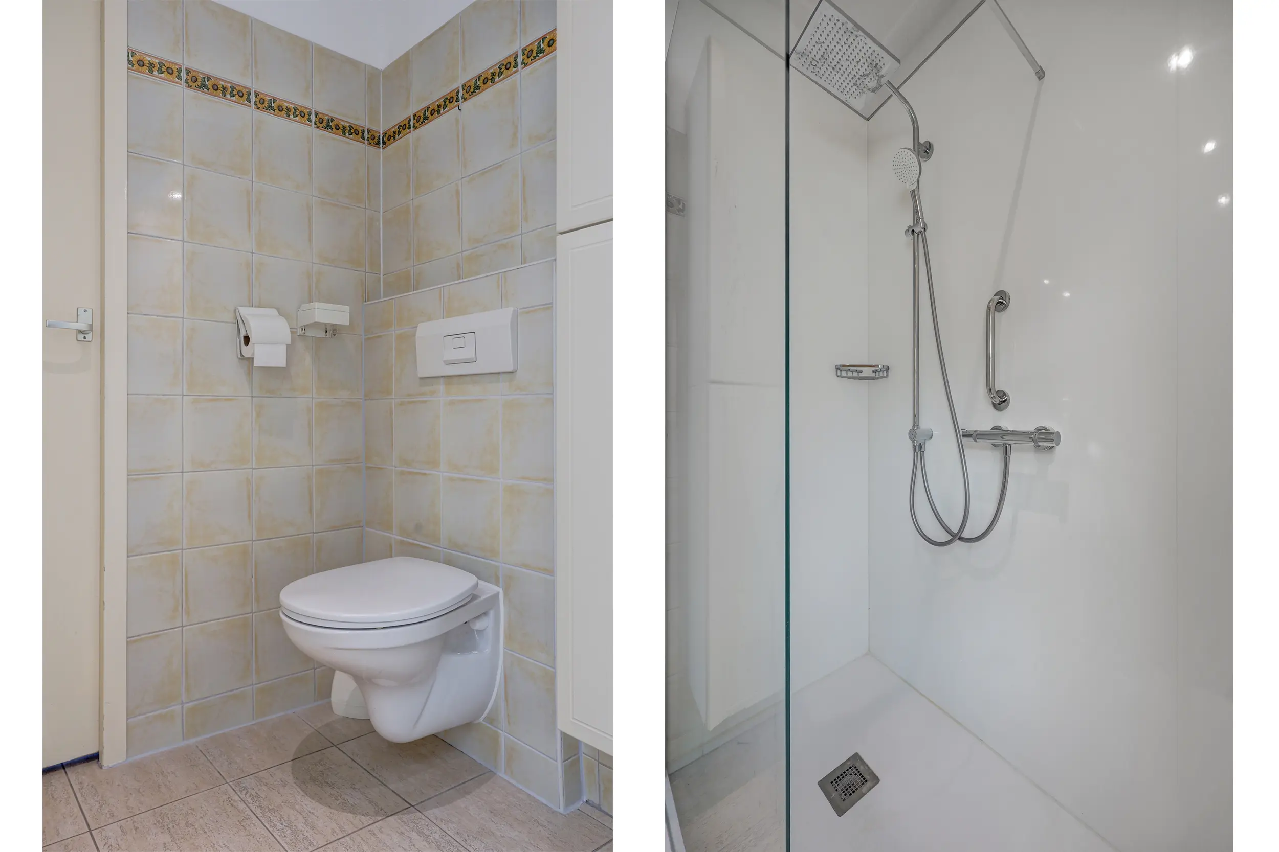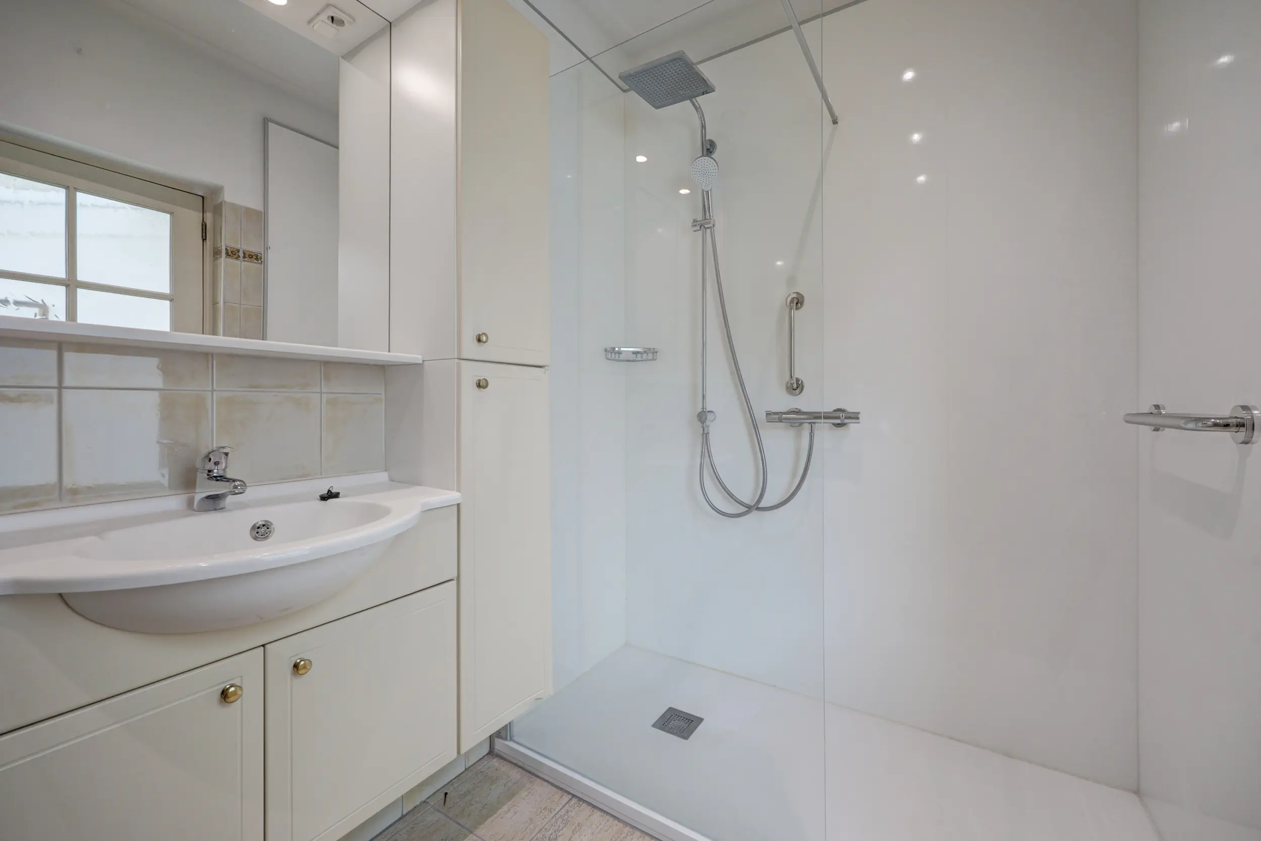 Vanuit de serre is er toegang tot de badkamer, welke is uitgerust met een douche, wastafelmeubel en toilet. Aansluitend bevindt zich de voormalige bijkeuken, thans in gebruik als praktische wasruimte met opstelling voor de cv-installatie.