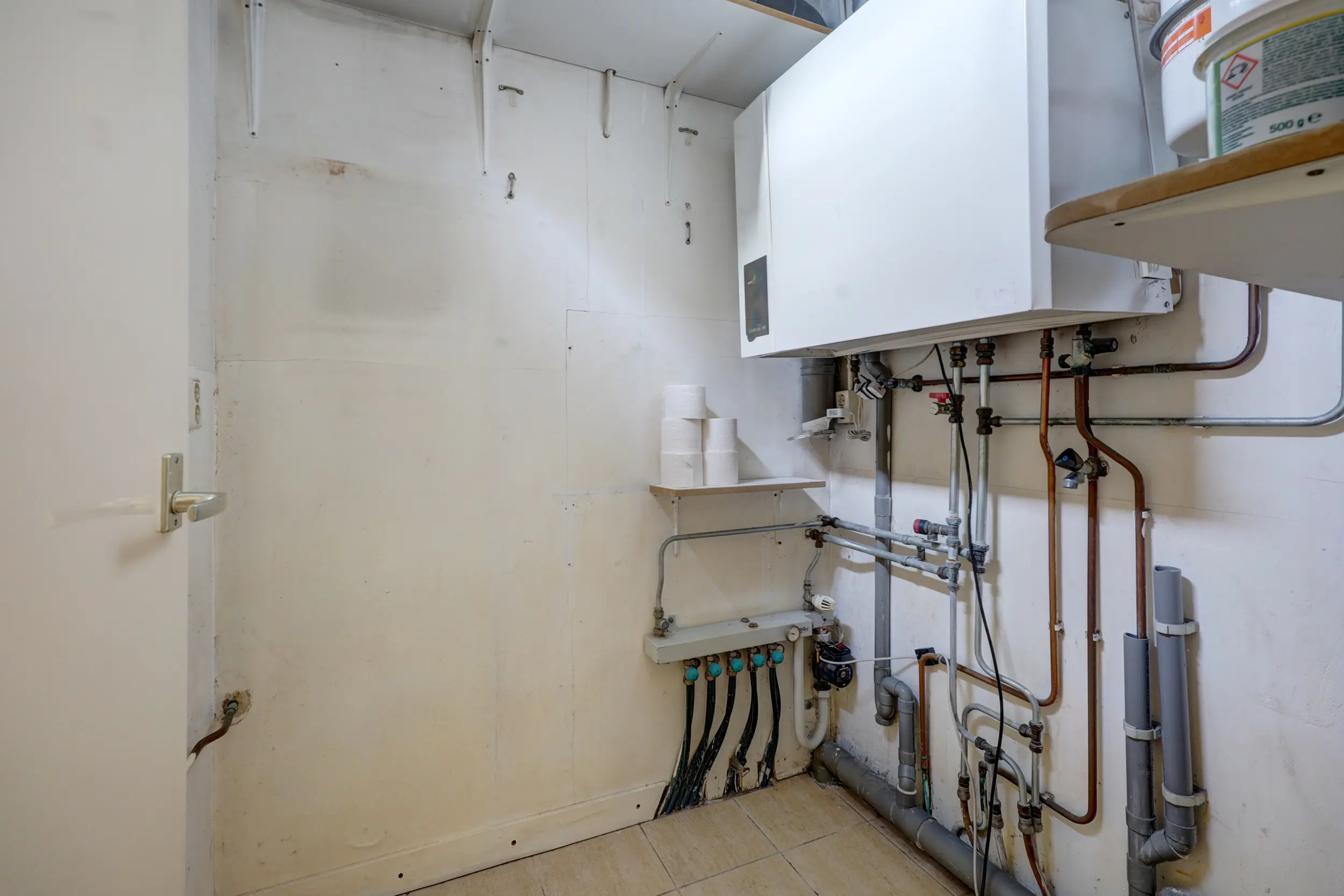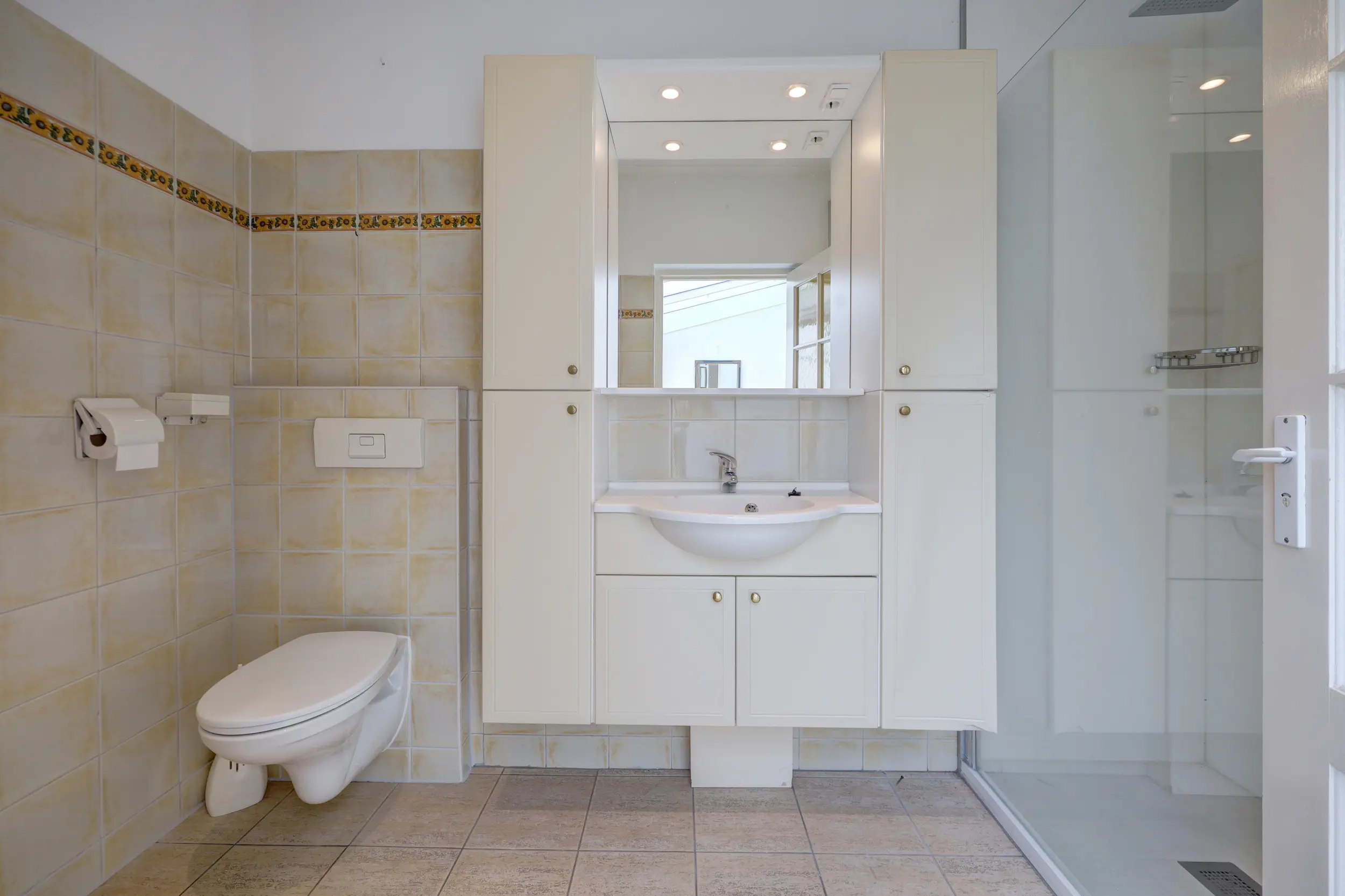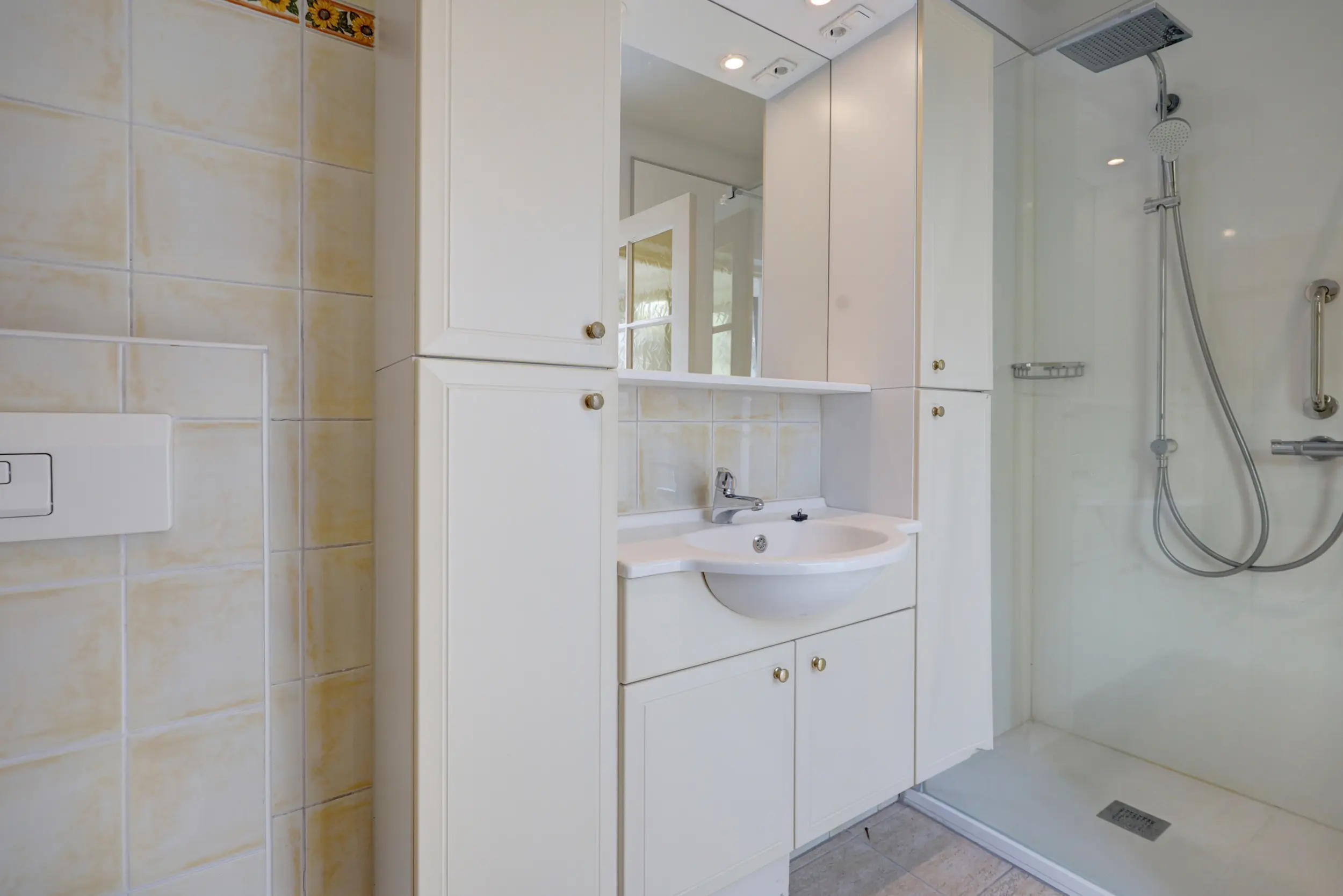 Vanuit de serre is er toegang tot de badkamer, welke is uitgerust met een douche, wastafelmeubel en toilet. Aansluitend bevindt zich de voormalige bijkeuken, thans in gebruik als praktische wasruimte met opstelling voor de cv-installatie.