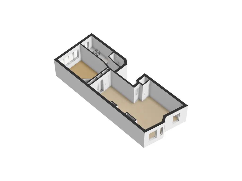 Aan de achterzijde bevindt zich een ruime slaapkamer met eveneens grote ramen, waardoor ook hier het natuurlijke licht naar binnen valt. Vanuit de hal is er toegang tot de eenvoudige keuken met dubbele spoelbak en praktische kastruimte, en de badkamer welke is voorzien van een douche, toilet en wastafel.