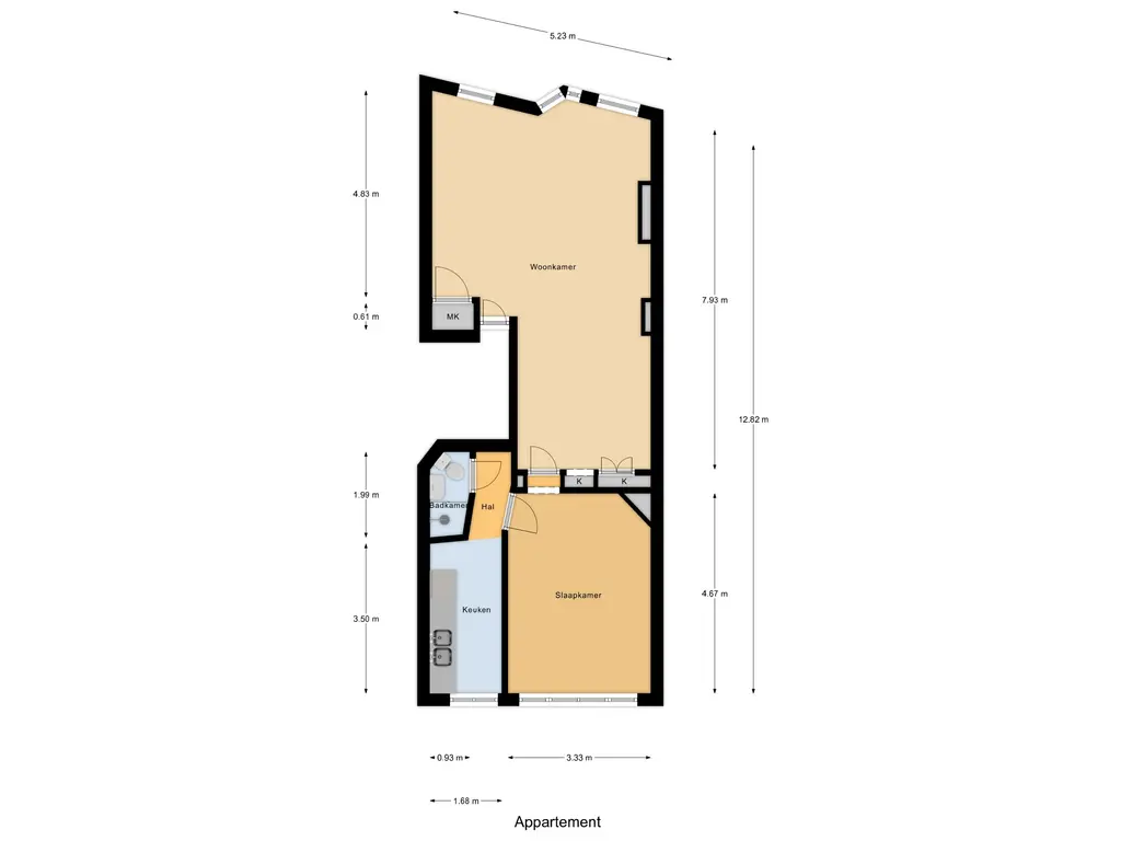 Het appartement is bereikbaar via een gezamenlijke entree met trapopgang naar de derde verdieping. Bij binnenkomst stap je direct de ruime woonkamer, die dankzij de brede raampartijen geniet van veel natuurlijk licht en uitzicht biedt over de levendige Oudedijk.