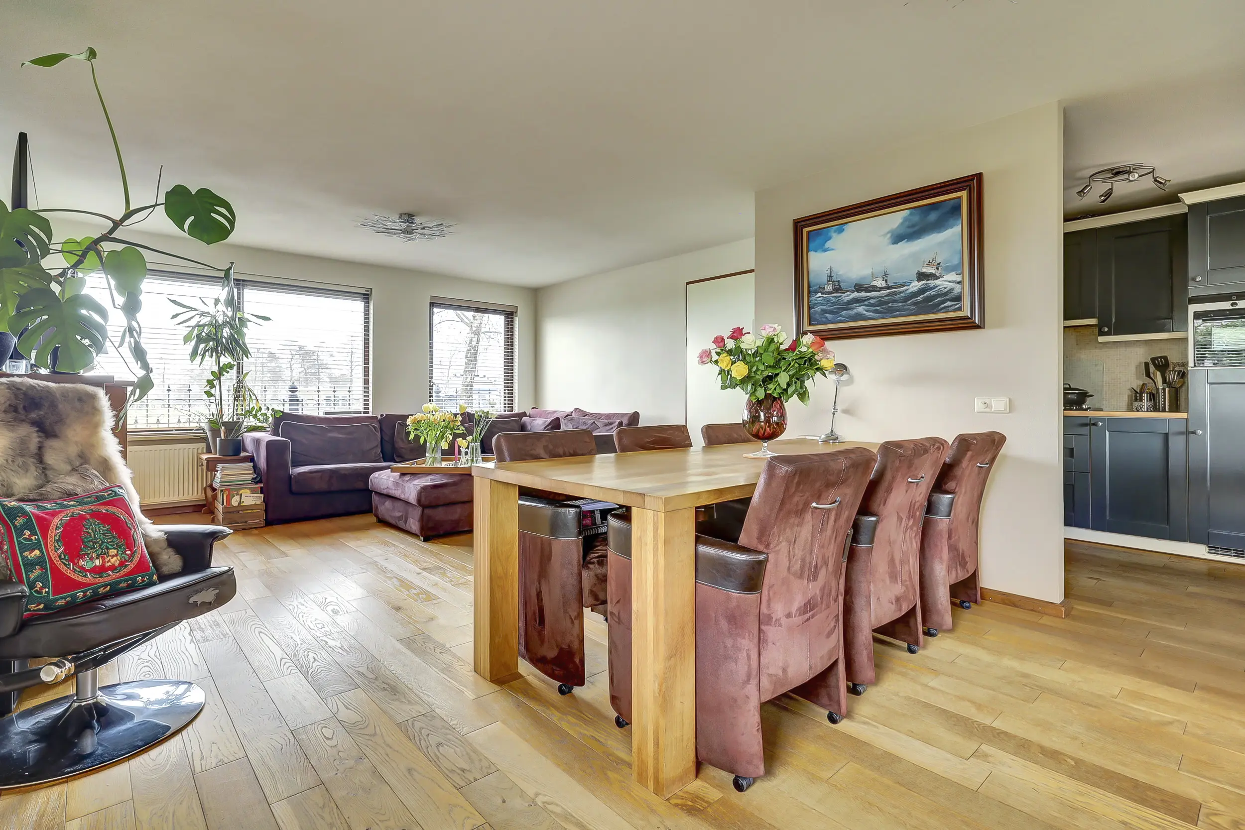 De half open keuken is voorzien van inbouwapparatuur, via een tussenhal heb je toegang tot de garage van 18,5 m2 naast de woning.