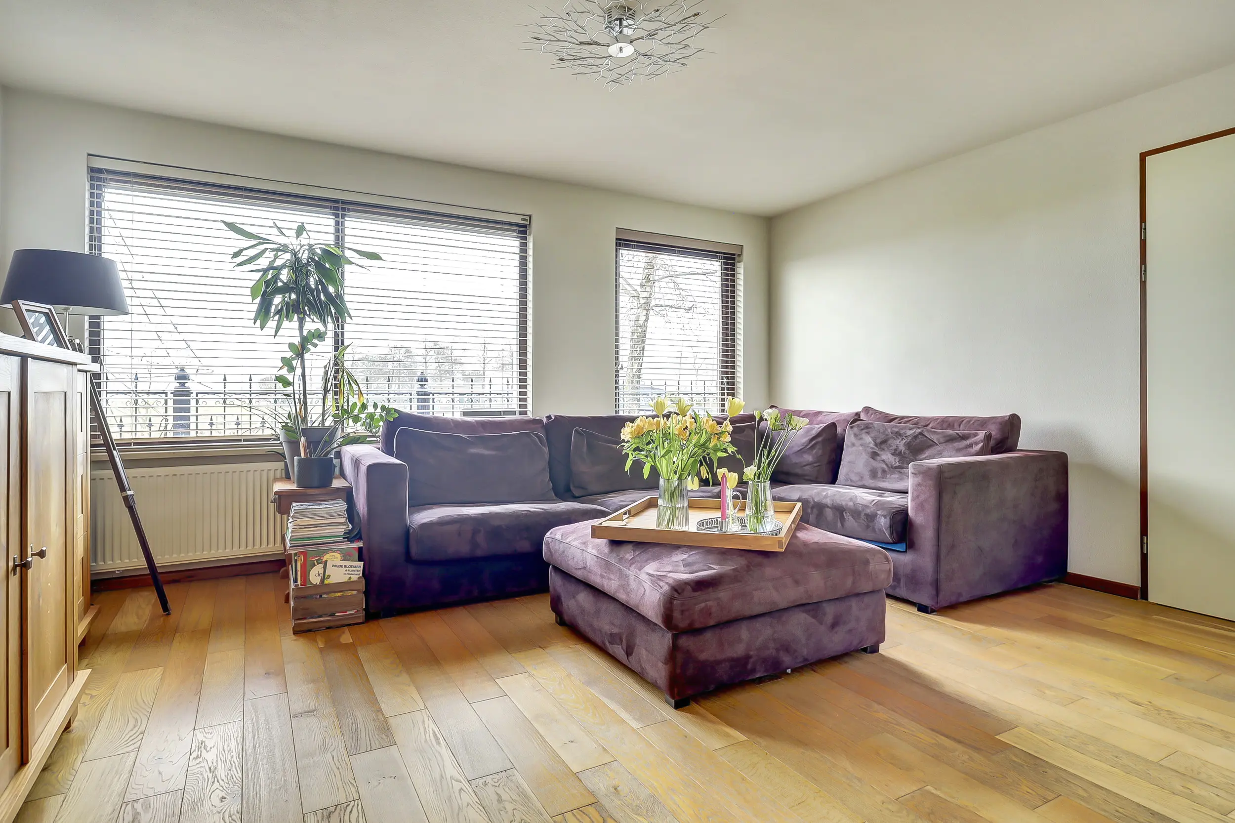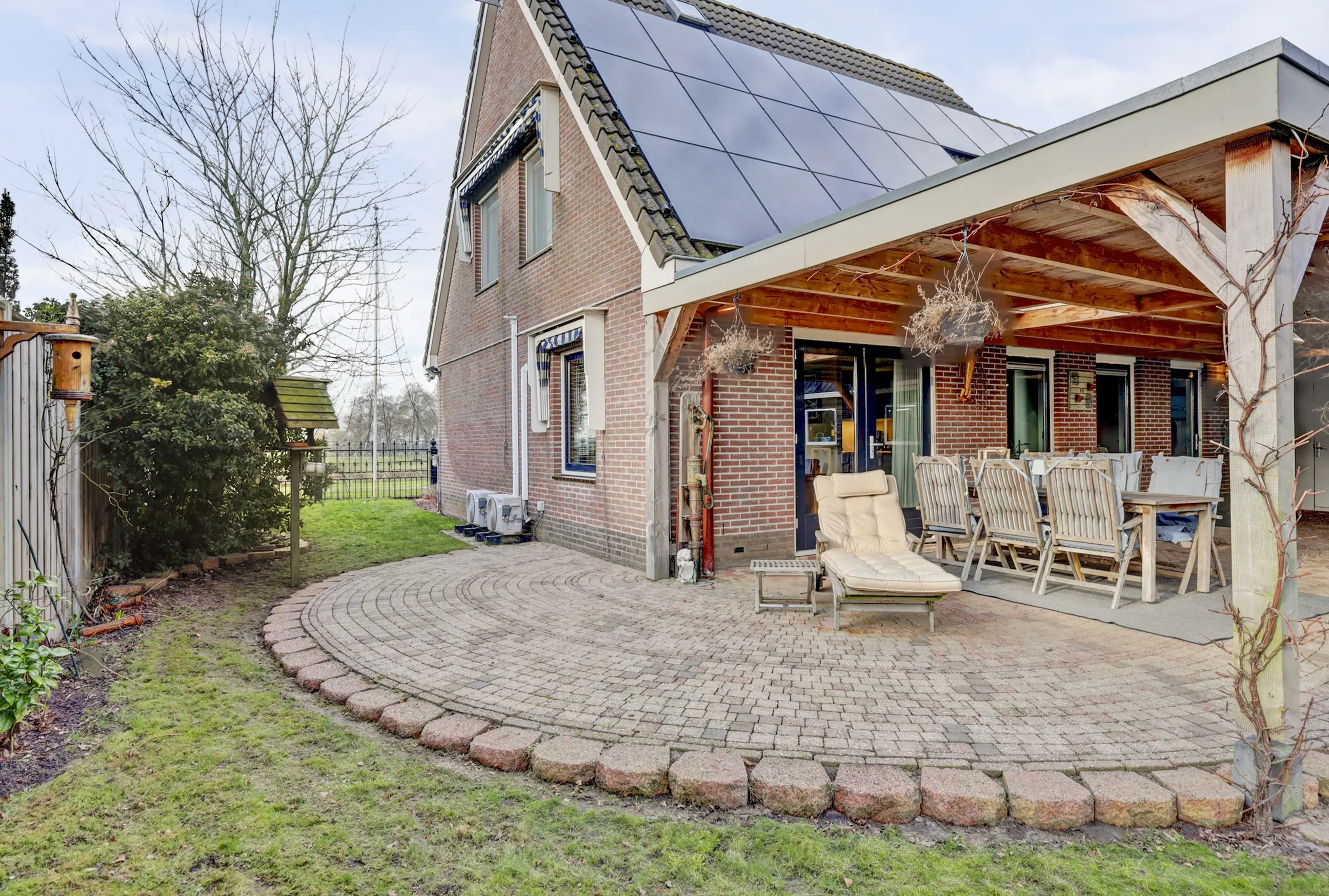 Vanuit de woonkamer heb je schitterend zicht op je eigen stuk grond van 2.720m2 aan de voorzijde, de openslaande deuren aan de achterzijde geven toegang tot de grote tuin met overkapping.