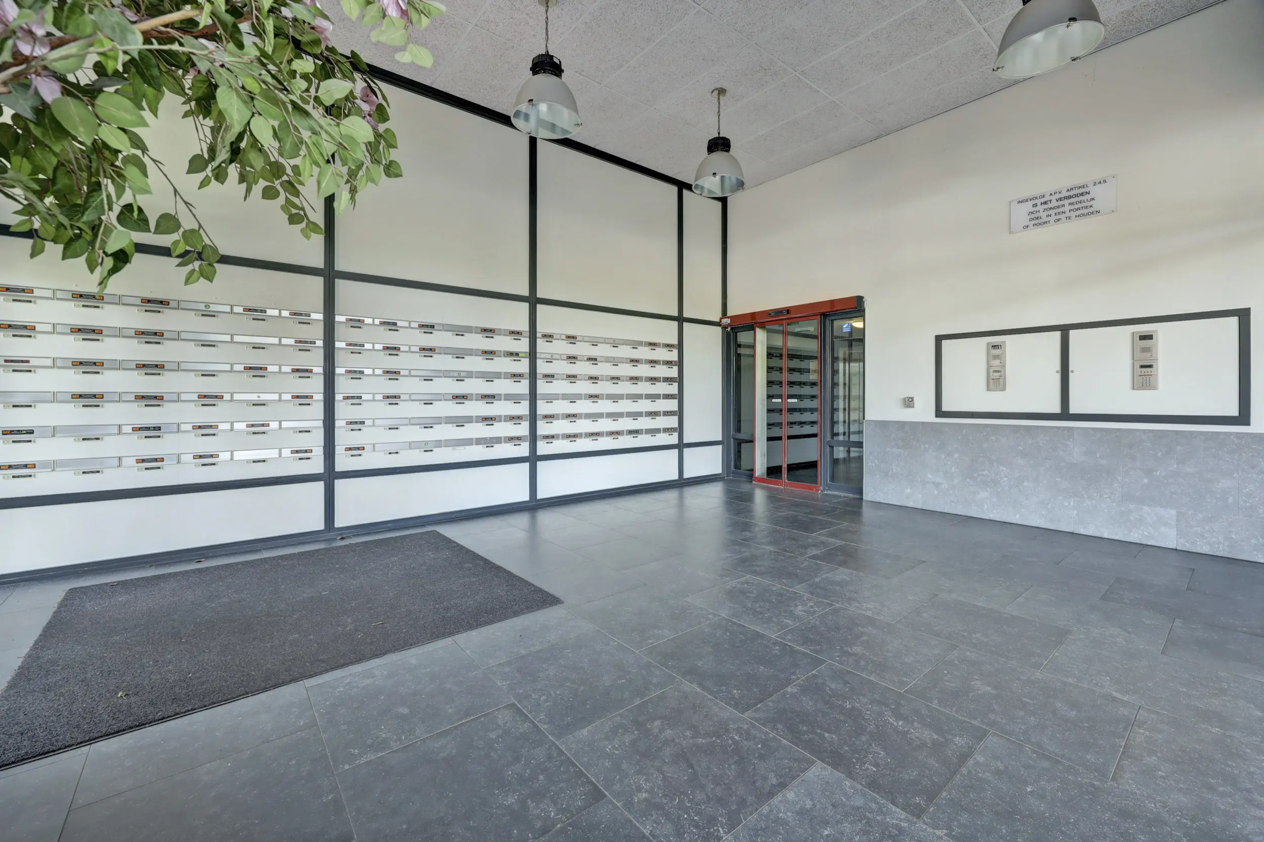 Centrale entree met brievenbussen en bellentableau (videofooninstallatie), afgesloten hal met trappenhuis en twee liften.