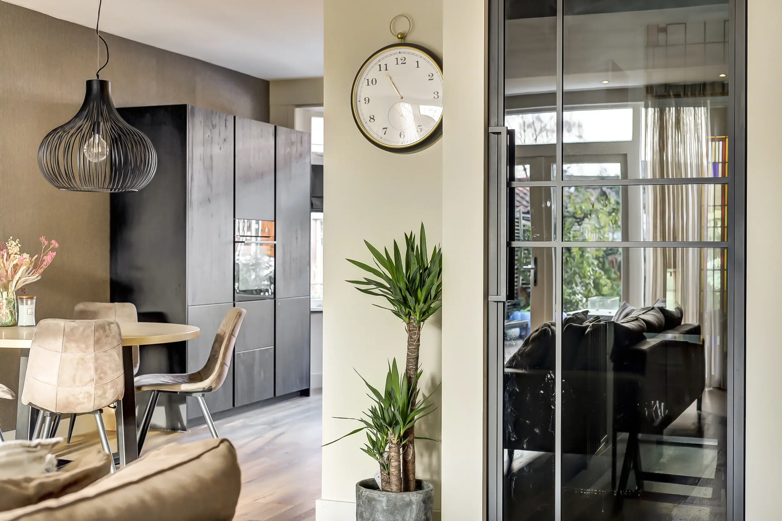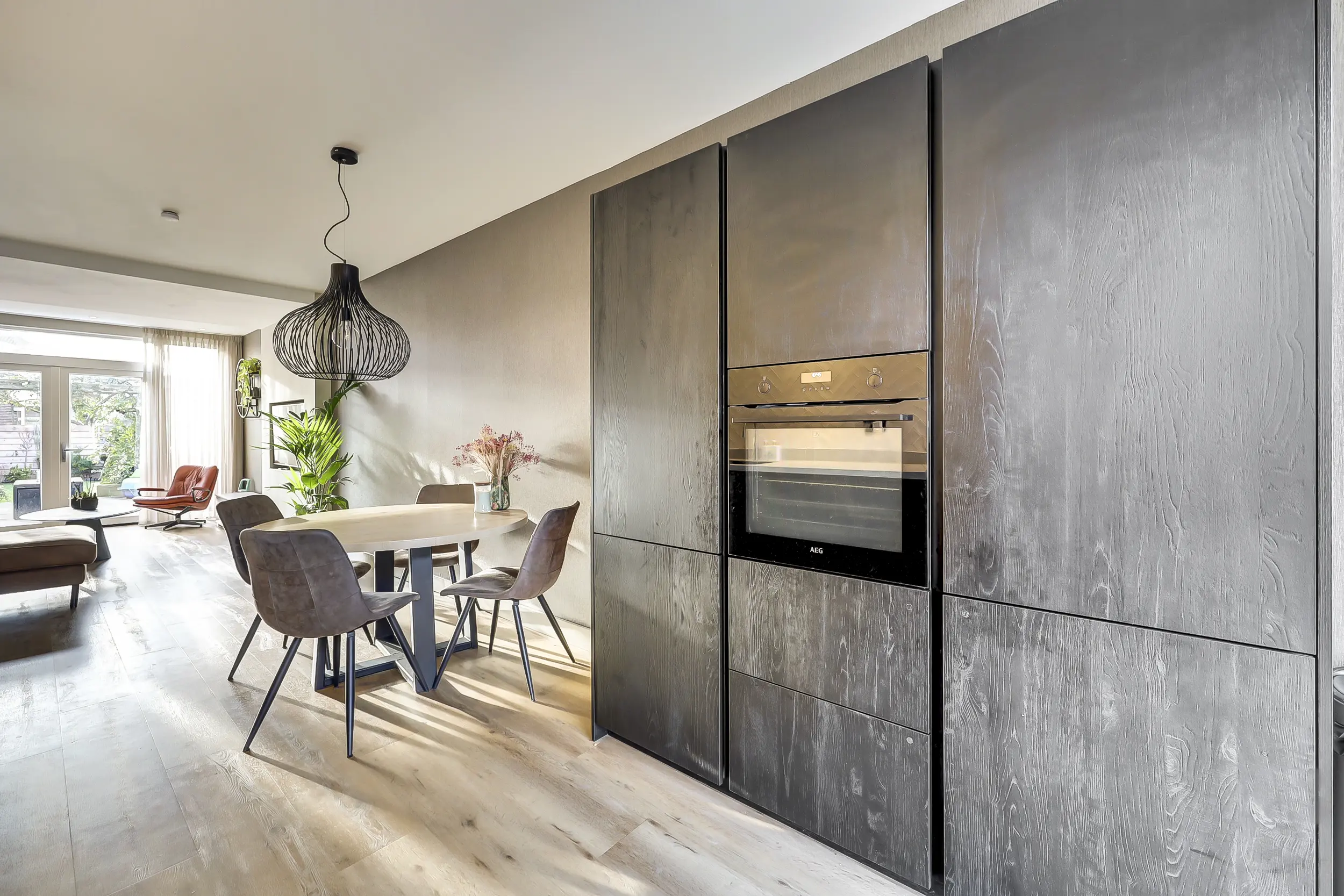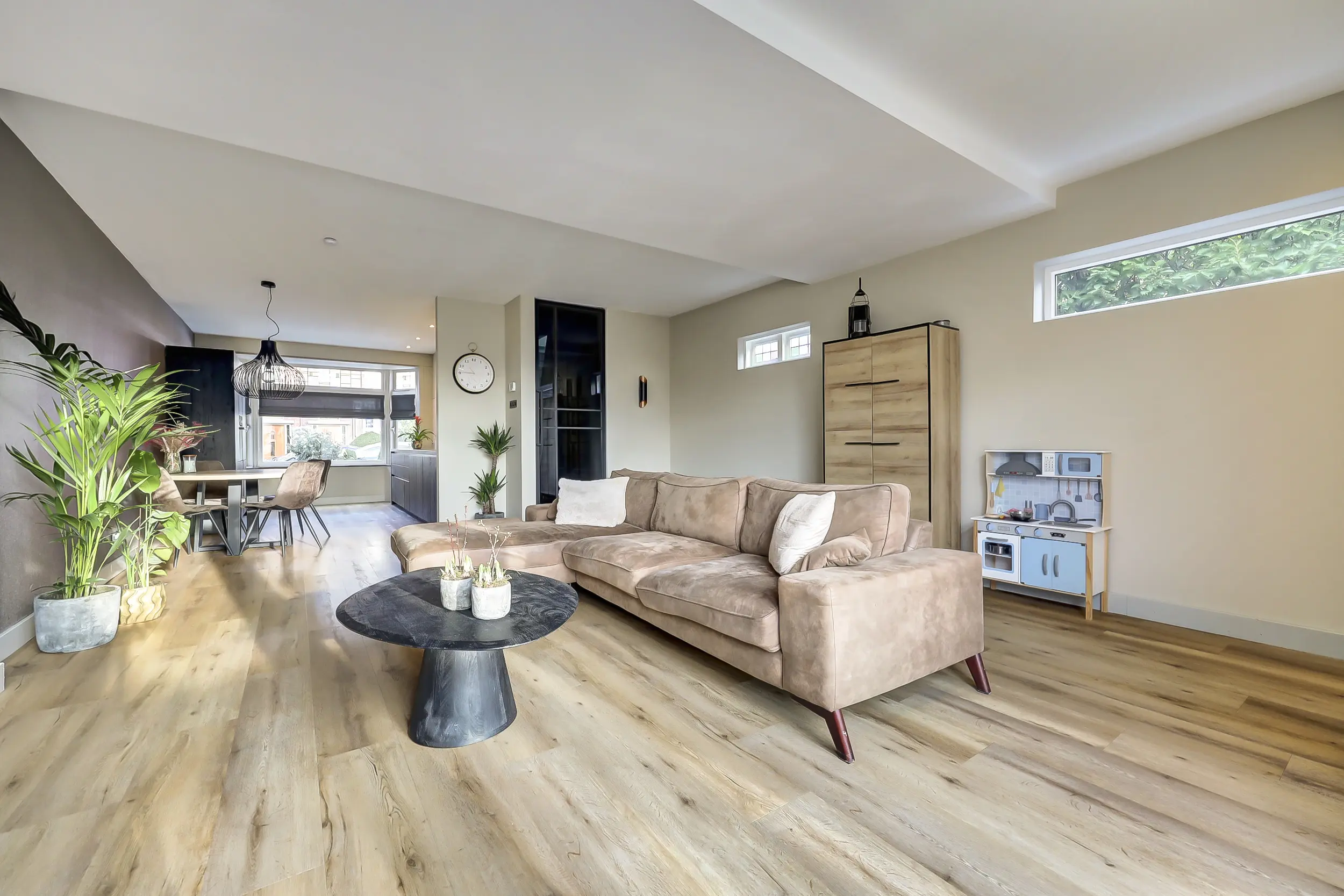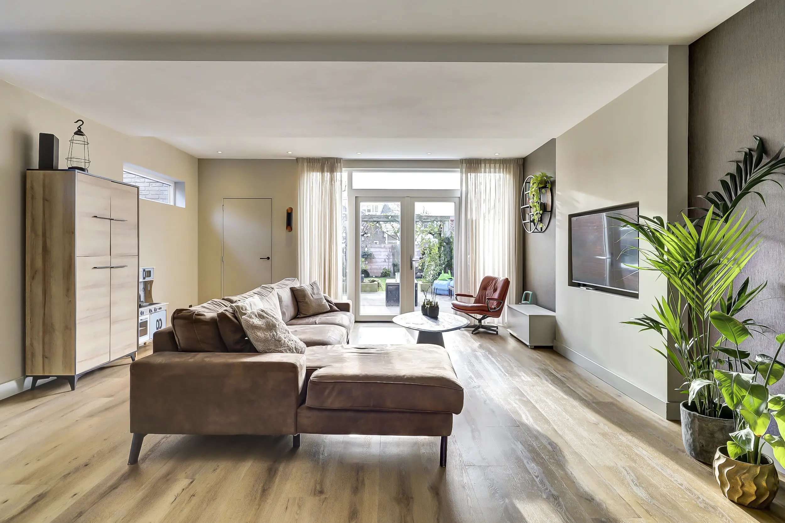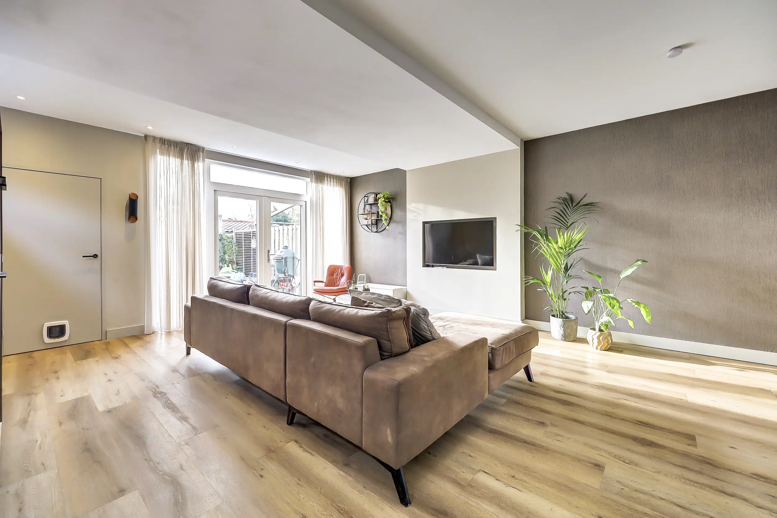 De woonkamer en keuken zijn nagenoeg volledig voorzien van vloerverwarming en staan via openslaande deuren in direct contact met de zonnige achtertuin. Hierdoor vloeien binnen en buiten moeiteloos in elkaar over en ontstaat een heerlijke leefruimte, ideaal voor zowel dagelijks wonen als het ontvangen van gasten. Door de uitbouw van de woonkamer is de garage nu intern bereikbaar.