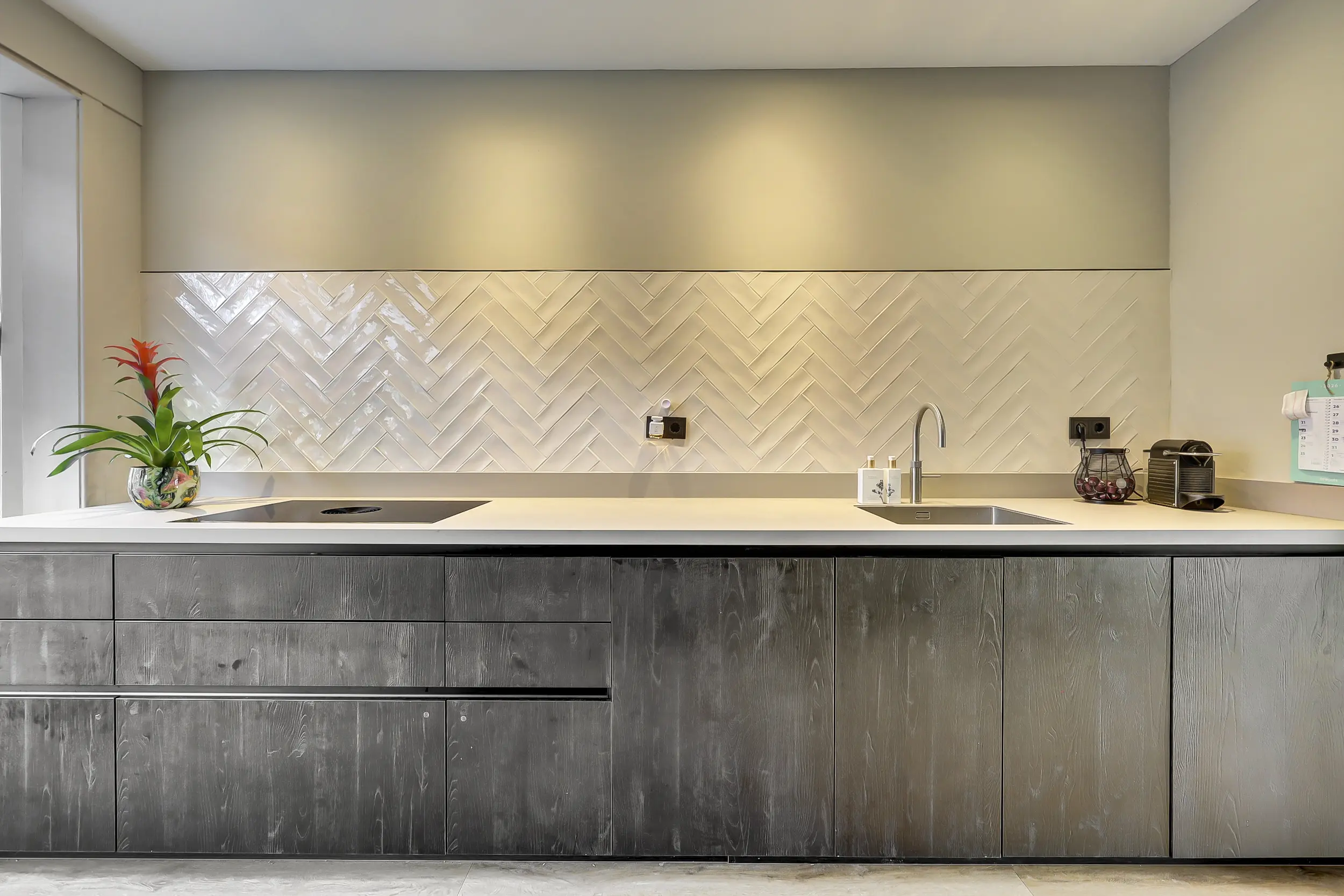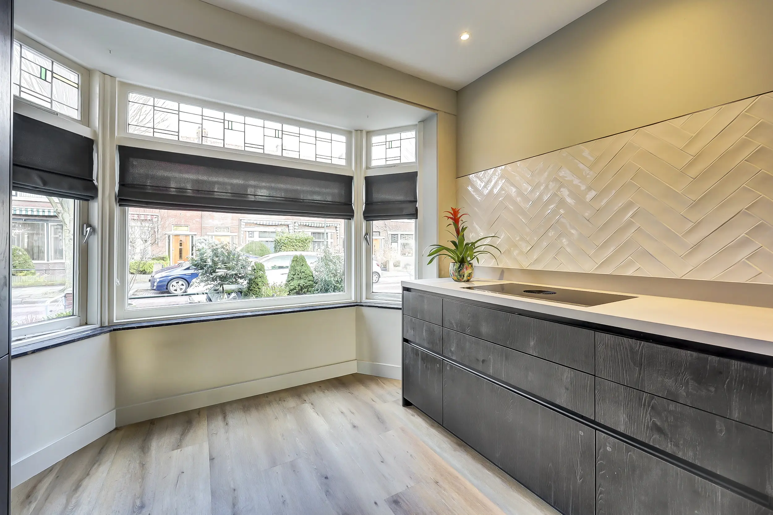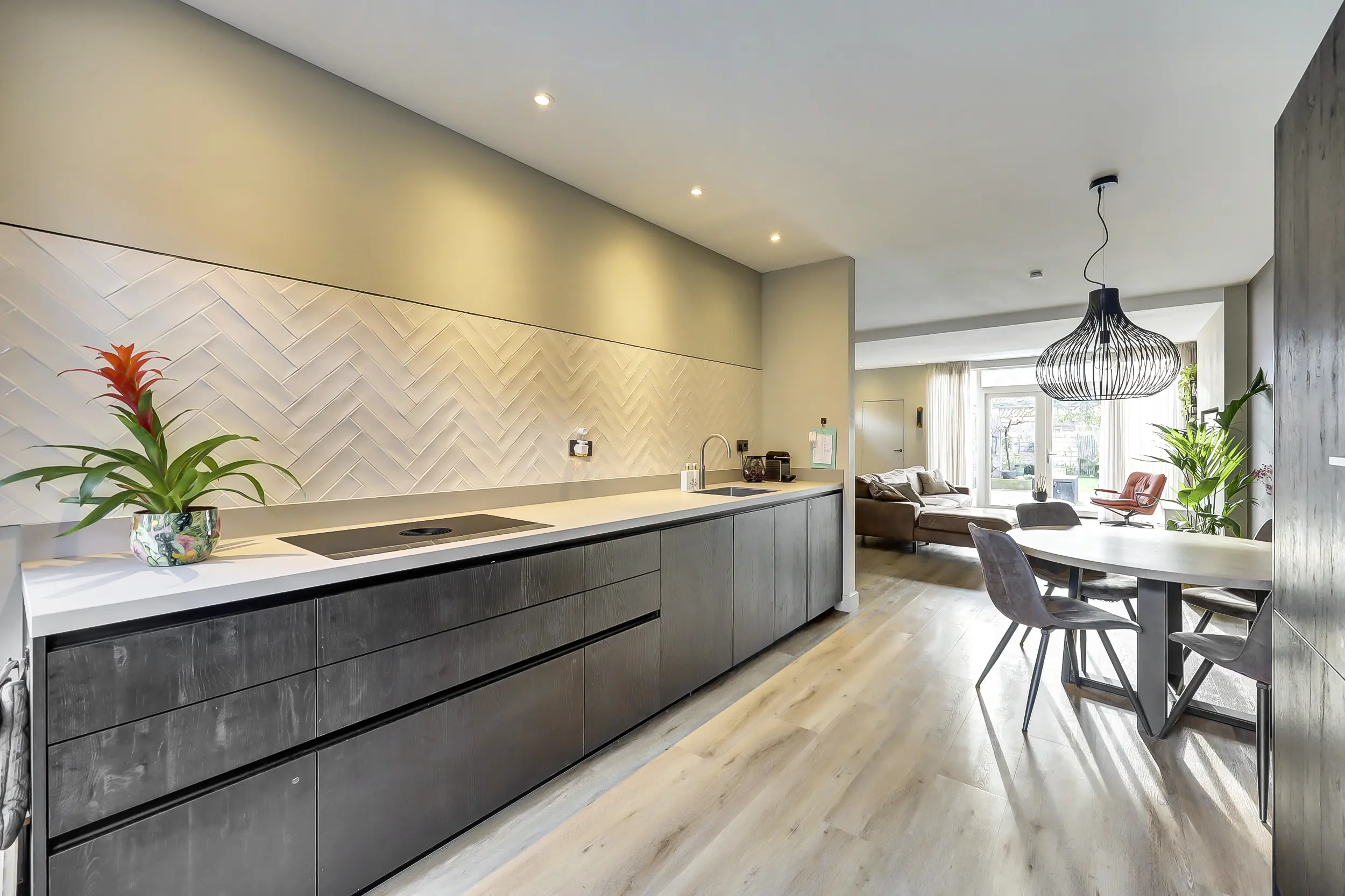 Via de voortuin betreedt u de woning in het tochtportaal met originele granieten vloer, waarna u doorloopt naar de hal met toilet, meterkast, trapkast/kelderkast en trapopgang. Vanuit de hal bereikt u de ruime, uitgebouwde woonkamer met open keuken. Deze leefruimte is strak en modern uitgevoerd en voorzien van alle denkbare gemakken. De keuken beschikt over hoogwaardige apparatuur, waaronder een inductiekookplaat met geïntegreerde afzuiging (Bora), Quooker met warm-, koud- en bruiswaterfunctie, oven, koel-vriescombinatie en volop bergruimte. Het extra diepe werkblad van 70 cm maakt het geheel compleet.