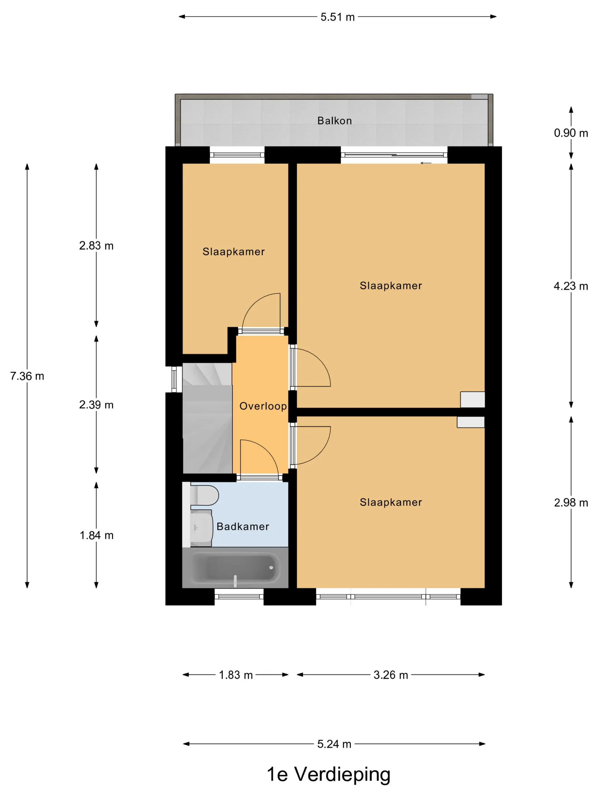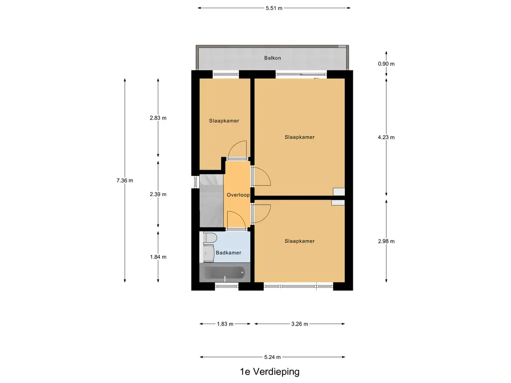 Op de eerste verdieping zorgt de overloop met zijraam en glas-in-lood voor een prettige lichtinval. Hier bevinden zich drie slaapkamers. De ruime hoofdslaapkamer aan de achterzijde beschikt over een schuifpui naar het balkon. Daarnaast is er een royale slaapkamer aan de voorzijde en een derde slaapkamer aan de achterzijde. De badkamer is simpel uitgevoerd met ligbad, wastafel en toilet.