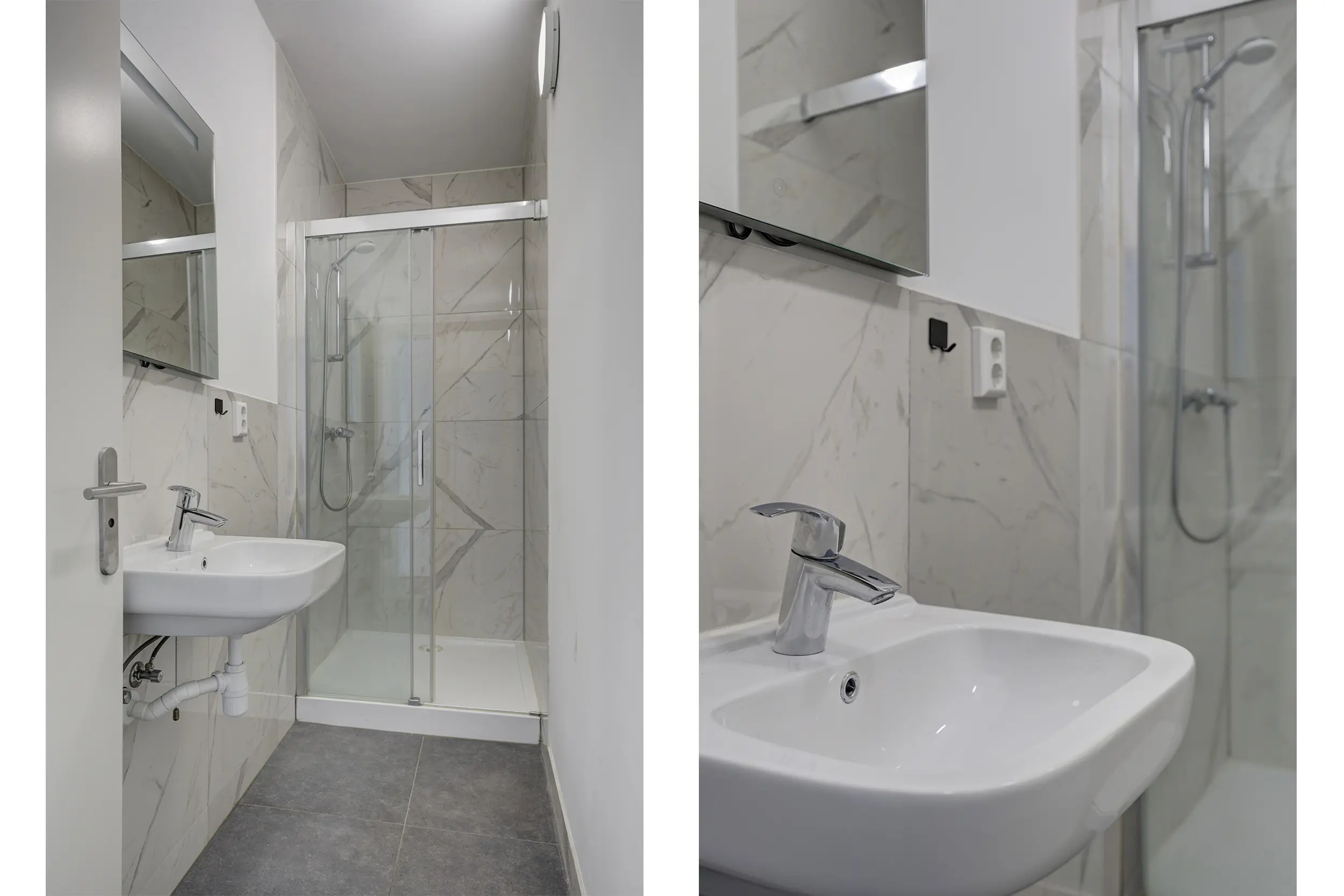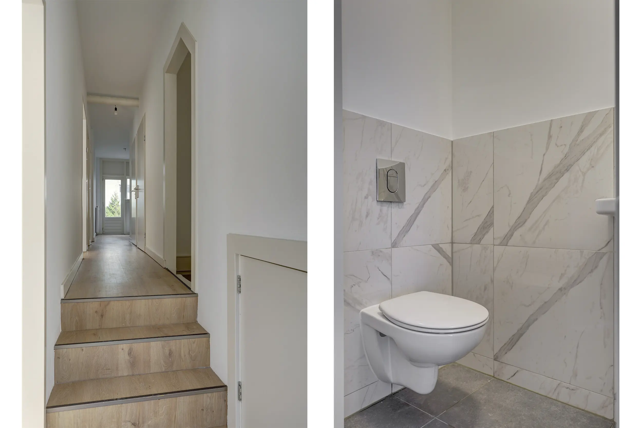 Vanuit de hal bereikt u de badkamer, voorzien van een douche en wastafel. Daarnaast is er een separaat toilet met fonteintje aanwezig. Via een vaste trap in de hal heeft u toegang tot het souterrain.