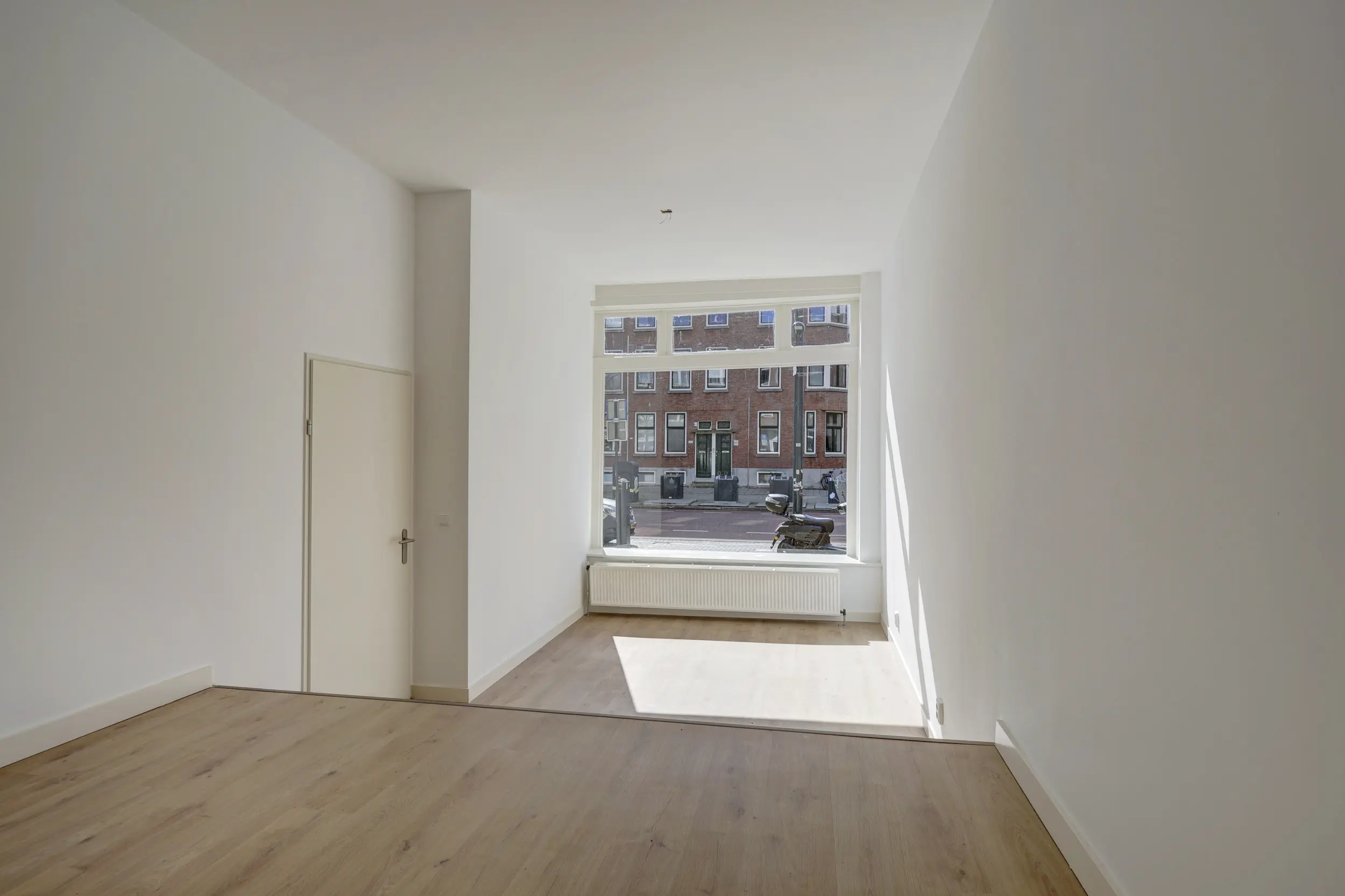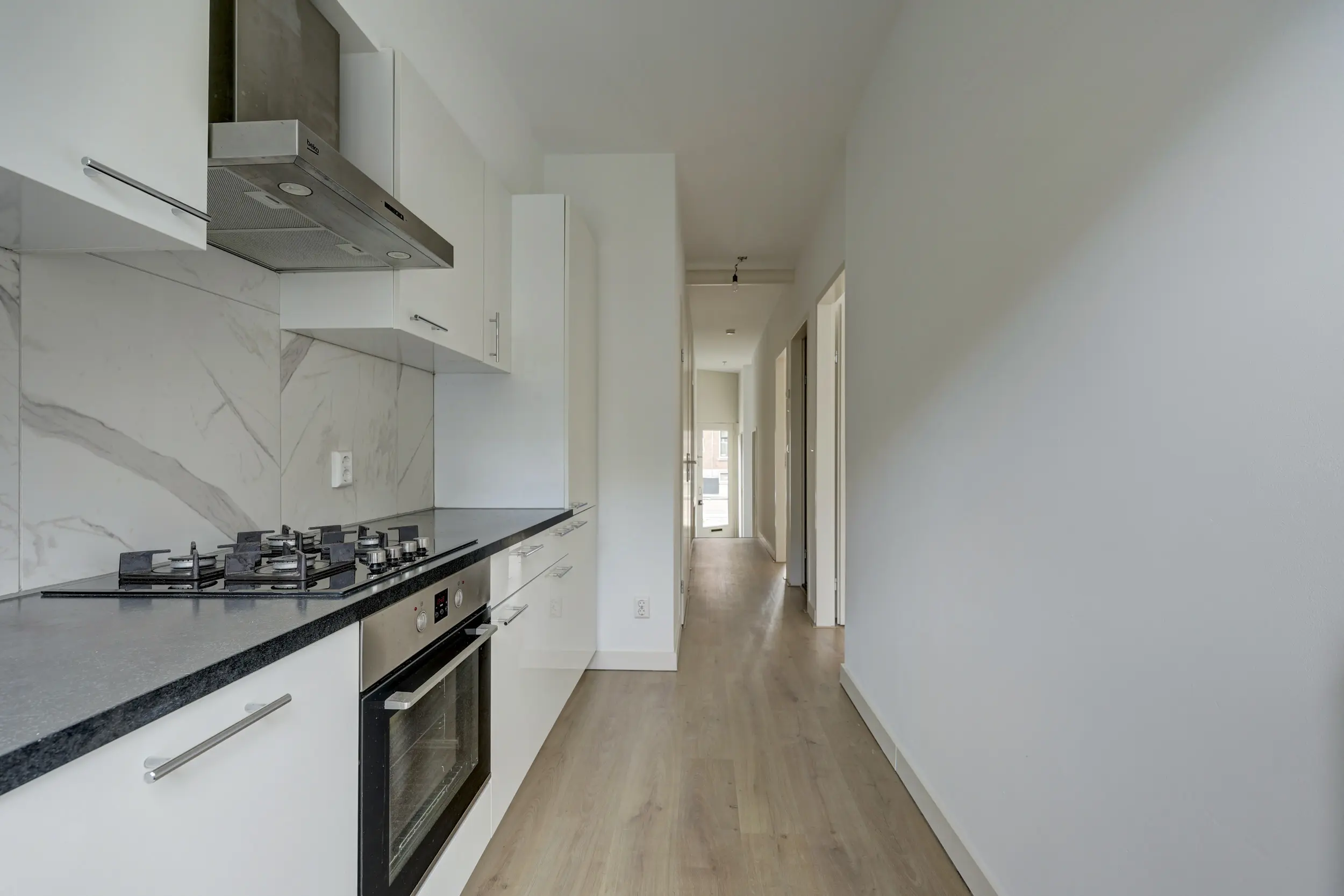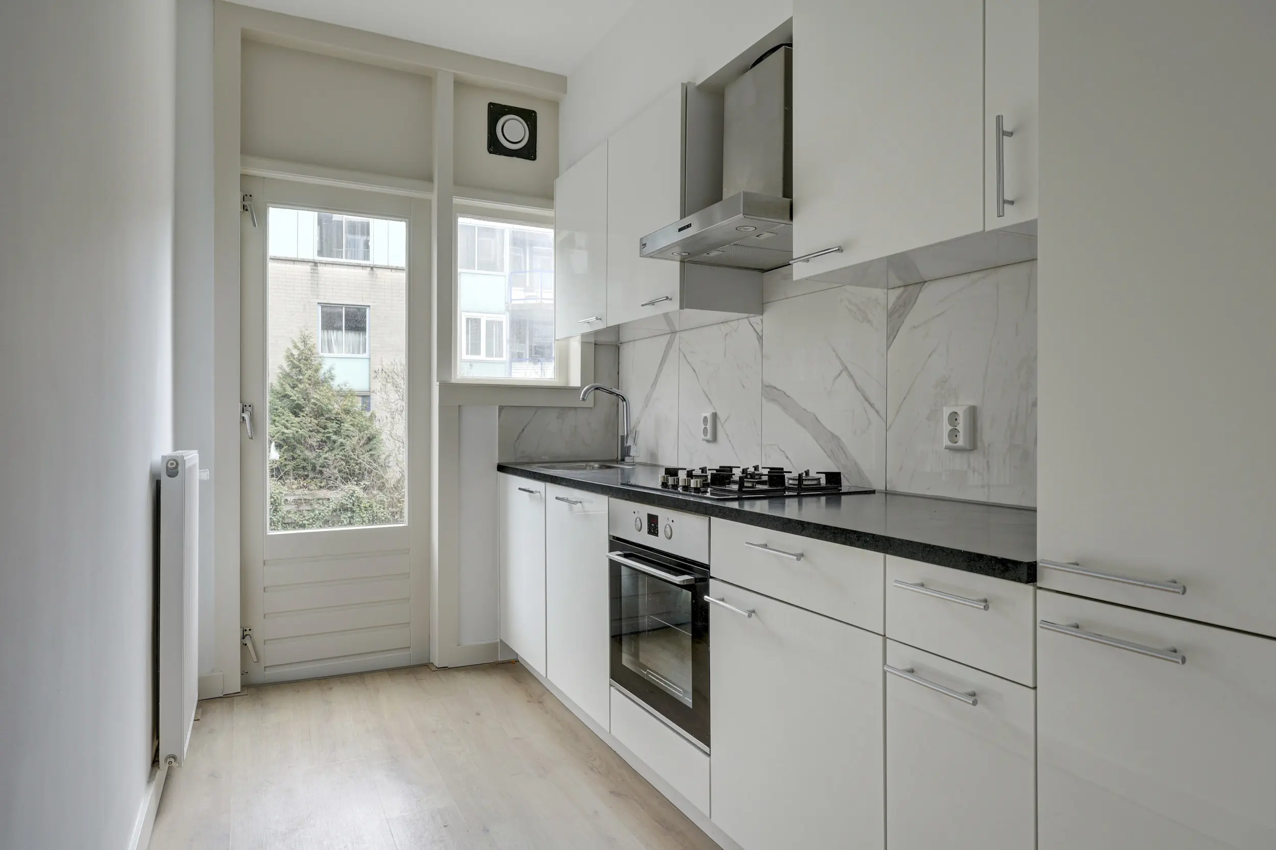 Aan de voorzijde van de woning bevindt zich de ruime woonkamer met veel lichtinval. Aan de achterzijde is de gesloten keuken gelegen, modern uitgevoerd en voorzien van diverse inbouwapparatuur. Vanuit de keuken heeft u toegang tot het achtergelegen balkon.