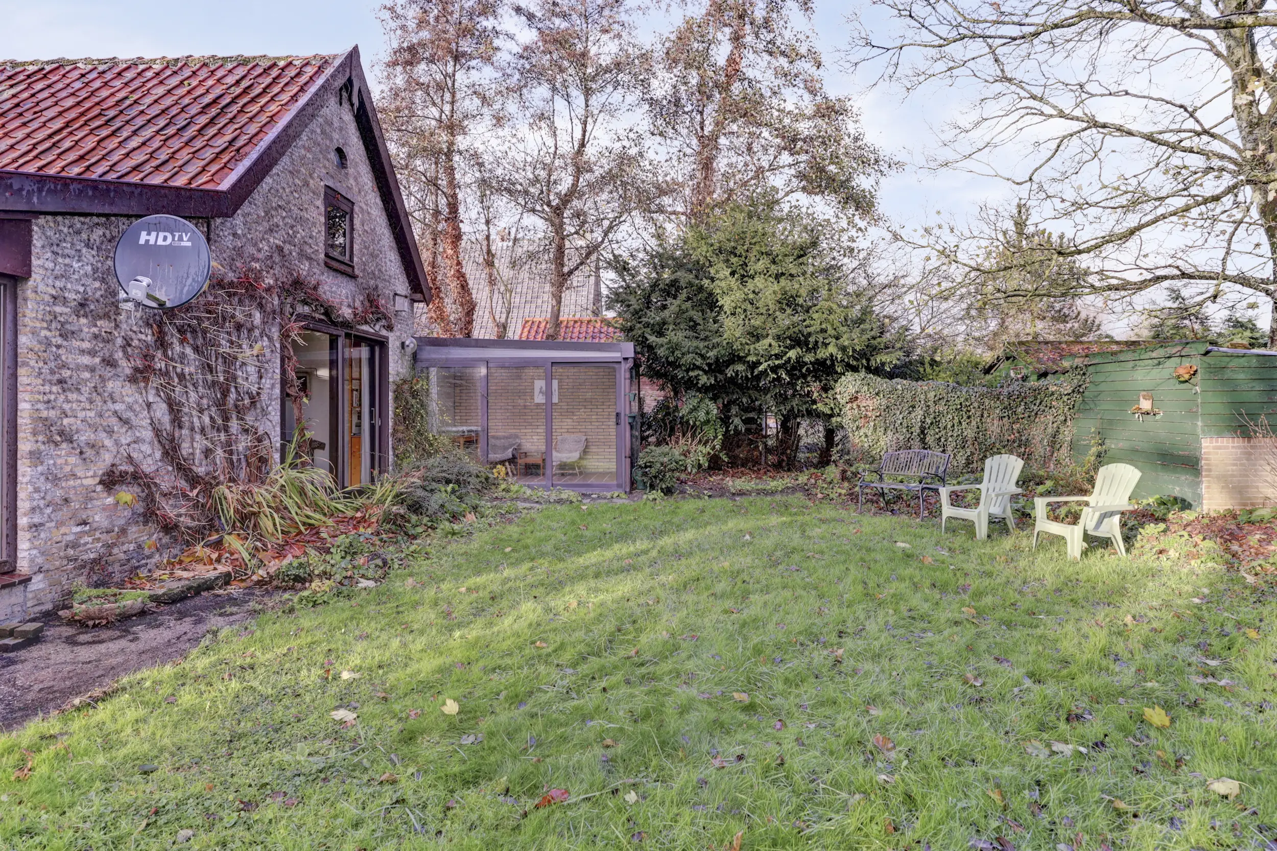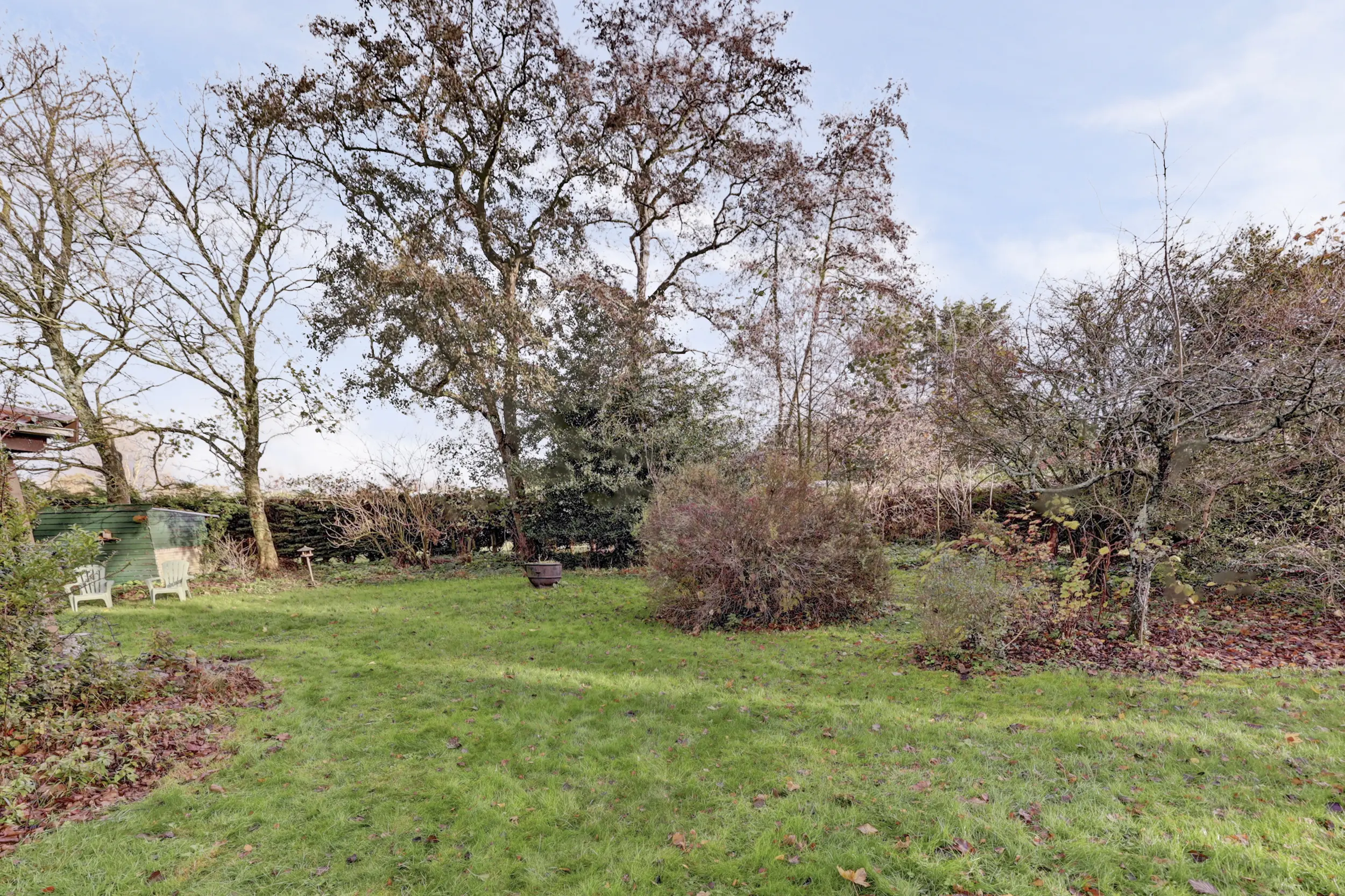 De tuin is heerlijk groen en biedt volop privacy met beplanting, gazon en twee houten bergingen.