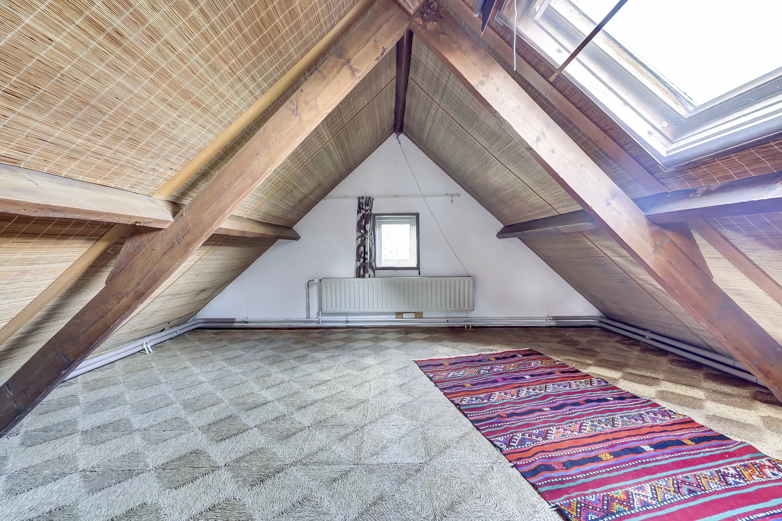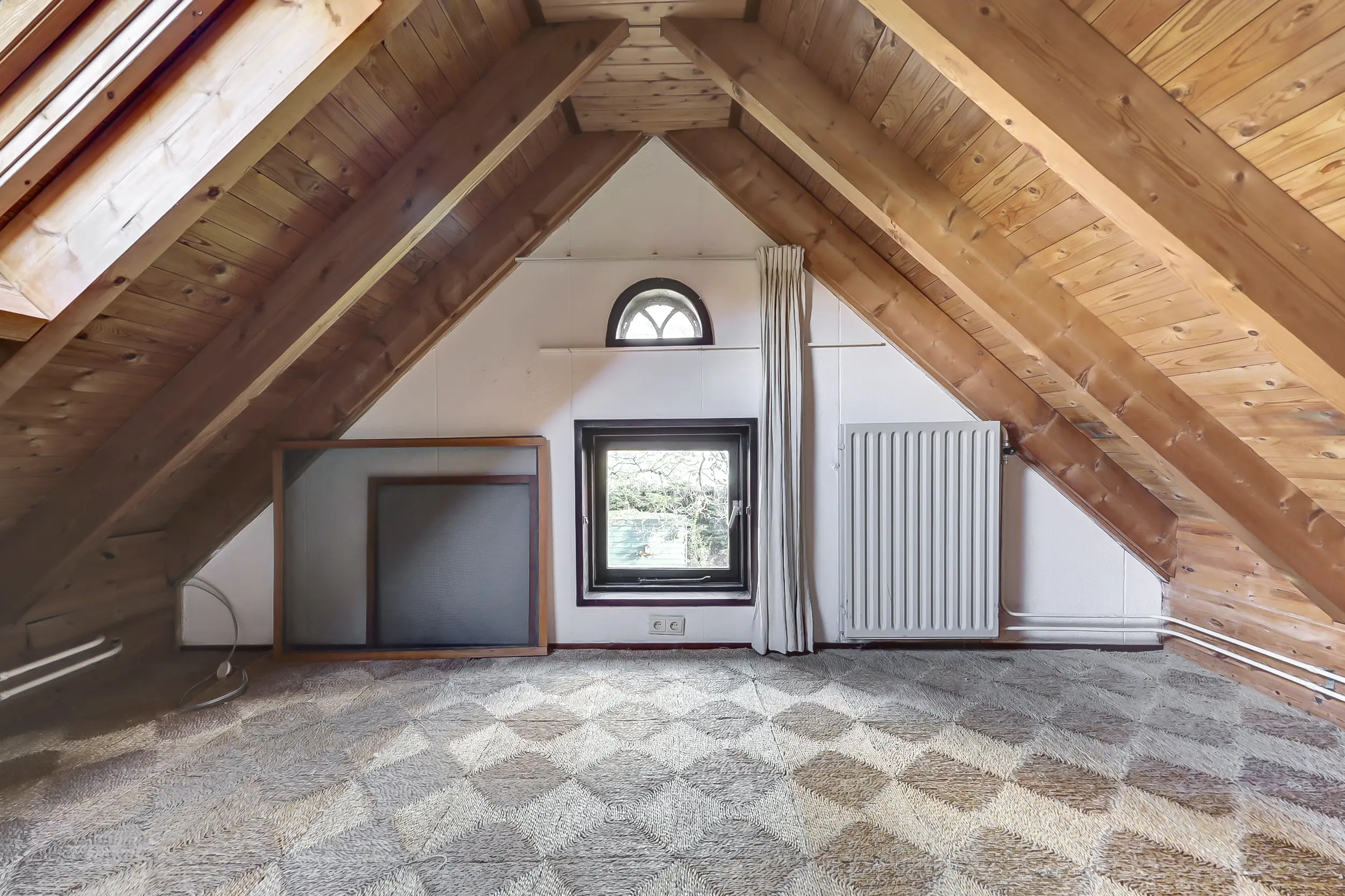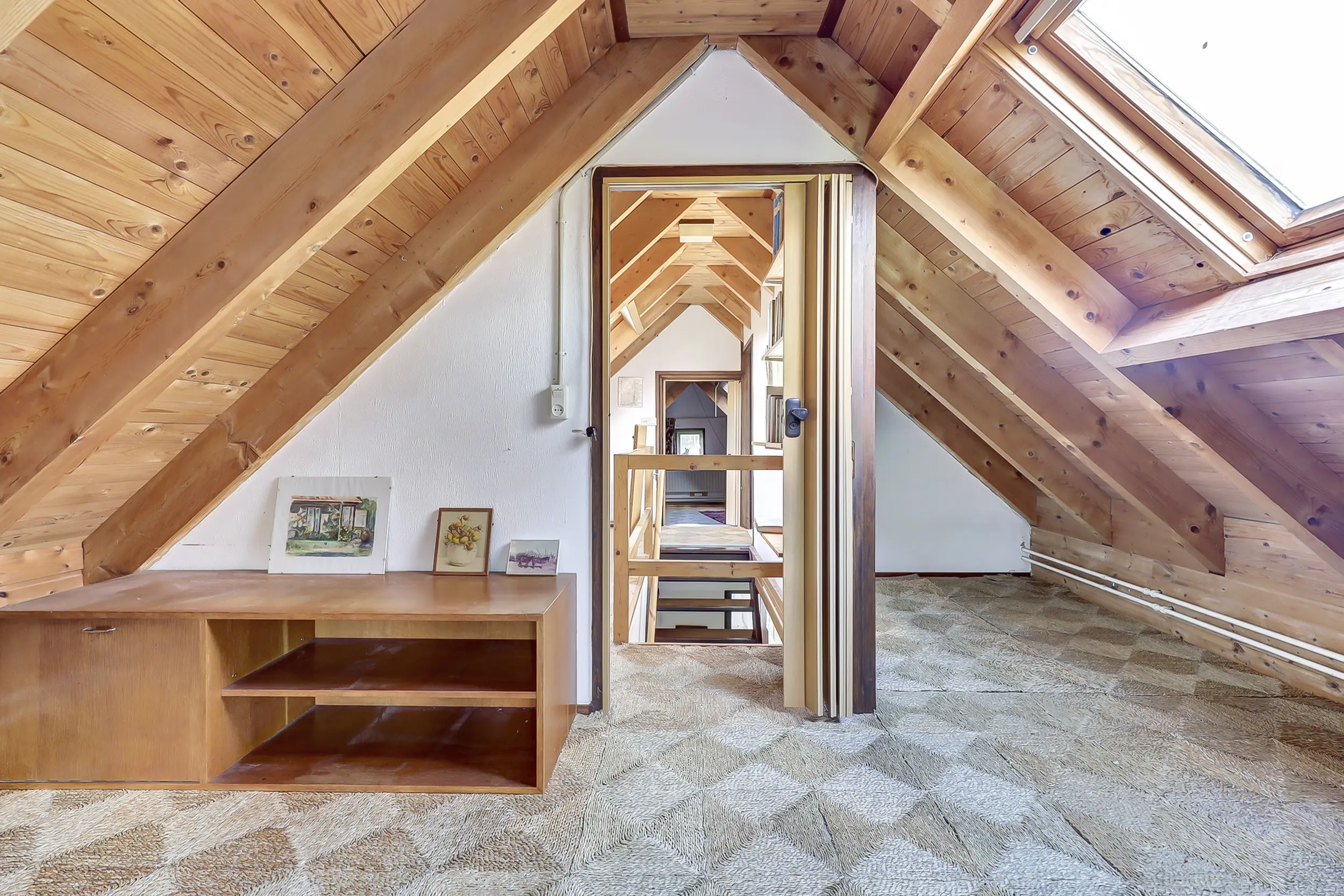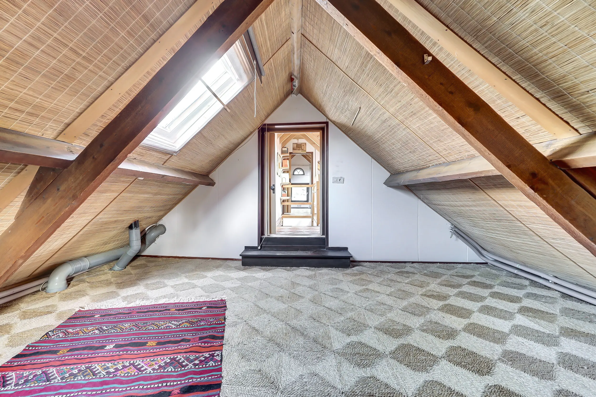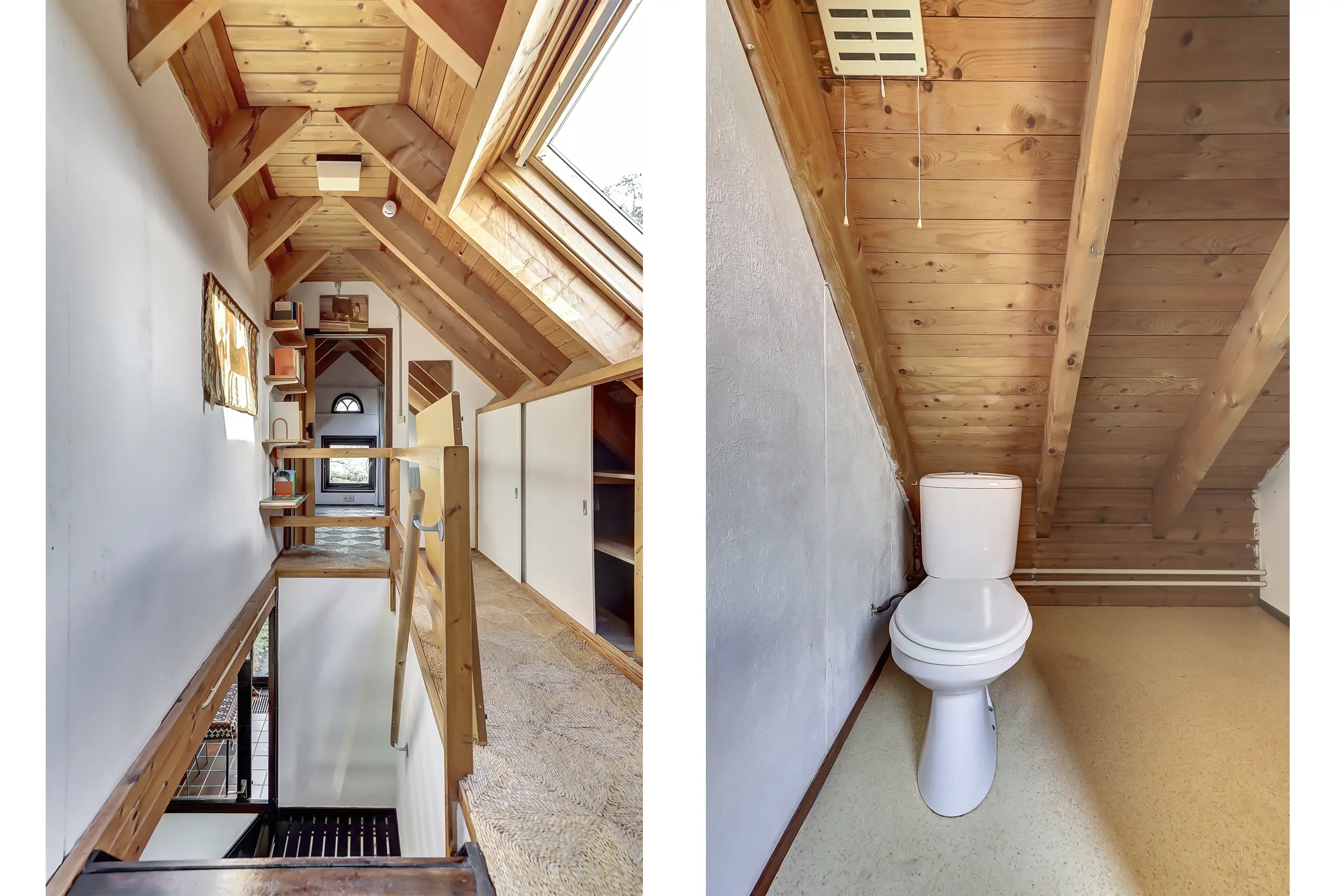 Via de trap bereik je de overloop naar de eerste verdieping. Hier bevinden zich een bergruimte en een toiletruimte. Aan de voor- en achterzijde een slaapkamer met dakramen.