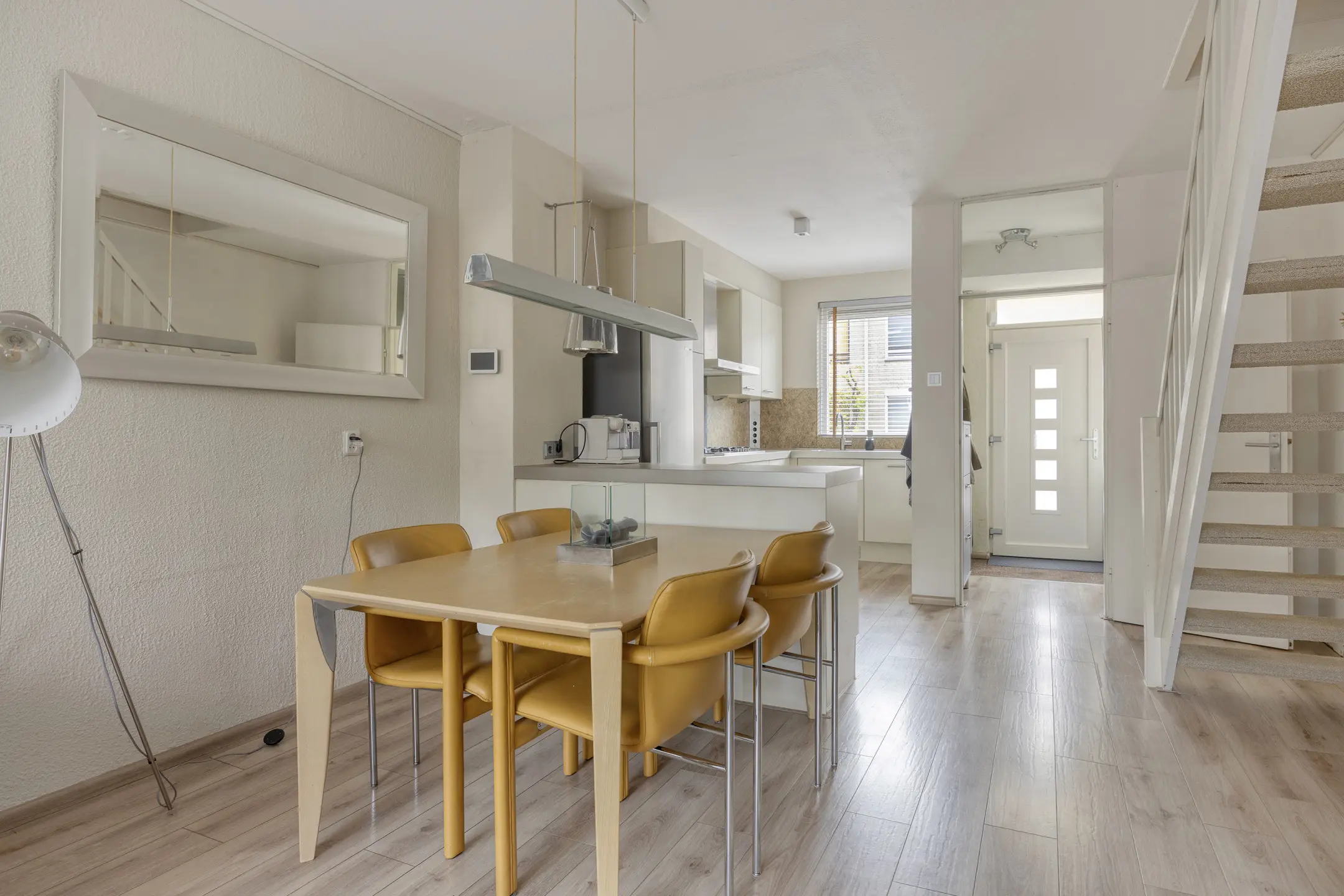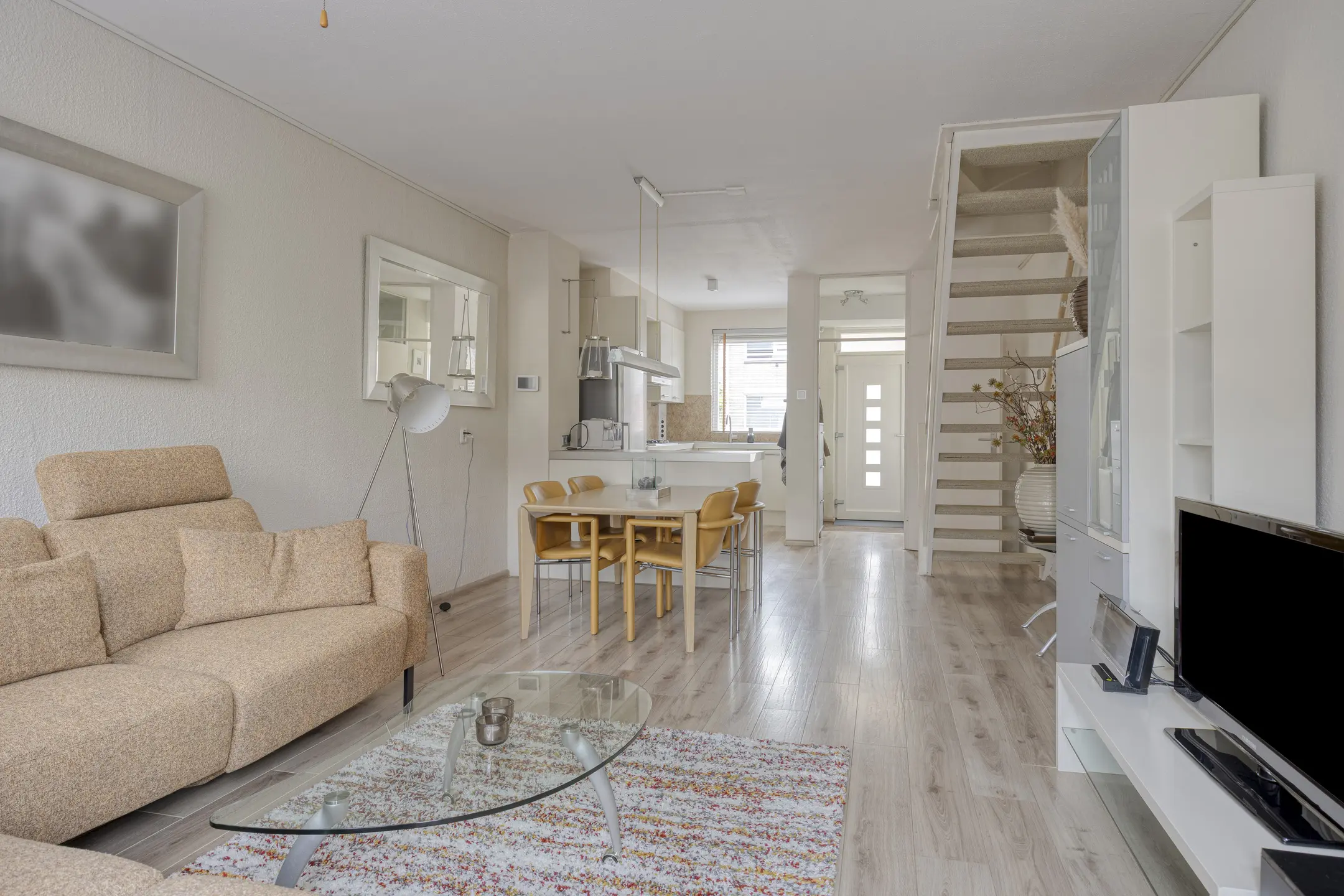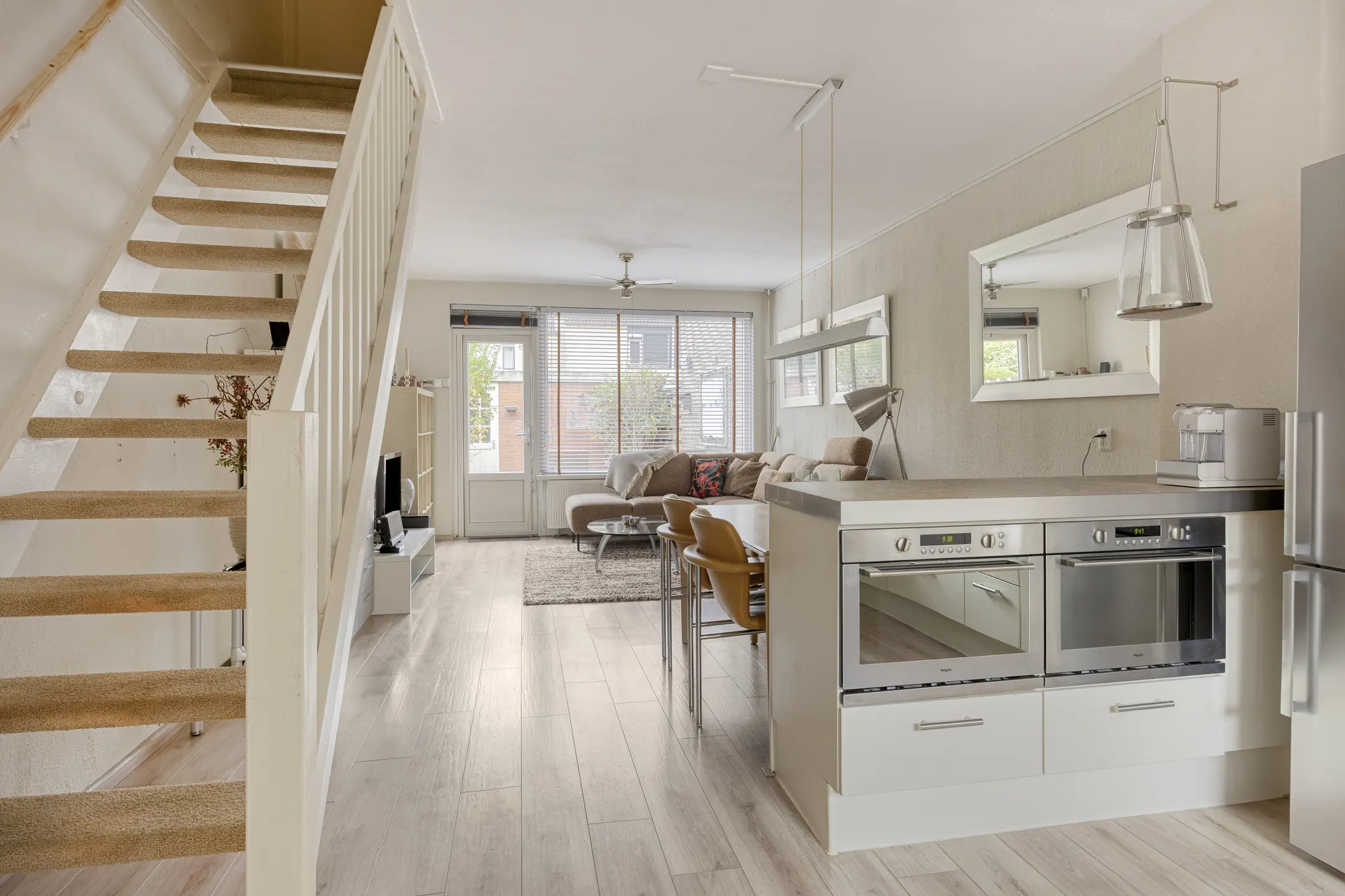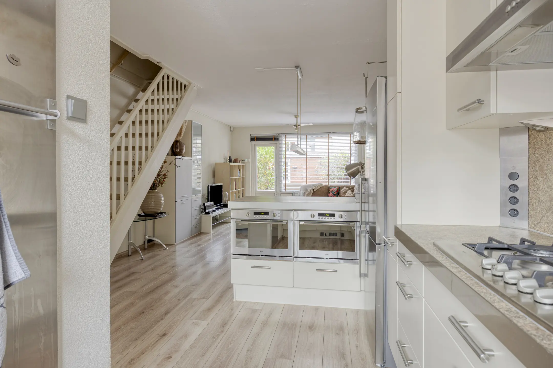 Entree, hal met meterkast en in lichte kleurstelling betegelde toiletruimte met fonteintje. Deur naar de living bestaande uit een open keuken aan de voorzijde van de woning en een tuingerichte woonkamer. De keuken is compleet uitgerust met een gasfornuis, RVS afzuigkap, vaatwasmachine, twee combi-ovens, apothekerskast., een losse koel-vriescombinatie en een spoelbak onder het raam. In de gezellige woonkamer is een deur (met plissé hordeur) naar de achtertuin en een open trap naar de eerste verdieping. Op de begane grond ligt een laminaatvloer met V-groef welke drempelloos is doorgelegd.