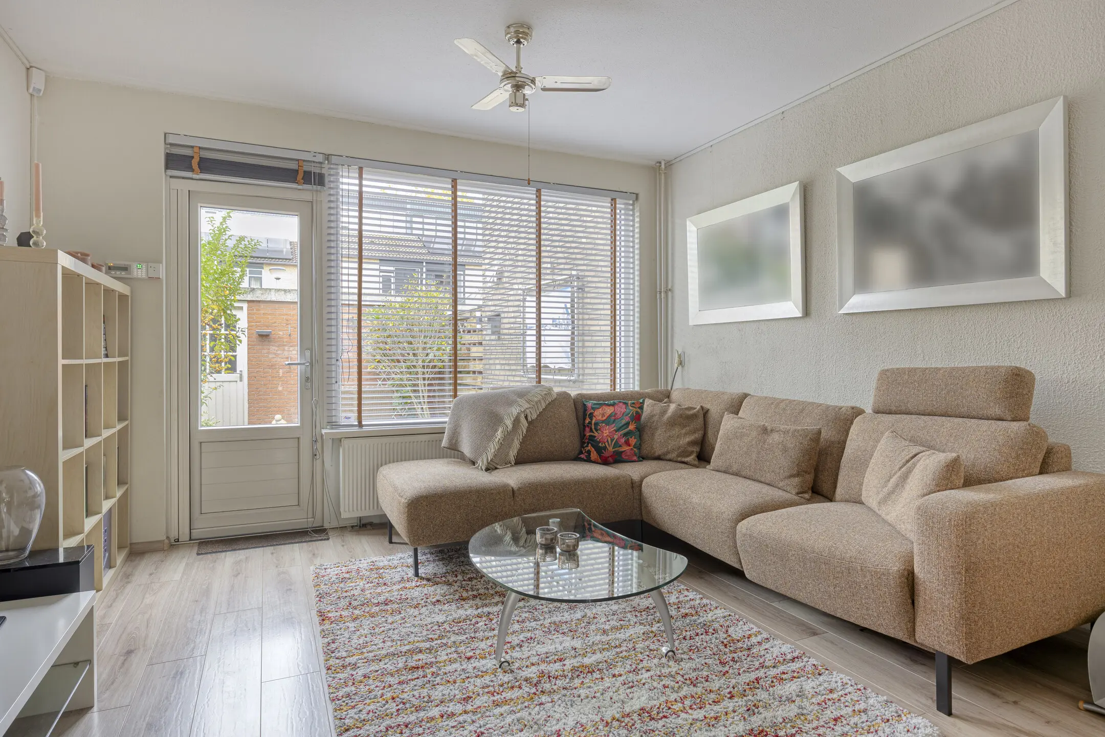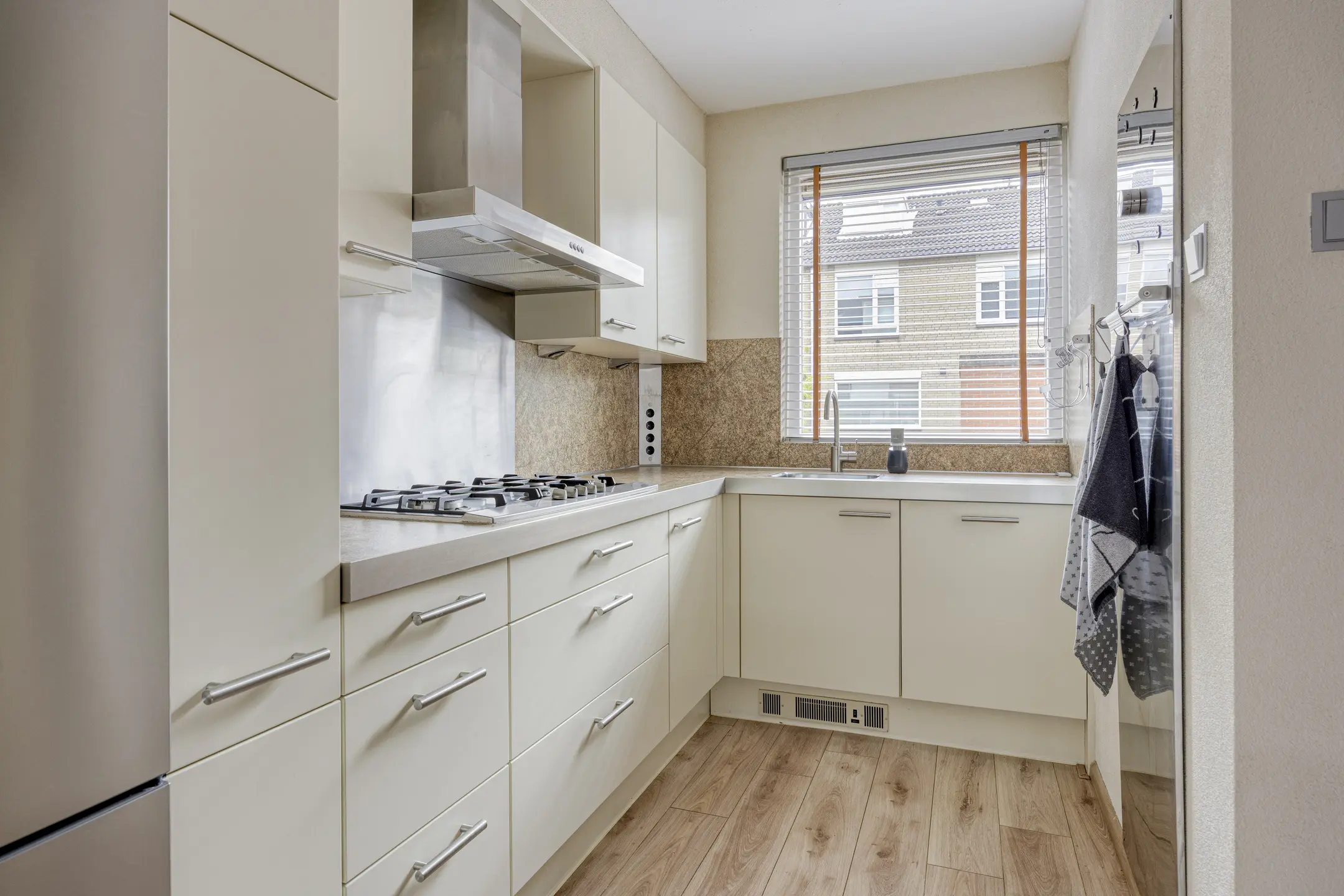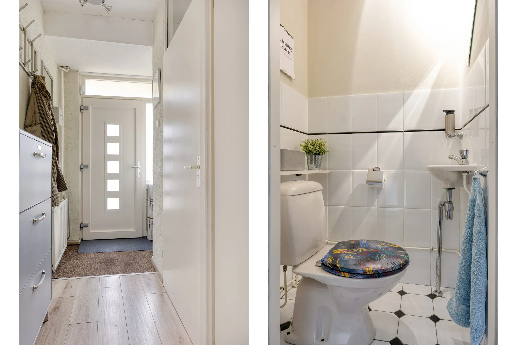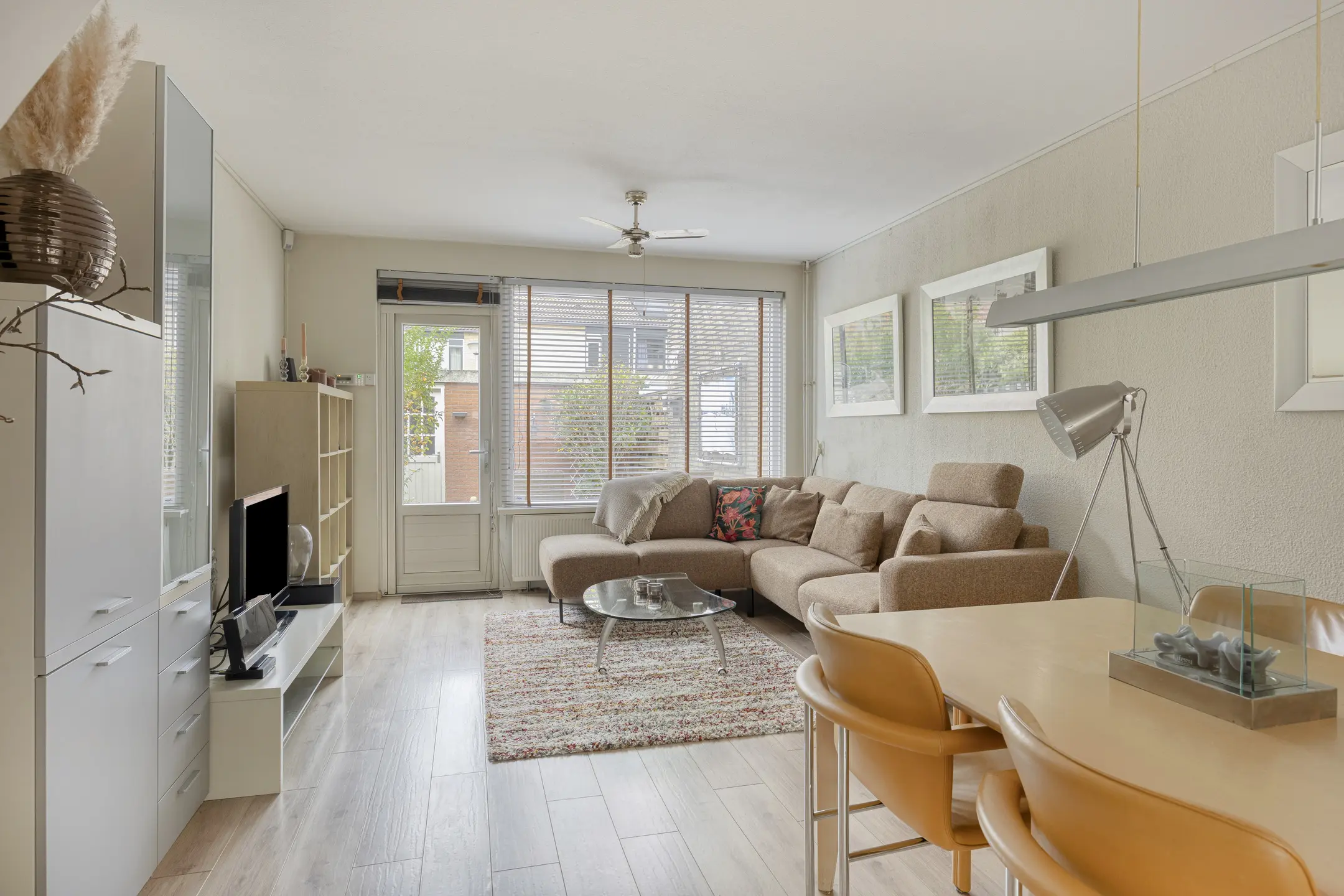Entree, hal met meterkast en in lichte kleurstelling betegelde toiletruimte met fonteintje. Deur naar de living bestaande uit een open keuken aan de voorzijde van de woning en een tuingerichte woonkamer. De keuken is compleet uitgerust met een gasfornuis, RVS afzuigkap, vaatwasmachine, twee combi-ovens, apothekerskast., een losse koel-vriescombinatie en een spoelbak onder het raam. In de gezellige woonkamer is een deur (met plissé hordeur) naar de achtertuin en een open trap naar de eerste verdieping. Op de begane grond ligt een laminaatvloer met V-groef welke drempelloos is doorgelegd.