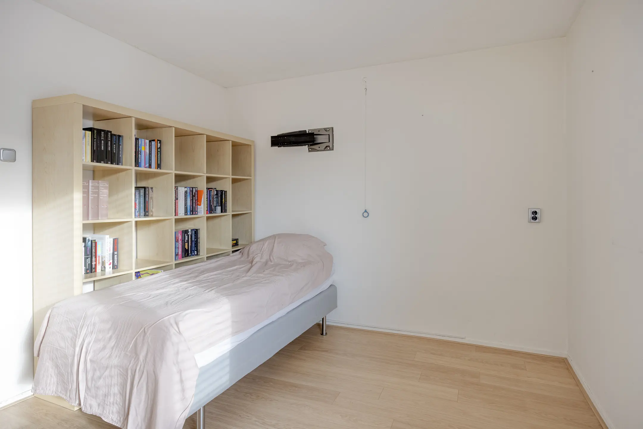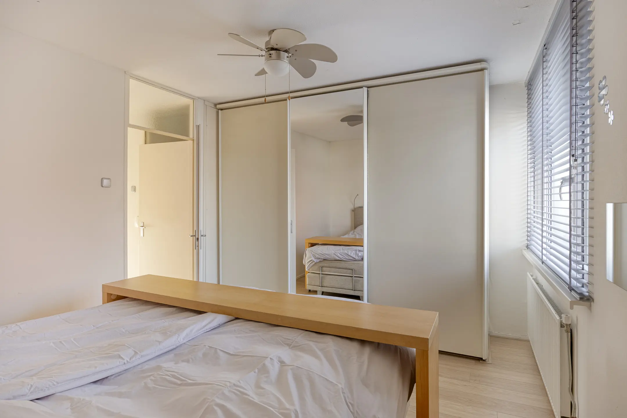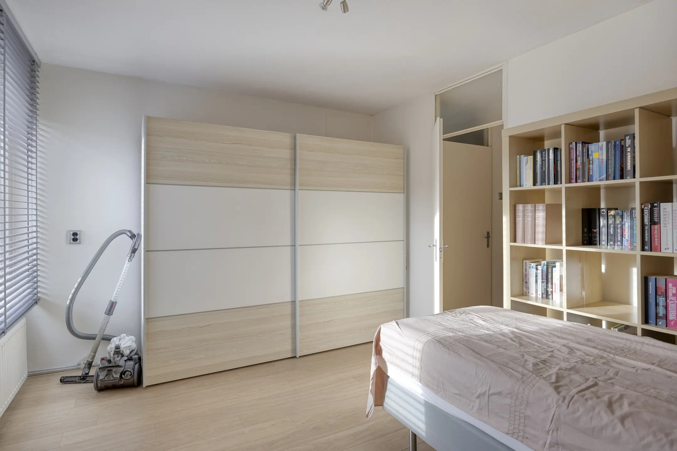 Overloop met vaste kast met daarin de aansluiting voor de wasmachine. Twee riante slaapkamers over de gehele breedte gelegen aan de voor- en achterzijde van de woning. De slaapkamer aan de achterzijde heeft een praktische vaste schuifkastenwand. Op de overloop en in de slaapkamers ligt laminaat. De badkamer is geheel betegeld met donkere vloer- en witte wandtegels en is voorzien van een wandcloset, design radiator, wastafelmeubel en ligbad met douchescherm.