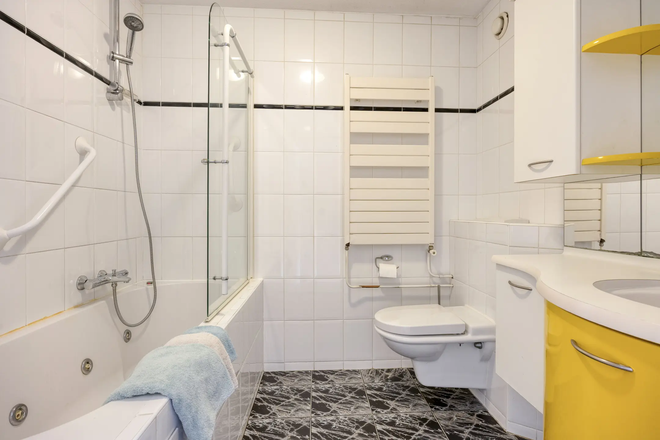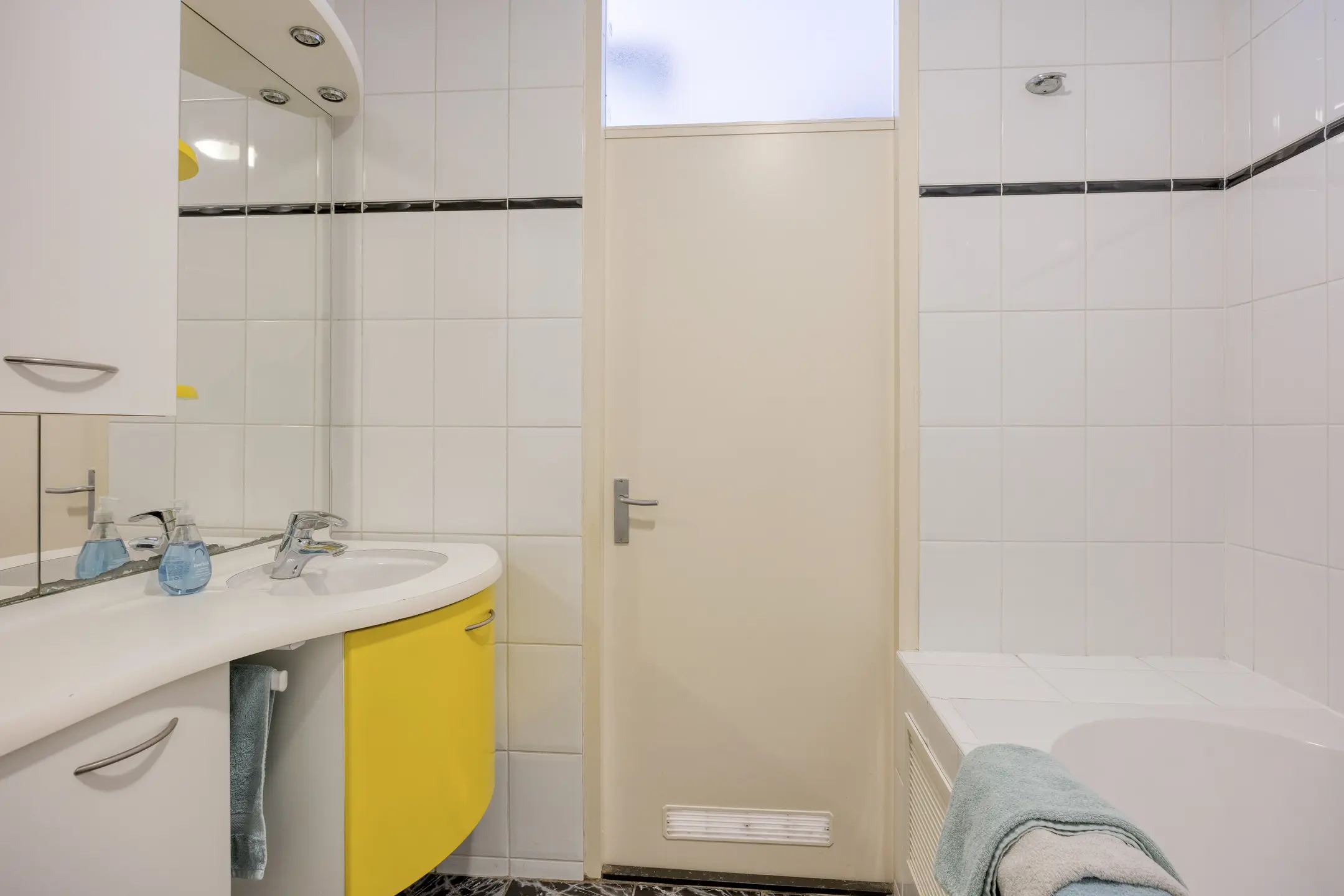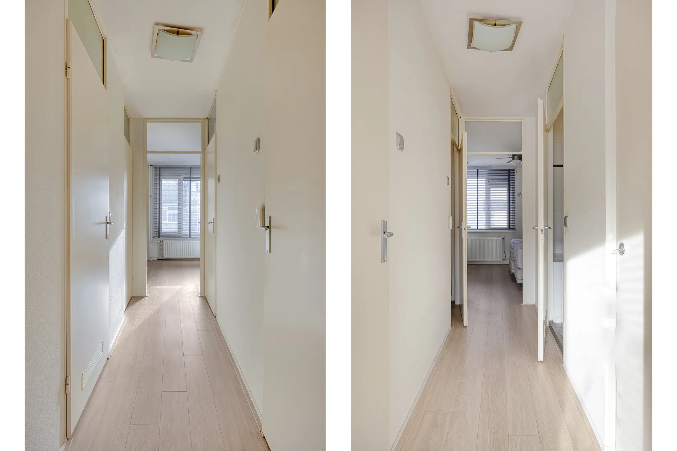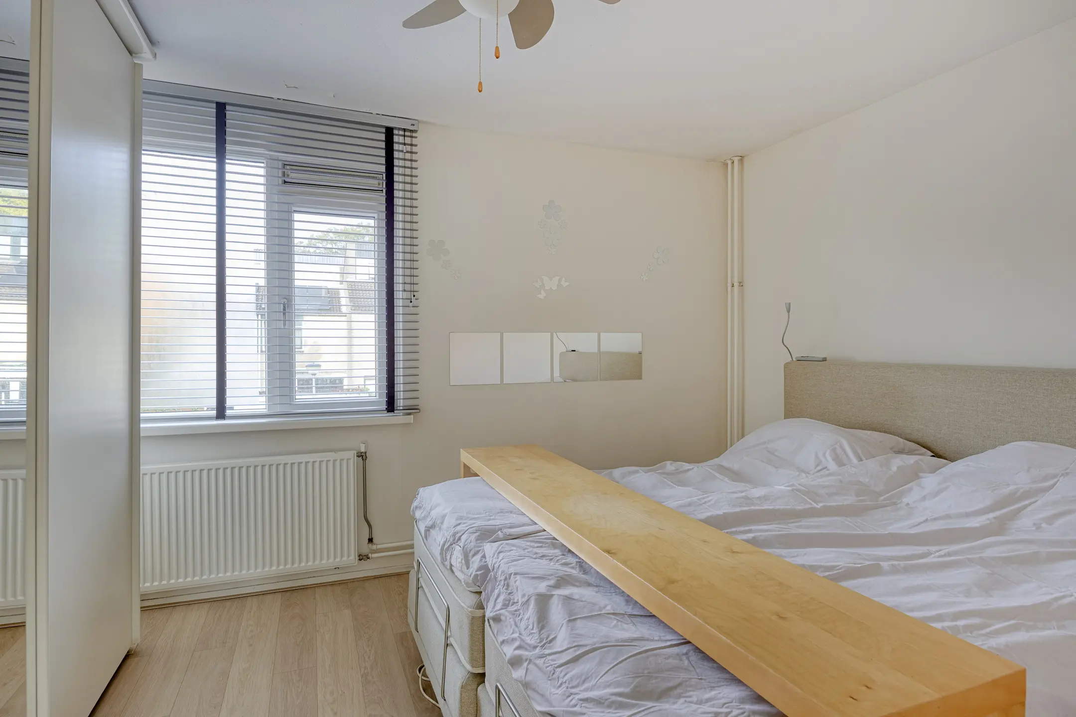 Overloop met vaste kast met daarin de aansluiting voor de wasmachine. Twee riante slaapkamers over de gehele breedte gelegen aan de voor- en achterzijde van de woning. De slaapkamer aan de achterzijde heeft een praktische vaste schuifkastenwand. Op de overloop en in de slaapkamers ligt laminaat. De badkamer is geheel betegeld met donkere vloer- en witte wandtegels en is voorzien van een wandcloset, design radiator, wastafelmeubel en ligbad met douchescherm.