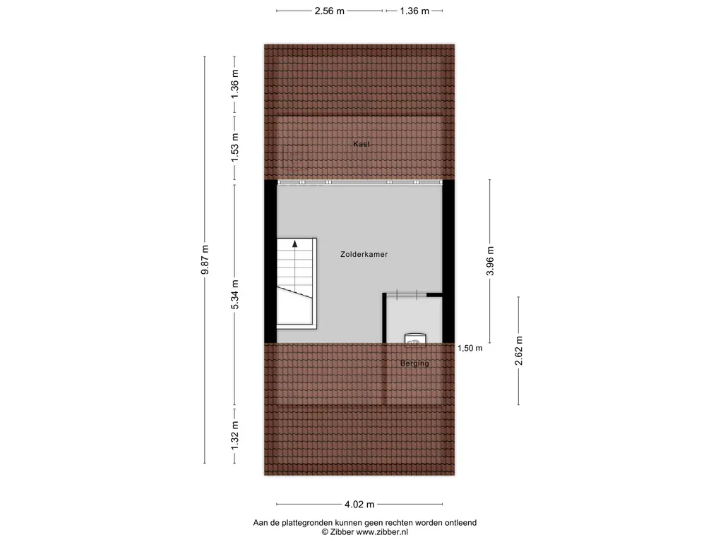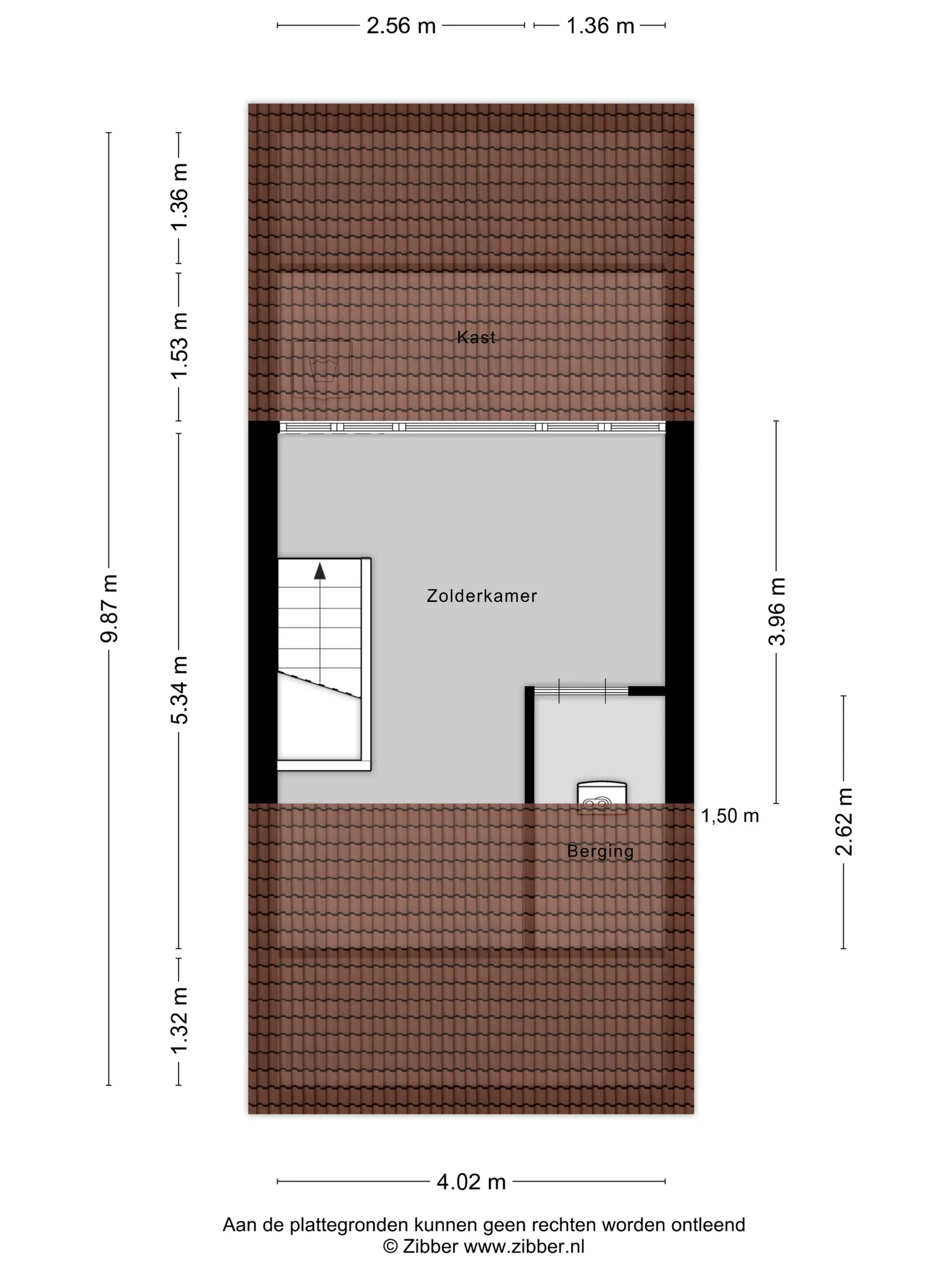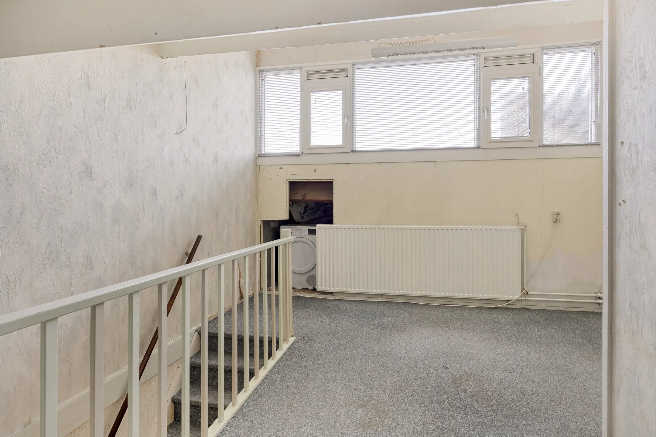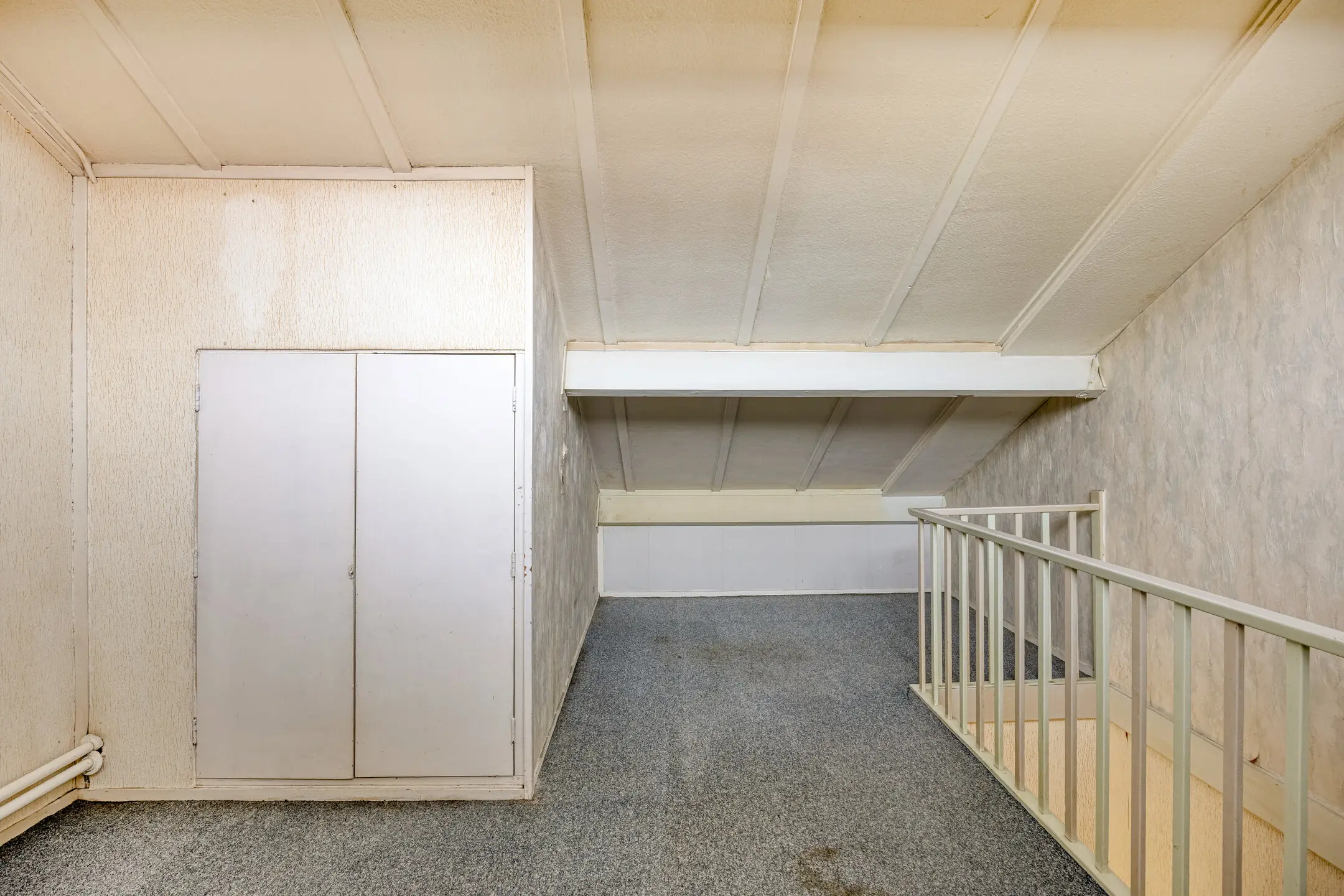 Open zolderruimte met praktische bergruimte achter de knieschotten en een kast met daarin de C.V.-combiketel en mechanische ventilatie. Het is mogelijk om deze verdieping te vergroten door het plaatsen van een dakkapel.