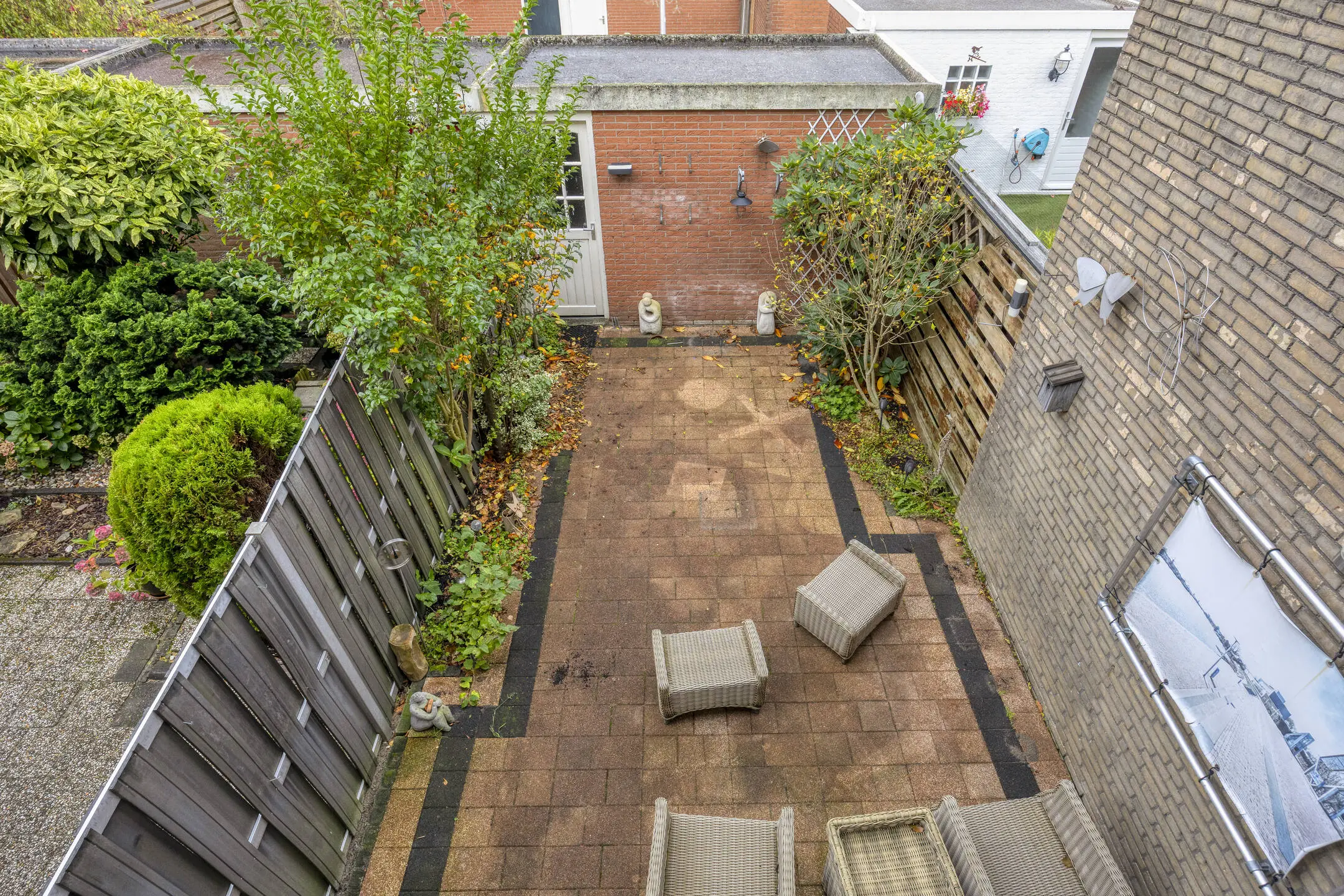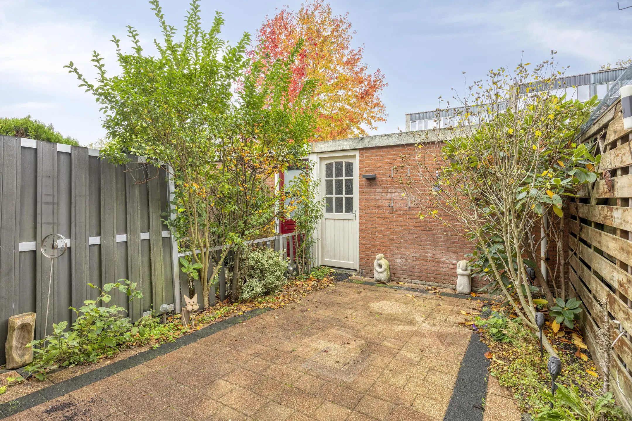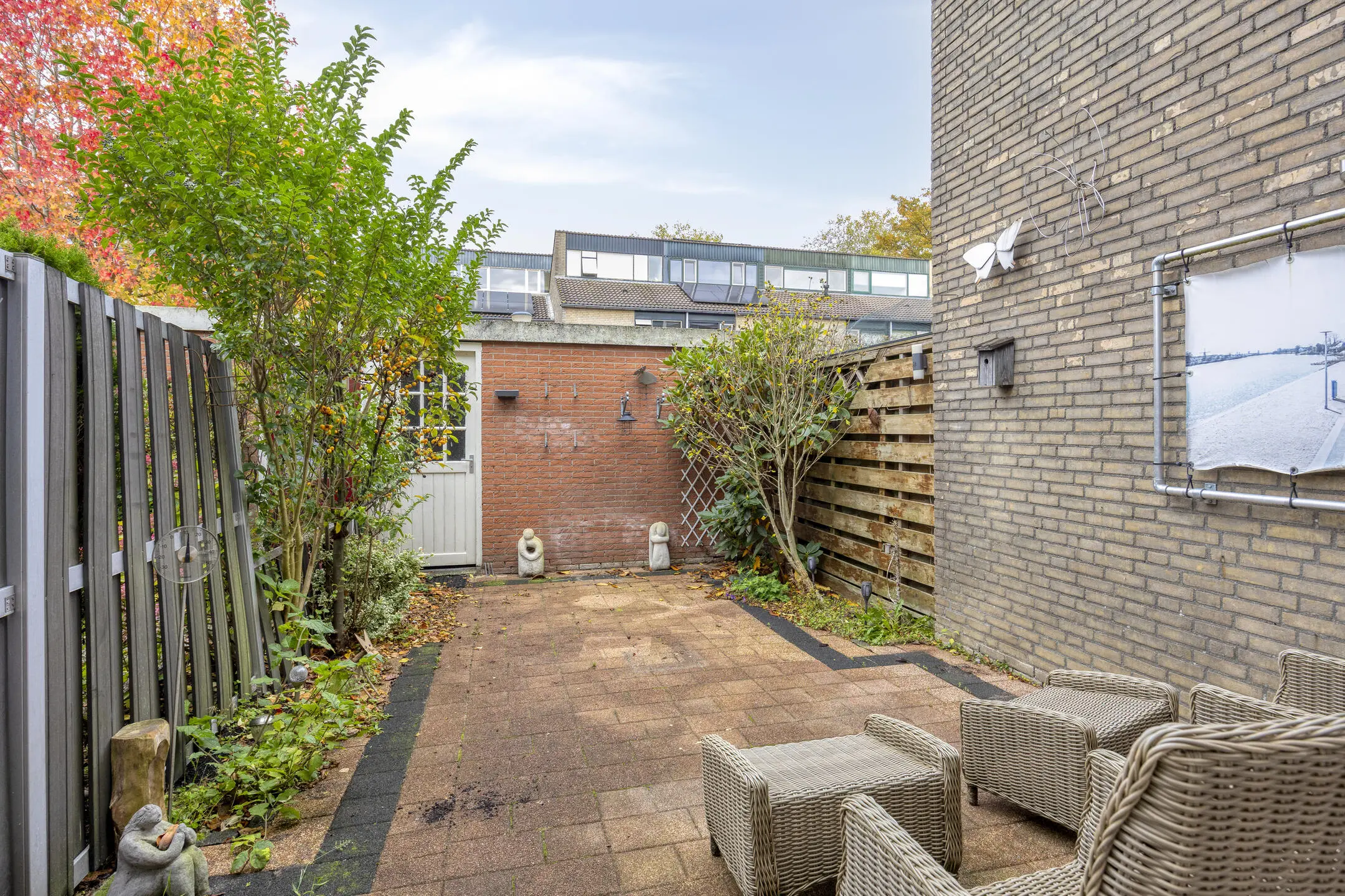 Onderhoudsvriendelijke op het noordwesten gelegen achtertuin met betegeling, vaste beplanting en buitenkraan. Er is een stenen berging aanwezig met achterom en elektra. Het zonnescherm met elektrische bediening houdt de zon uit de woonkamer.