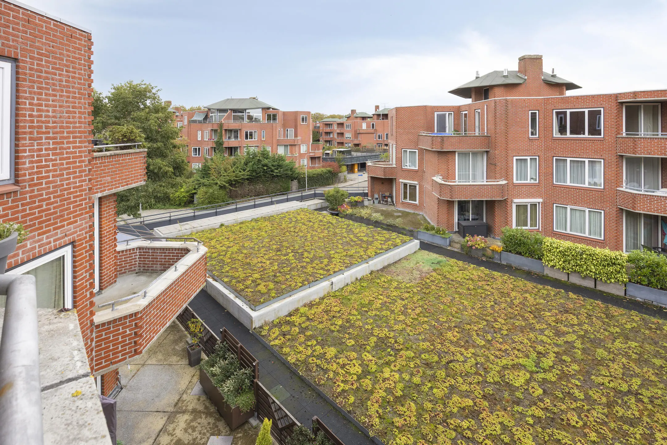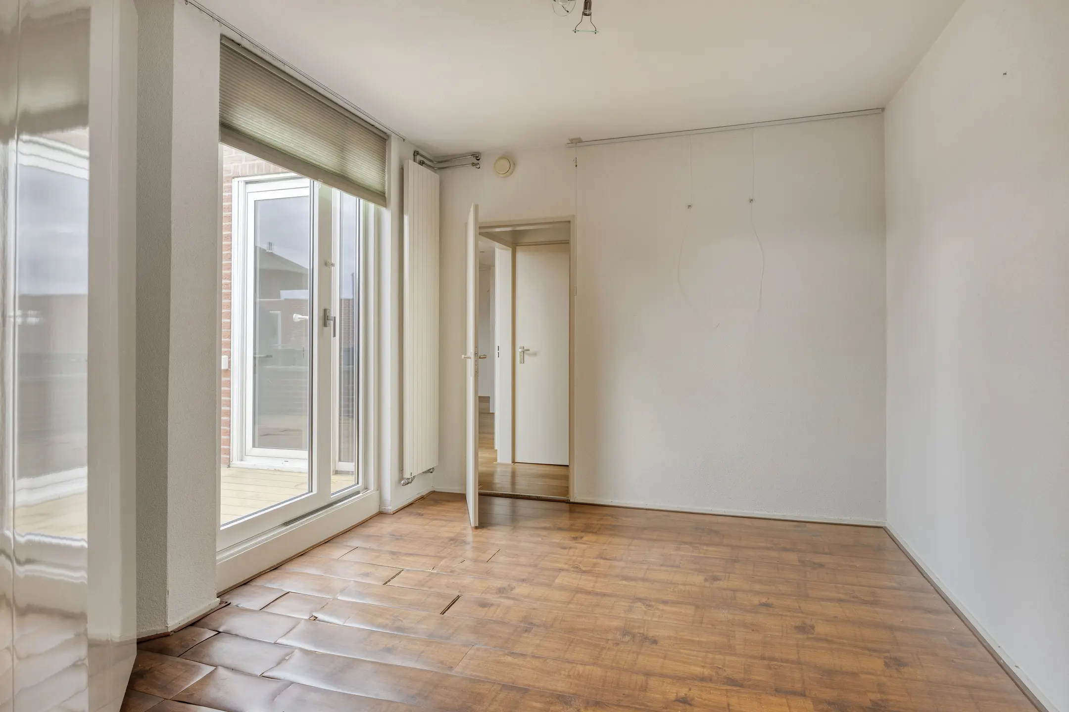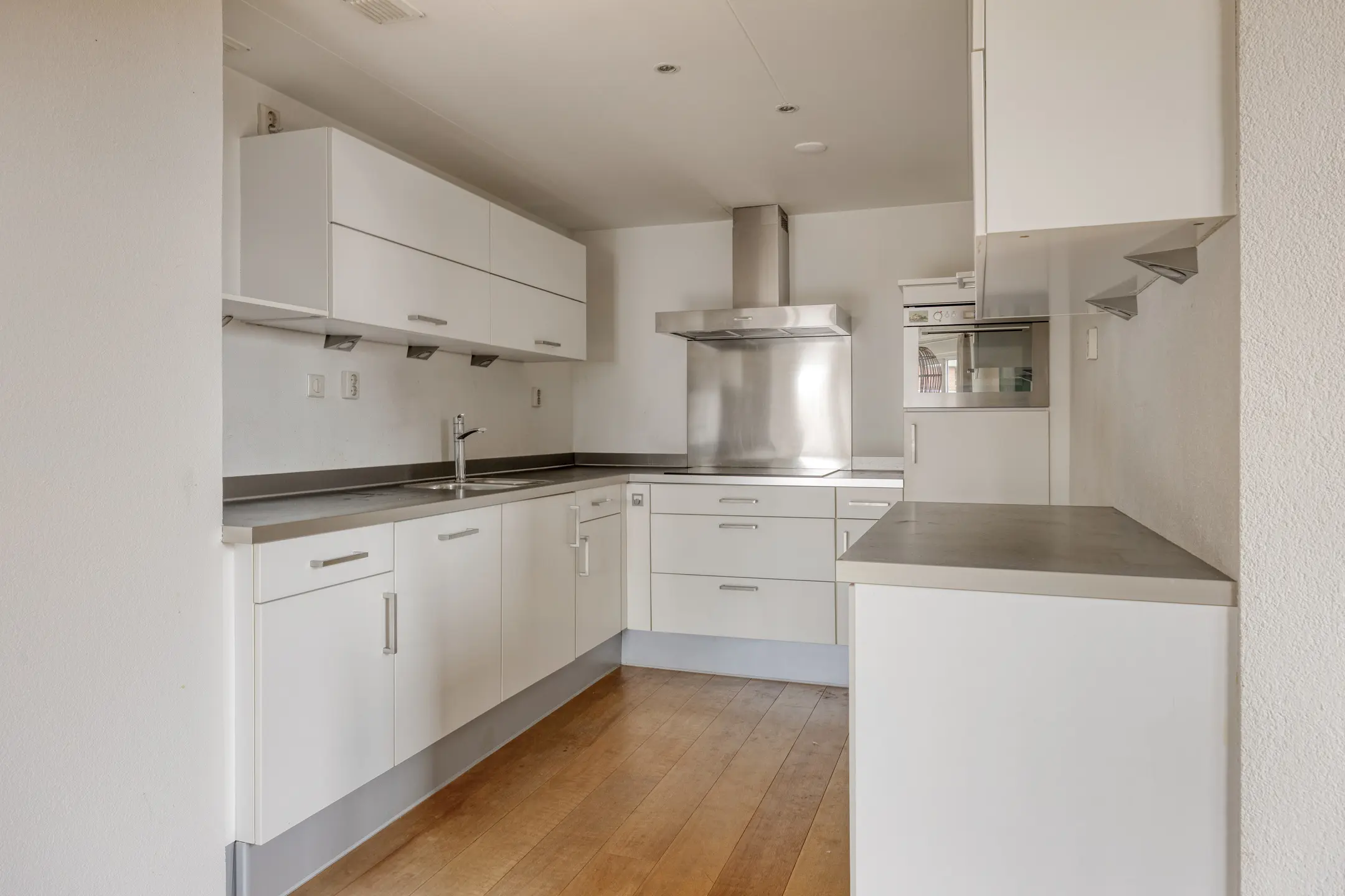 Entree, hal met videofoon en meterkast. Vaste kast met de C.V.-combi-ketel en warmte-terugwininstallatie. Deur met glas inzet maar de ruime en lichte woonkamer speelse indeling en schuifpui naar het aan de woonkamer grenzende balkon. De witte keuken met donker aanrechtblad is geplaatst in L-opstelling en is uitgerust met een keramische kookplaat, RVS afzuigkap (recirculatie), vriezer, vaatwasmachine, combi-oven en koelkast met vriesvak. Het plafond in de keuken is verlaagd en voorzien van inbouwspots. De slaapkamers zijn beiden kamers van een fijn formaat en ze hebben tevens allebei een deur naar het ruime terras en openslaande ramen. In de woonkamer, keuken, hal en de kleinere slaapkamer ligt een fraaie houten vloer, welke drempelloos is doorgelegd. In de grootste slaapkamer ligt een laminaatvloer. De geheel in wit/grijze kleurstelling betegelde badkamer is uitgerust met een douche met regen- en handdouche, wastafelmeubel, spiegel met verlichting, design radiator. In de badkamer zijn ook de aansluitingen aanwezig voor de wasmachine en droger. In dezelfde kleurstelling betegelde toiletruimte met een wandcloset en fonteintje.