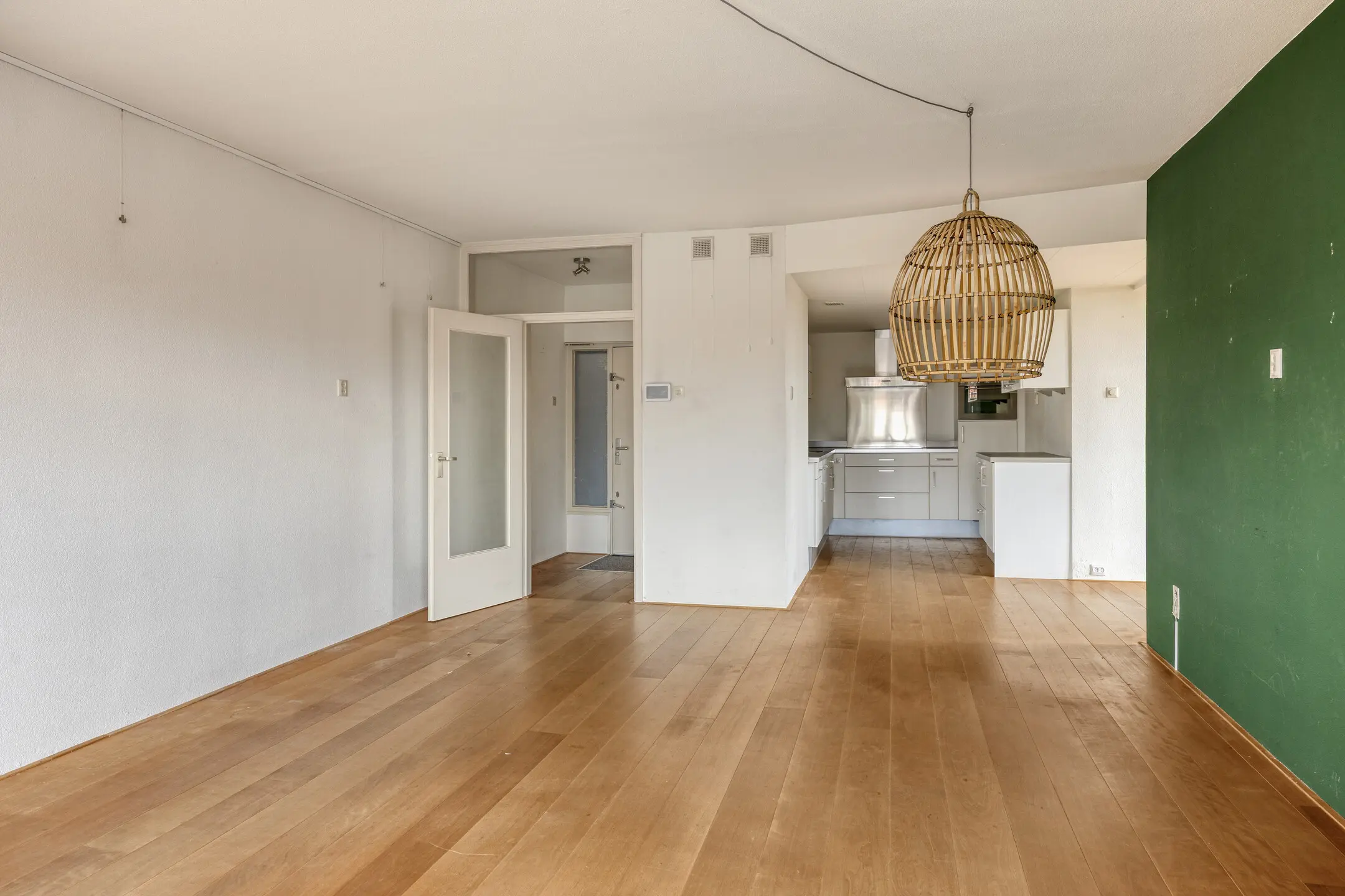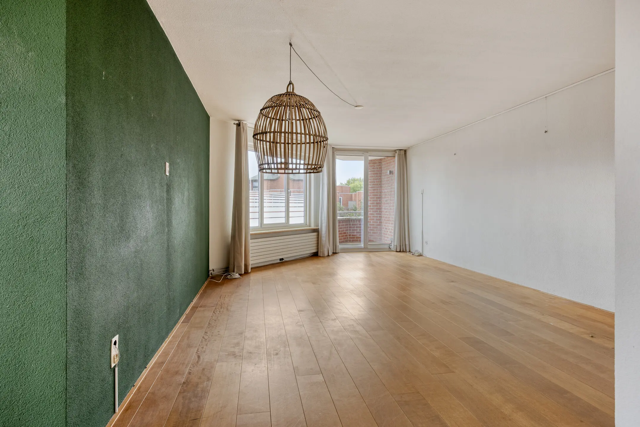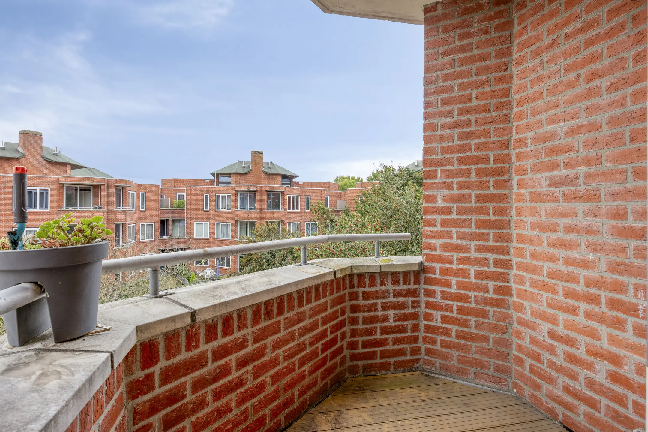 Entree, hal met videofoon en meterkast. Vaste kast met de C.V.-combi-ketel en warmte-terugwininstallatie. Deur met glas inzet maar de ruime en lichte woonkamer speelse indeling en schuifpui naar het aan de woonkamer grenzende balkon. De witte keuken met donker aanrechtblad is geplaatst in L-opstelling en is uitgerust met een keramische kookplaat, RVS afzuigkap (recirculatie), vriezer, vaatwasmachine, combi-oven en koelkast met vriesvak. Het plafond in de keuken is verlaagd en voorzien van inbouwspots. De slaapkamers zijn beiden kamers van een fijn formaat en ze hebben tevens allebei een deur naar het ruime terras en openslaande ramen. In de woonkamer, keuken, hal en de kleinere slaapkamer ligt een fraaie houten vloer, welke drempelloos is doorgelegd. In de grootste slaapkamer ligt een laminaatvloer. De geheel in wit/grijze kleurstelling betegelde badkamer is uitgerust met een douche met regen- en handdouche, wastafelmeubel, spiegel met verlichting, design radiator. In de badkamer zijn ook de aansluitingen aanwezig voor de wasmachine en droger. In dezelfde kleurstelling betegelde toiletruimte met een wandcloset en fonteintje.