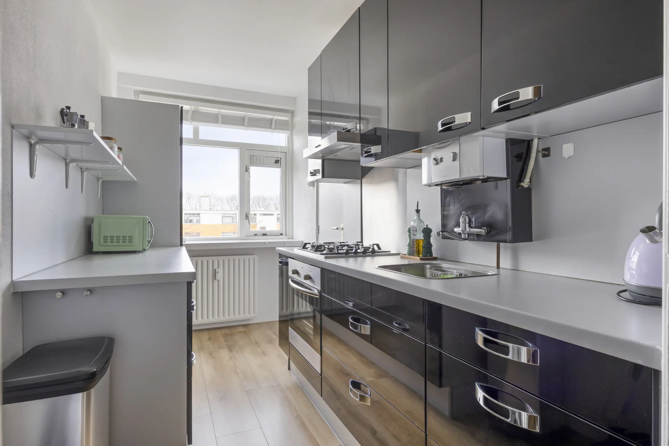 De moderne keuken is voorzien van diverse inbouwapparatuur en geeft toegang tot de badkamer. De badkamer beschikt over een douche, wastafel en aansluitingen voor de wasapparatuur.