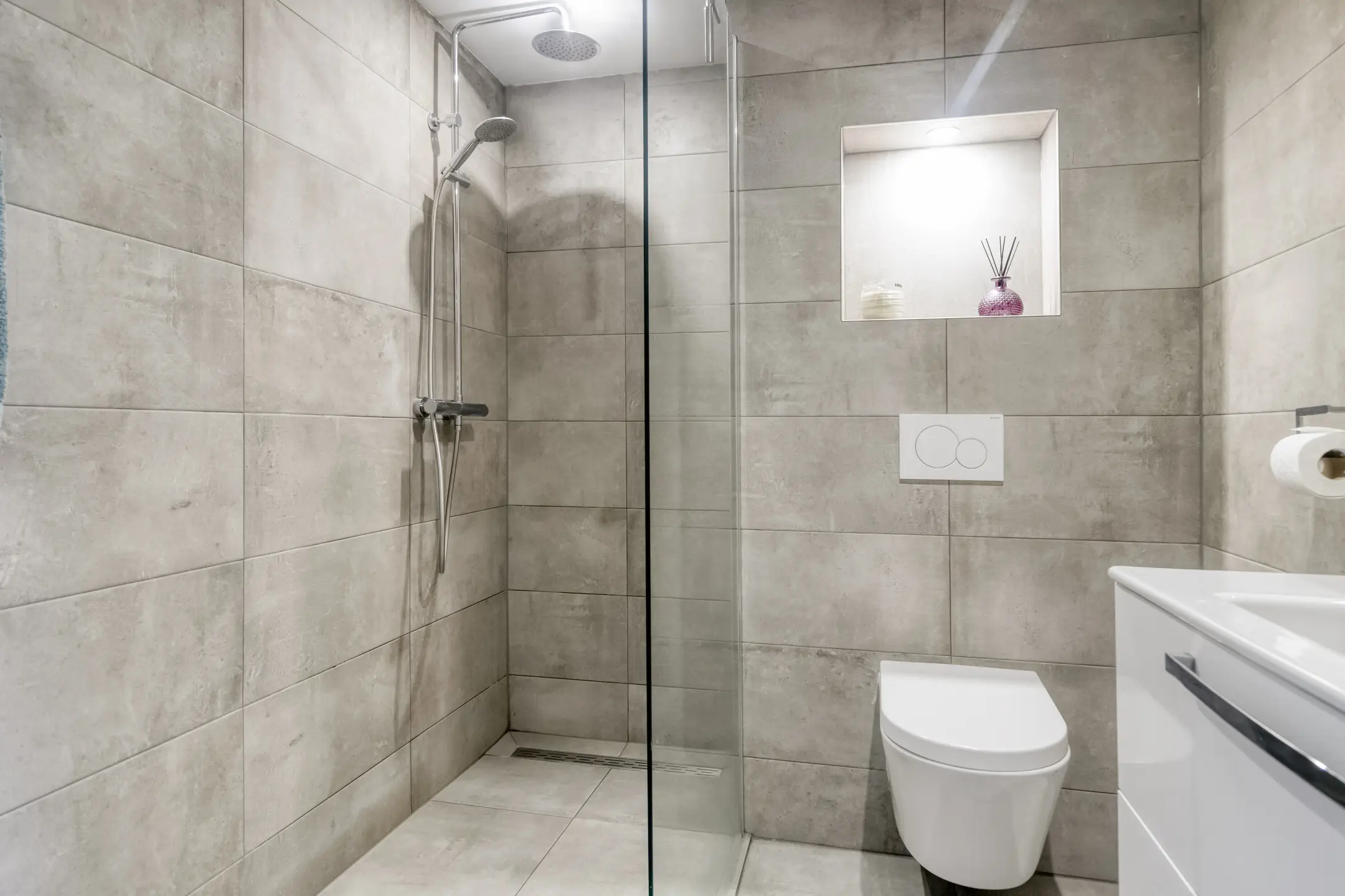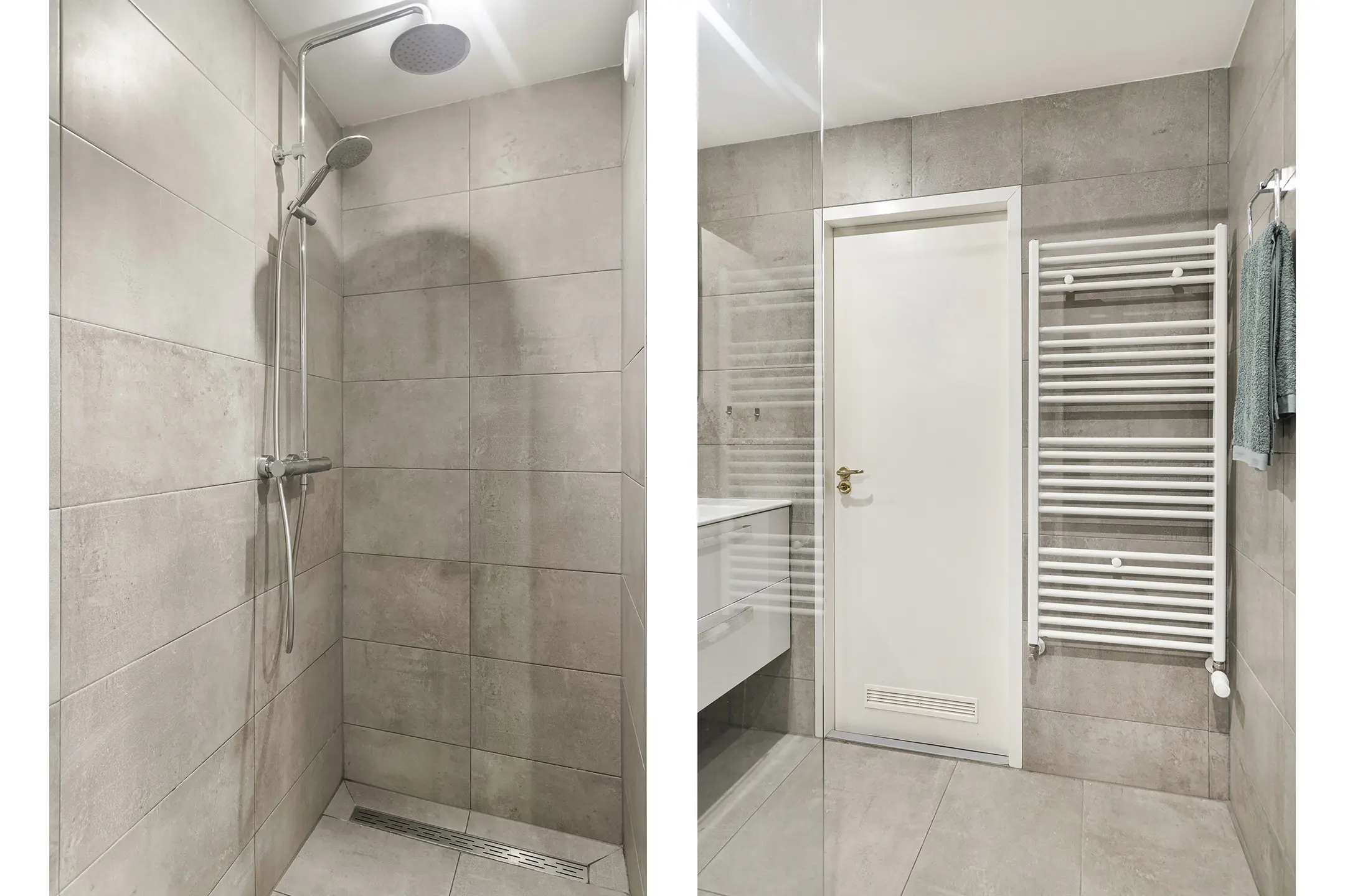 De moderne en ruime badkamer is uitgerust met een inloopdouche toilet, design radiator en wastafel.