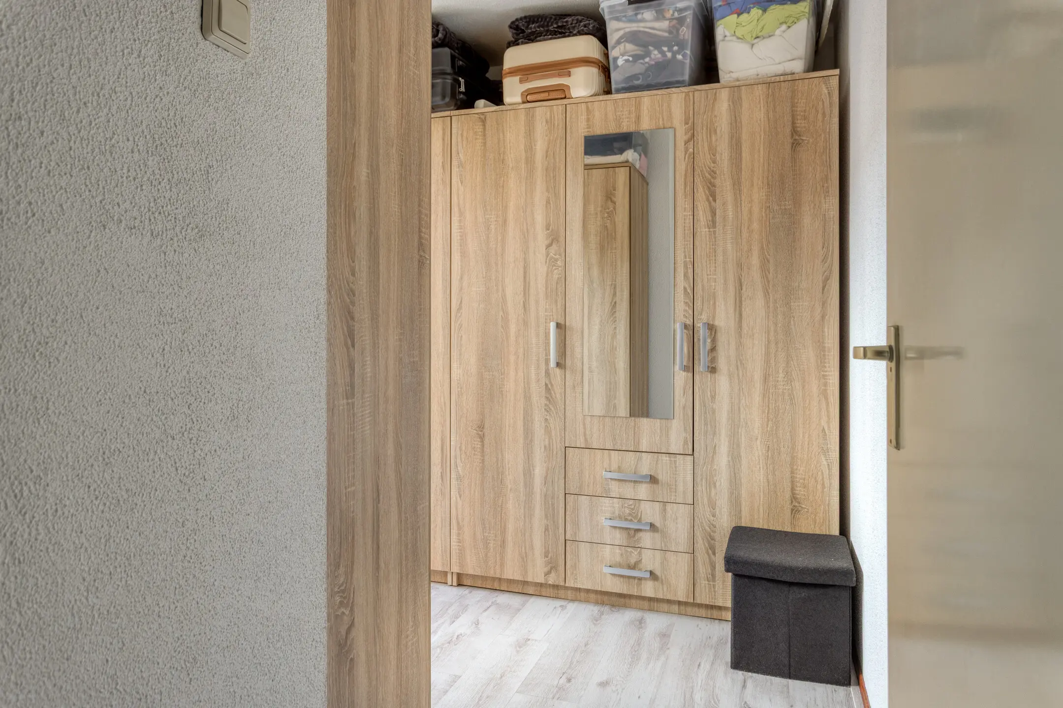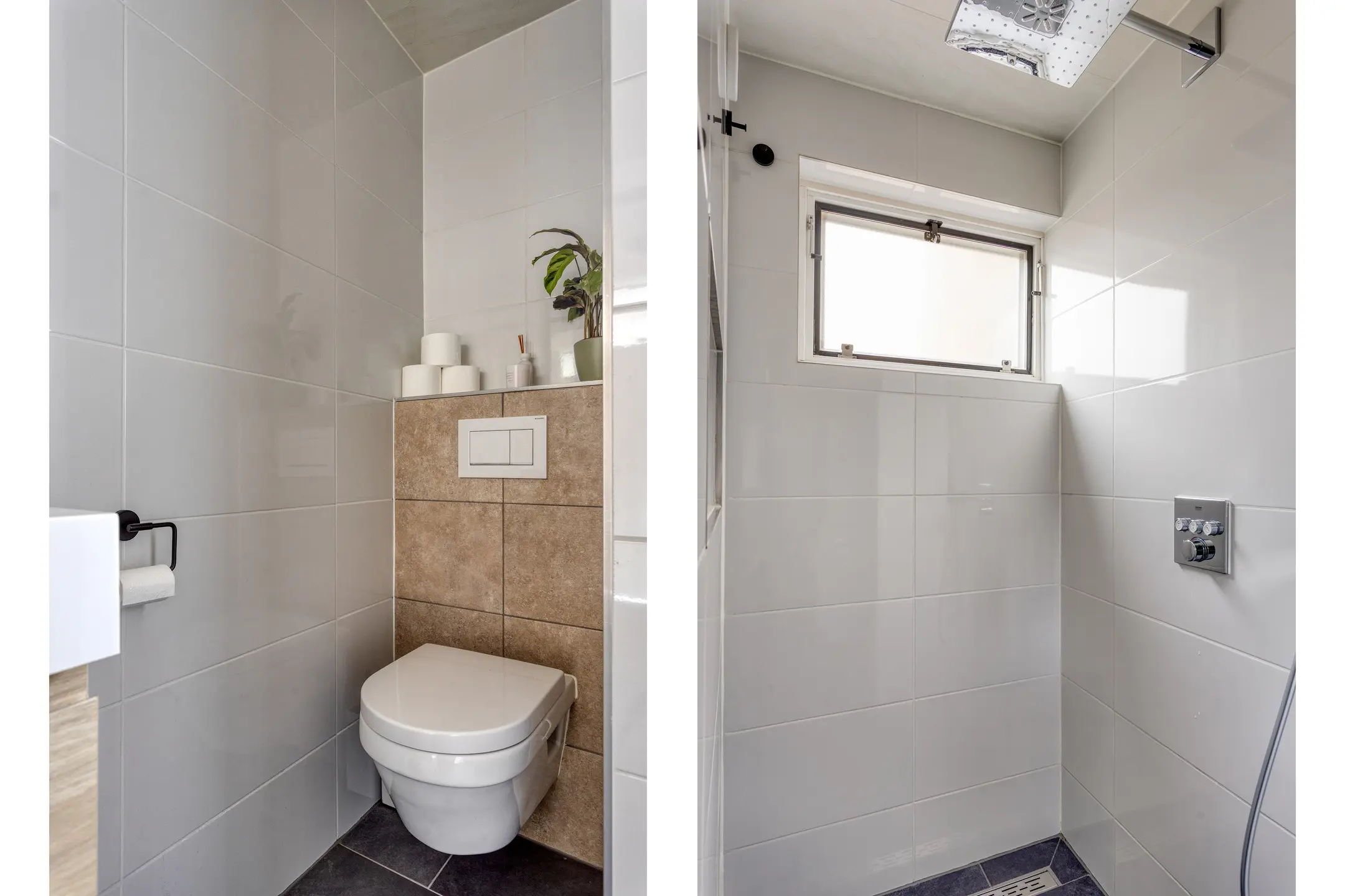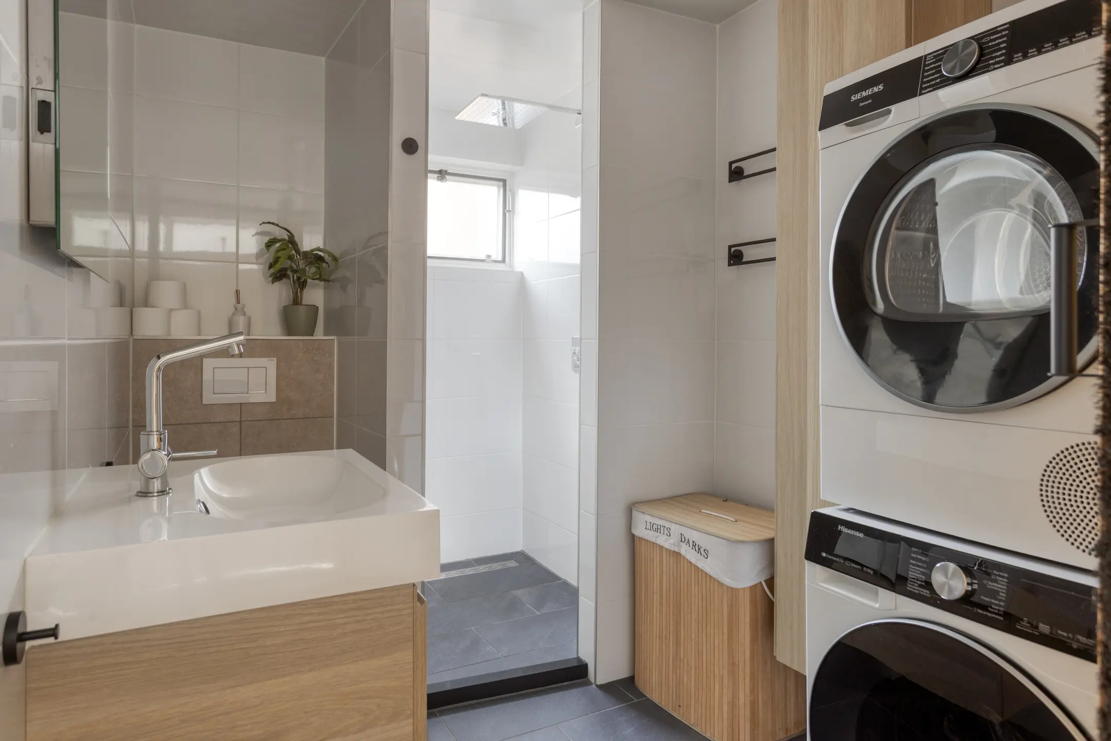 Overloop met toegang tot drie slaapkamers en de badkamer (2022). De badkamer is uitgerust met een inloopdouche, wastafelmeubel, toilet en wasmachineaansluiting.