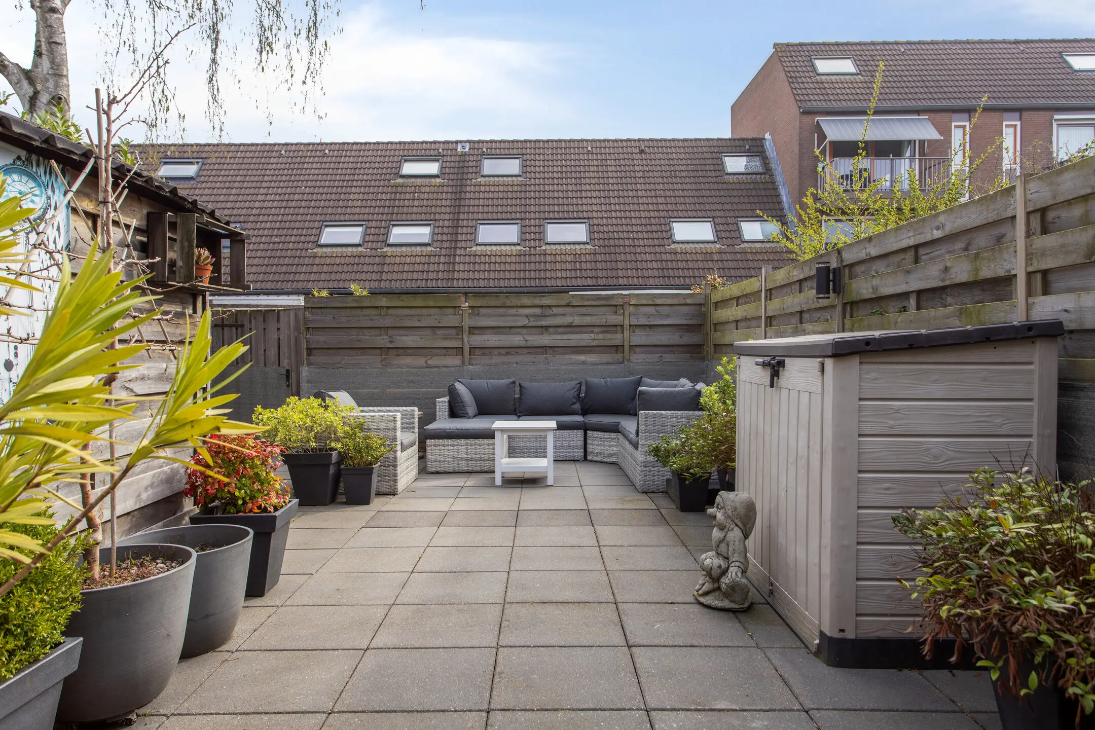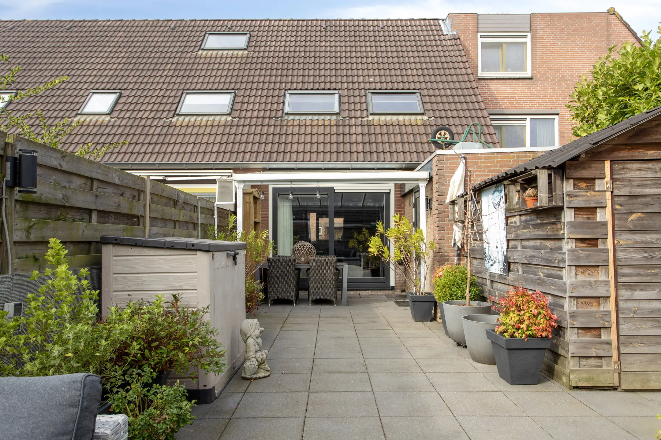 De achtertuin is gelegen op het zuidoosten en heeft een oppervlakte van circa 66 m². De tuin is bereikbaar via een achterom en beschikt over een aangebouwde stenen berging.