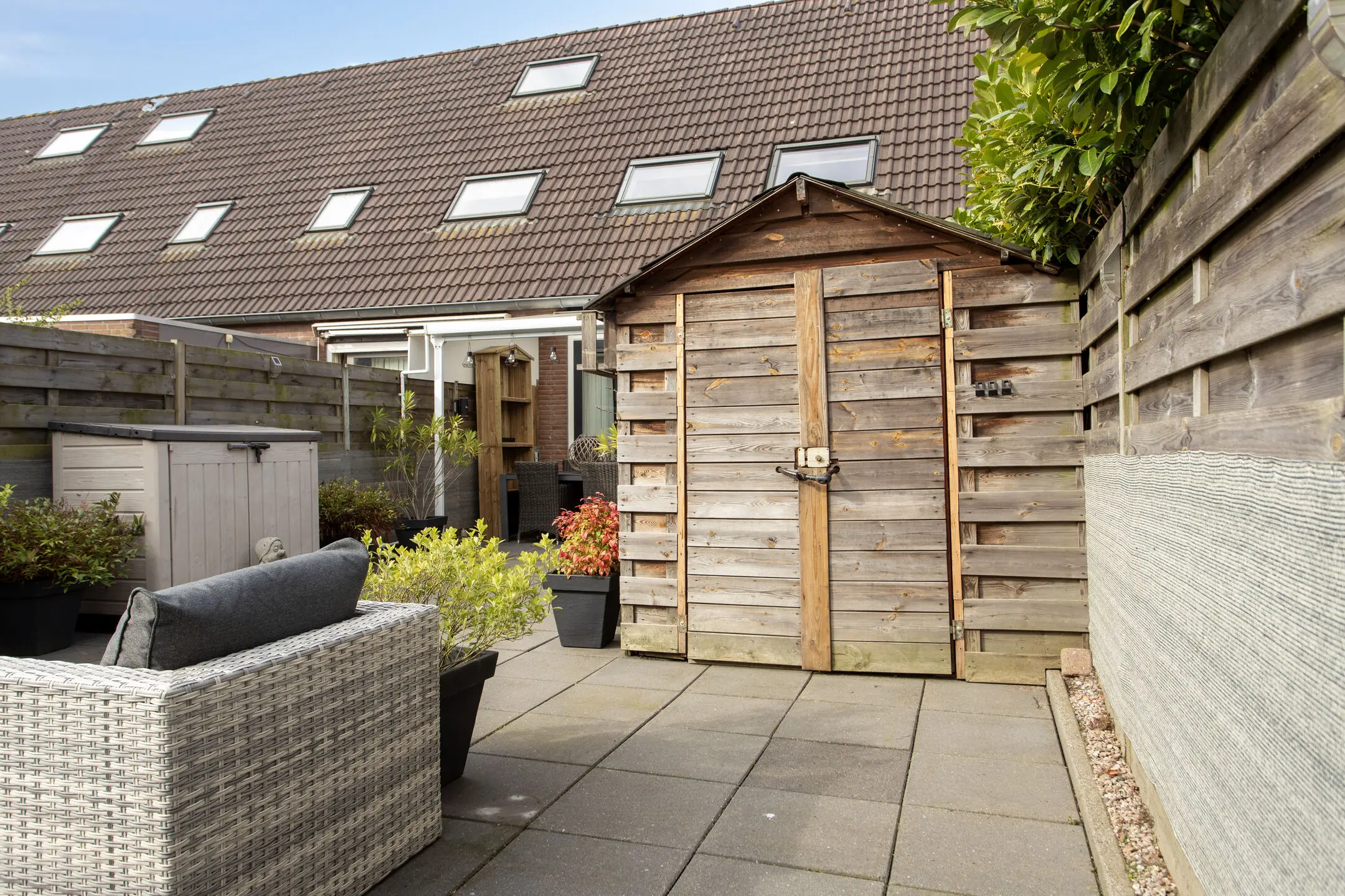 Achtertuin van ca. 66 m² op het zuidoosten met achterom en stenen berging