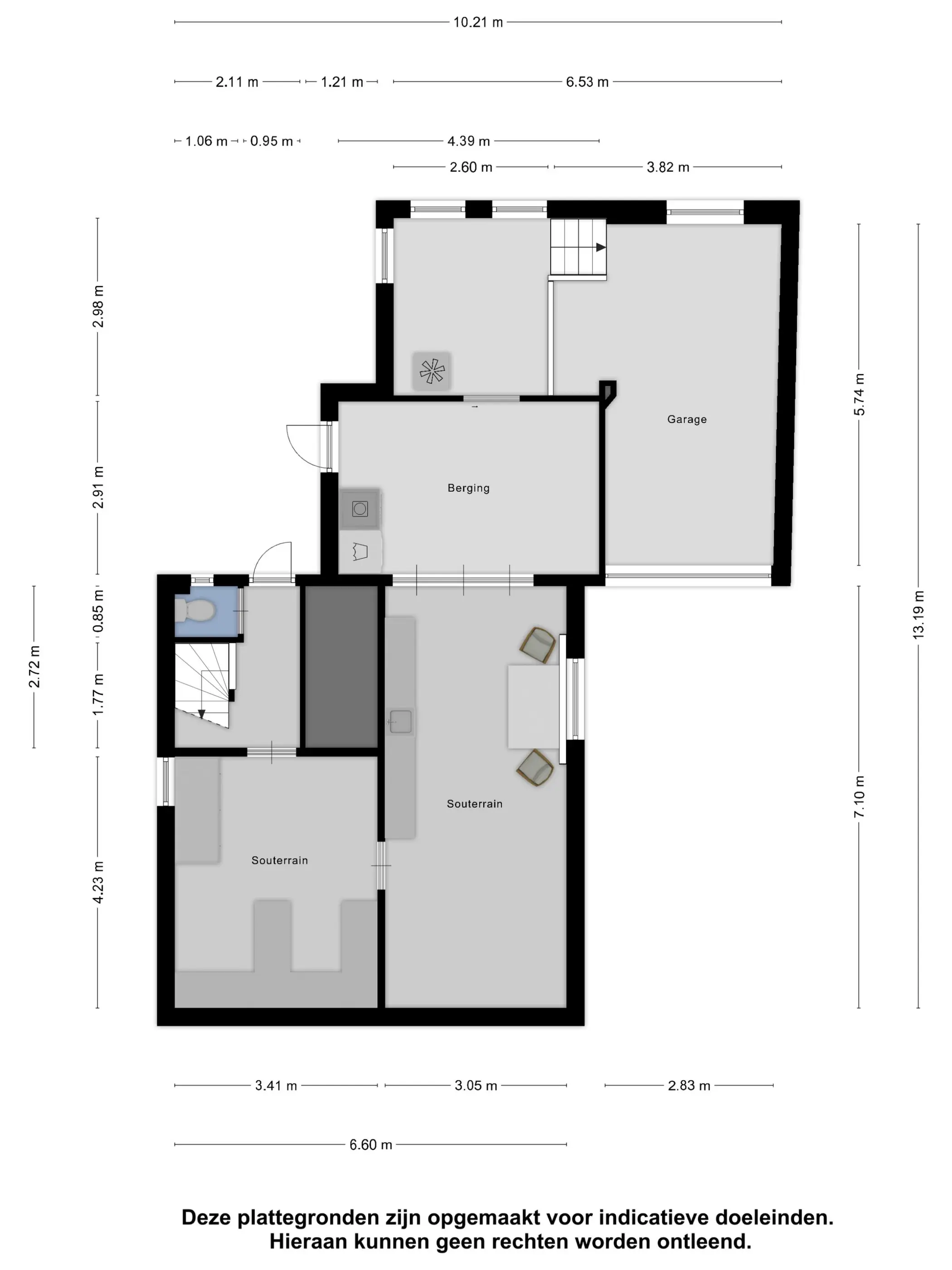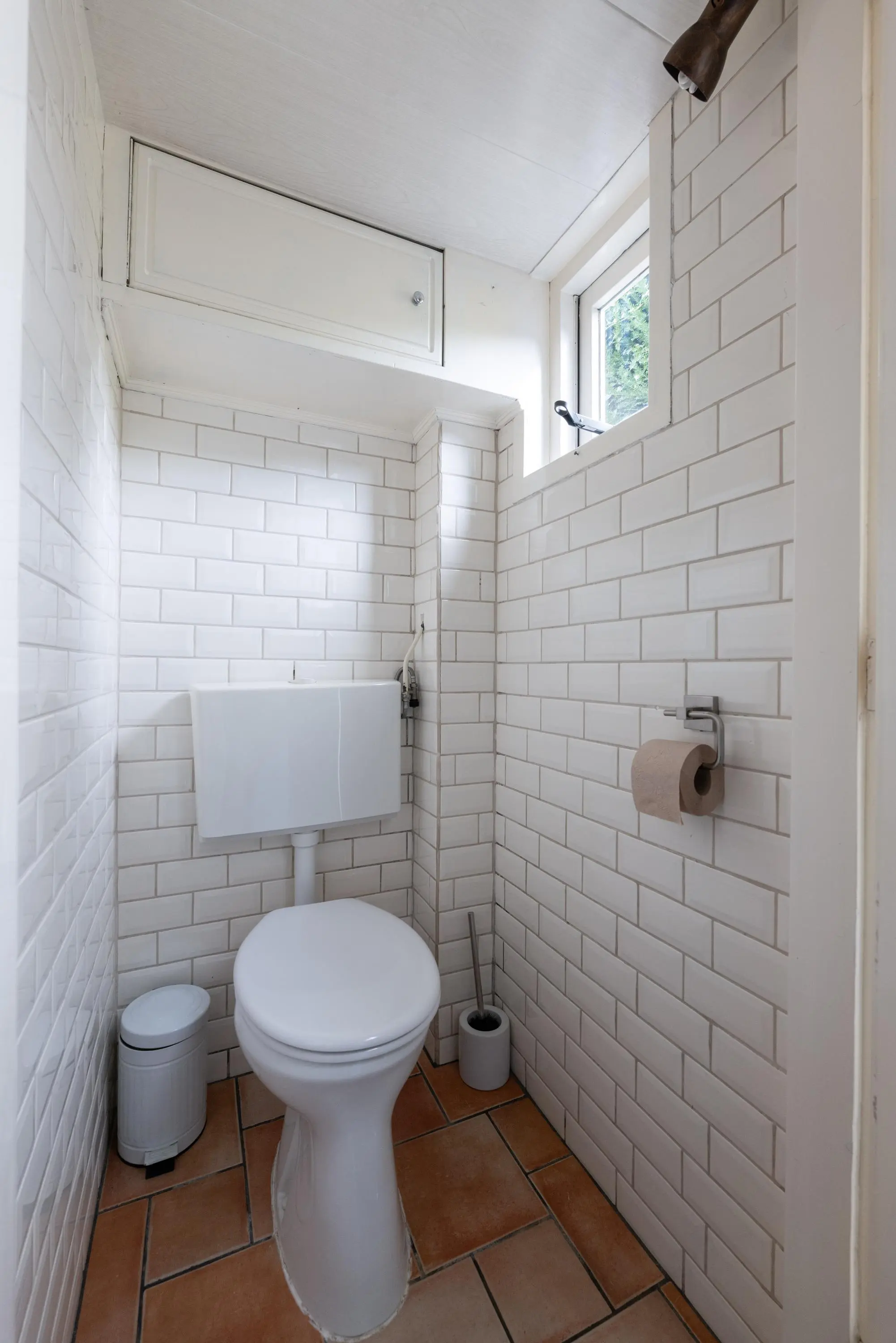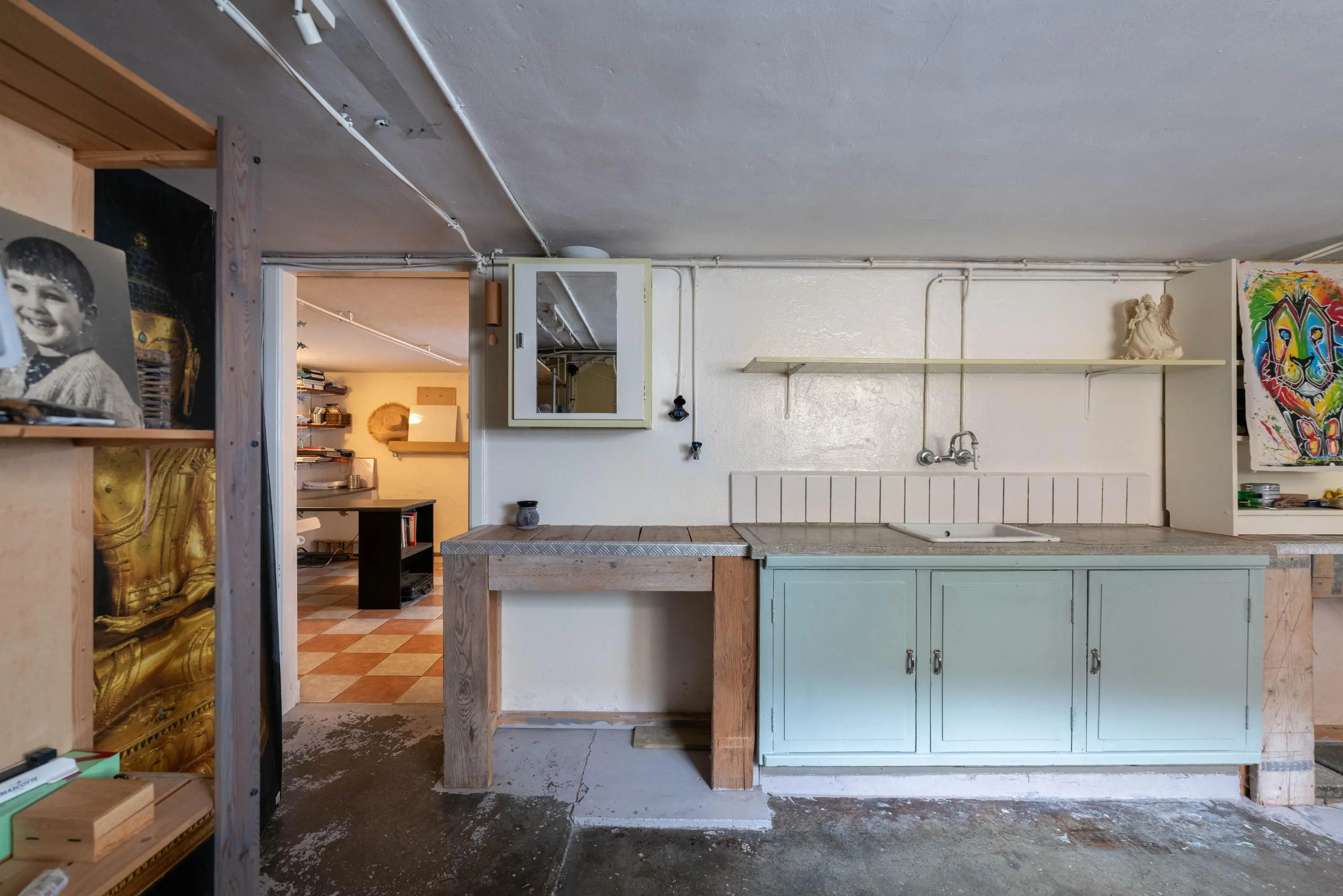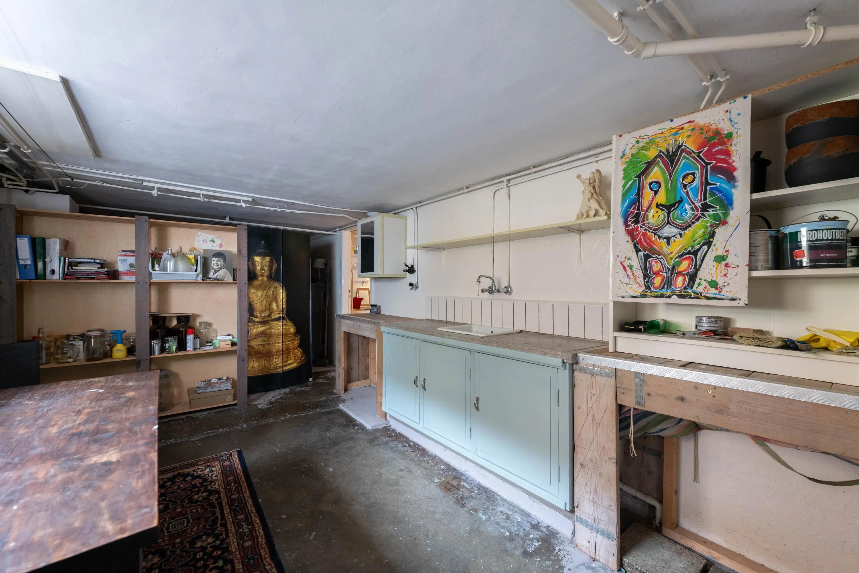 Vanuit de keuken ga je naar het ‘onderhuis’. Hier is een hal met toiletruimte en achterdeur naar de tuin. Het souterrain heeft 2 kamers welke ingericht zijn als een werkkamer en als tweede keuken. Deze ruimten worden verwarmd door middel van radiatoren. Aan de achterzijde is een berging/bijkeuken met wasmachine- en drogeropstelling en een achterdeur naar de tuin. Daarachter is een berging vanwaar je inpandig naar de garage gaat.