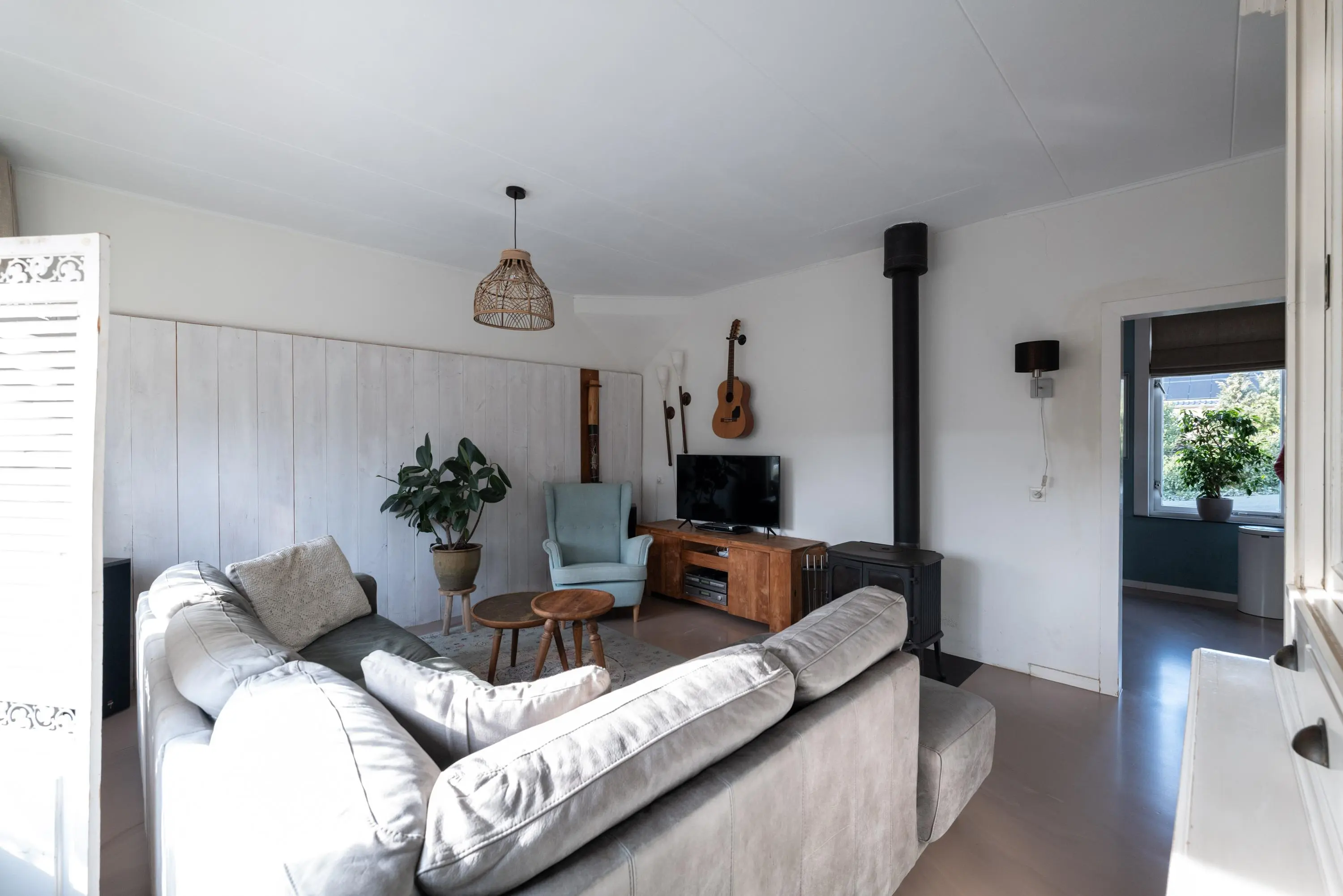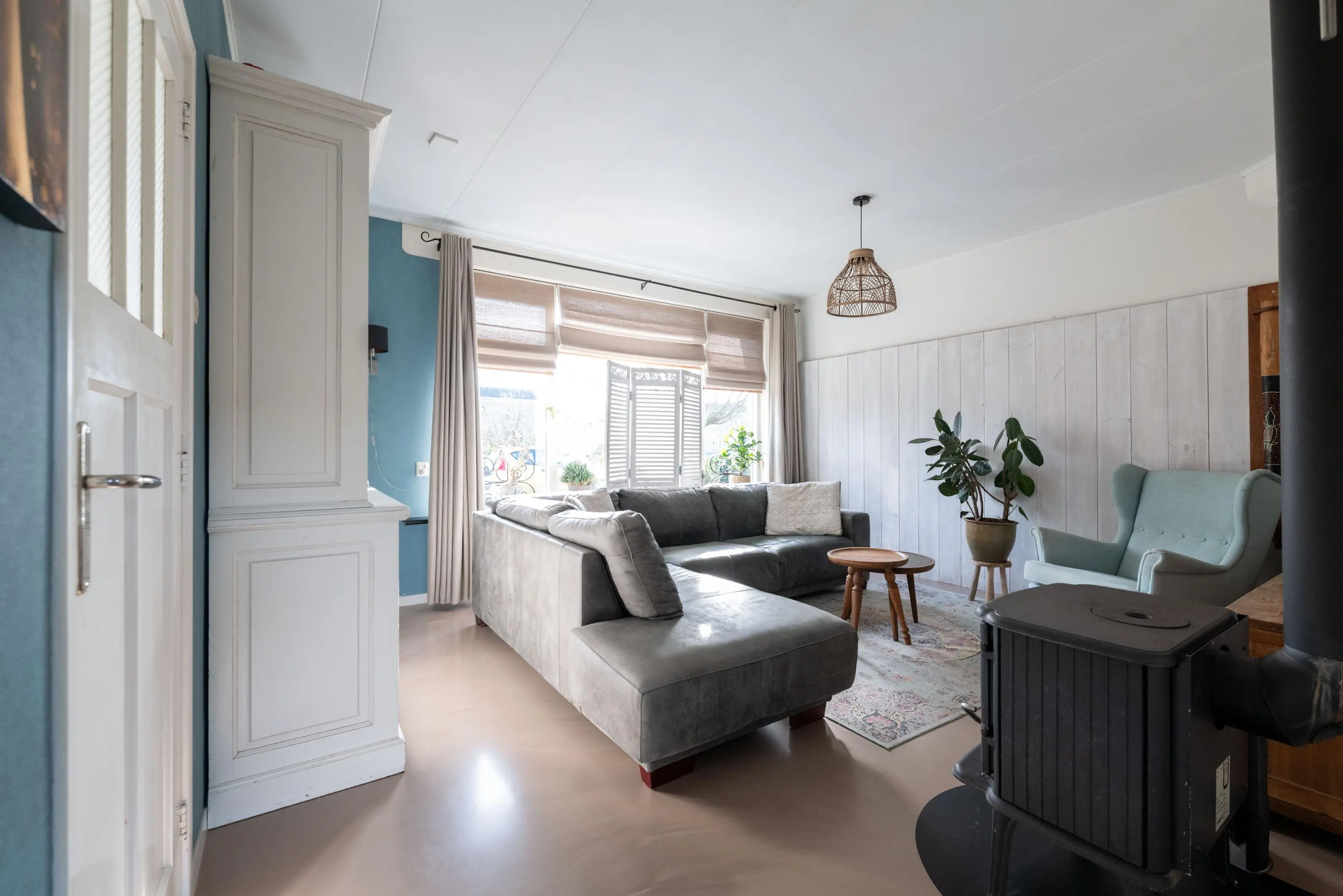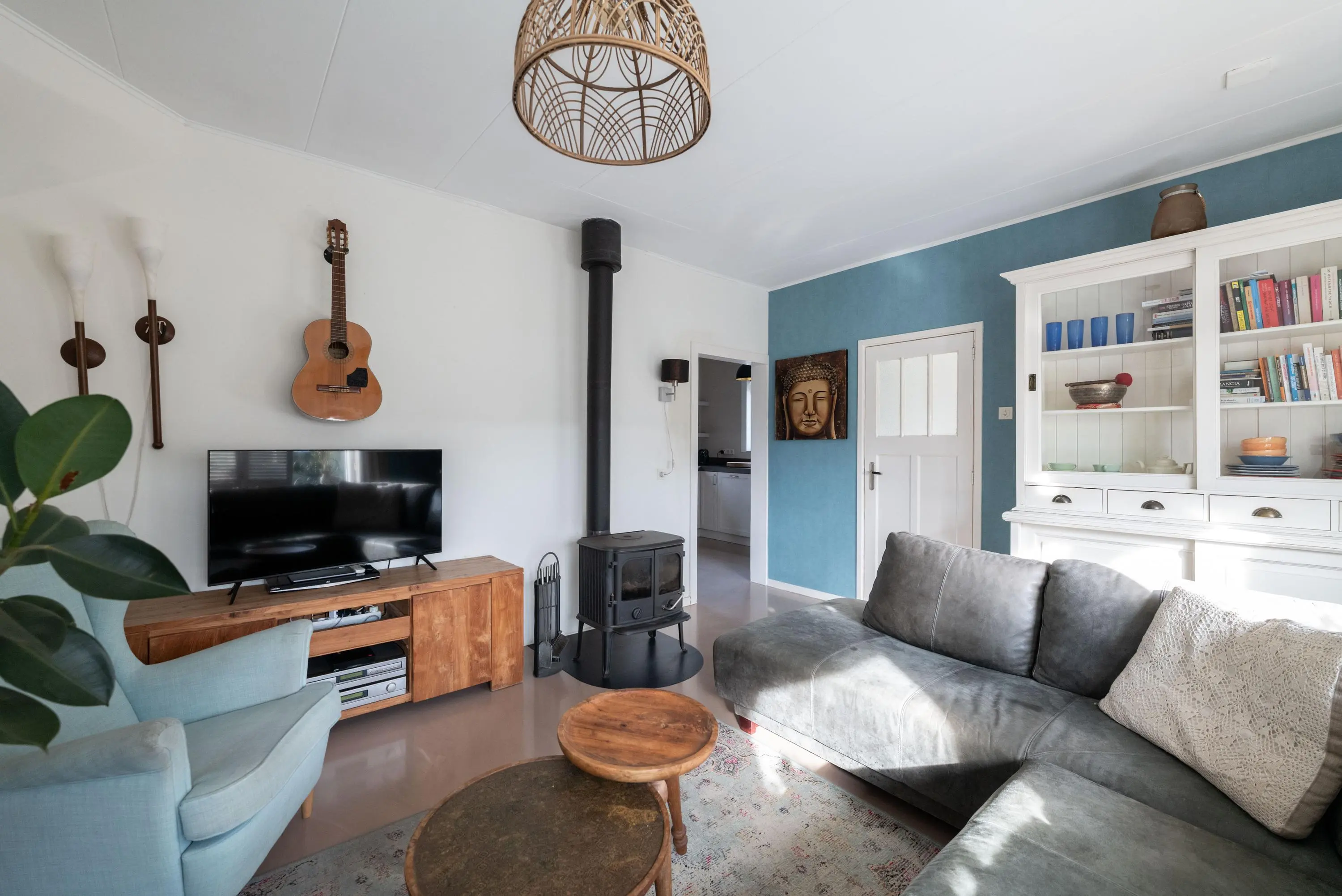 Entree met meterkast en cv-ruimte. Aan de voorzijde is de sfeervolle woonkamer met houtkachel. De gedeeltelijk open keuken is ruim en is in U-opstelling en voorzien van provisiekast. Deze woonkeuken is voorzien van inbouwapparatuur zoals de 5-pits gaskookplaat met afzuigkap, oven, koelkast, vriezer en vaatwasser. Vanaf hier kun je zowel naar de 1e verdieping als het souterrain.