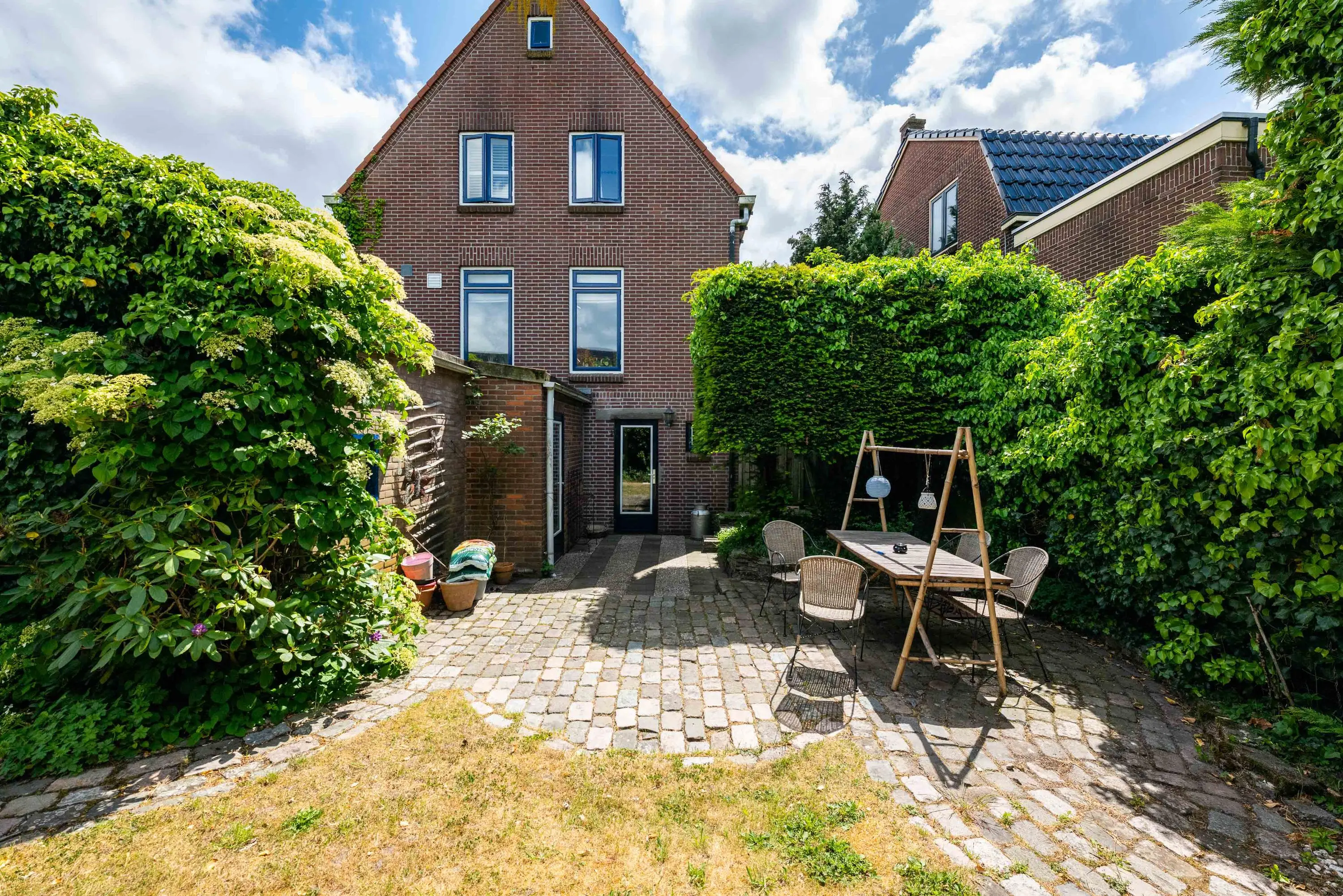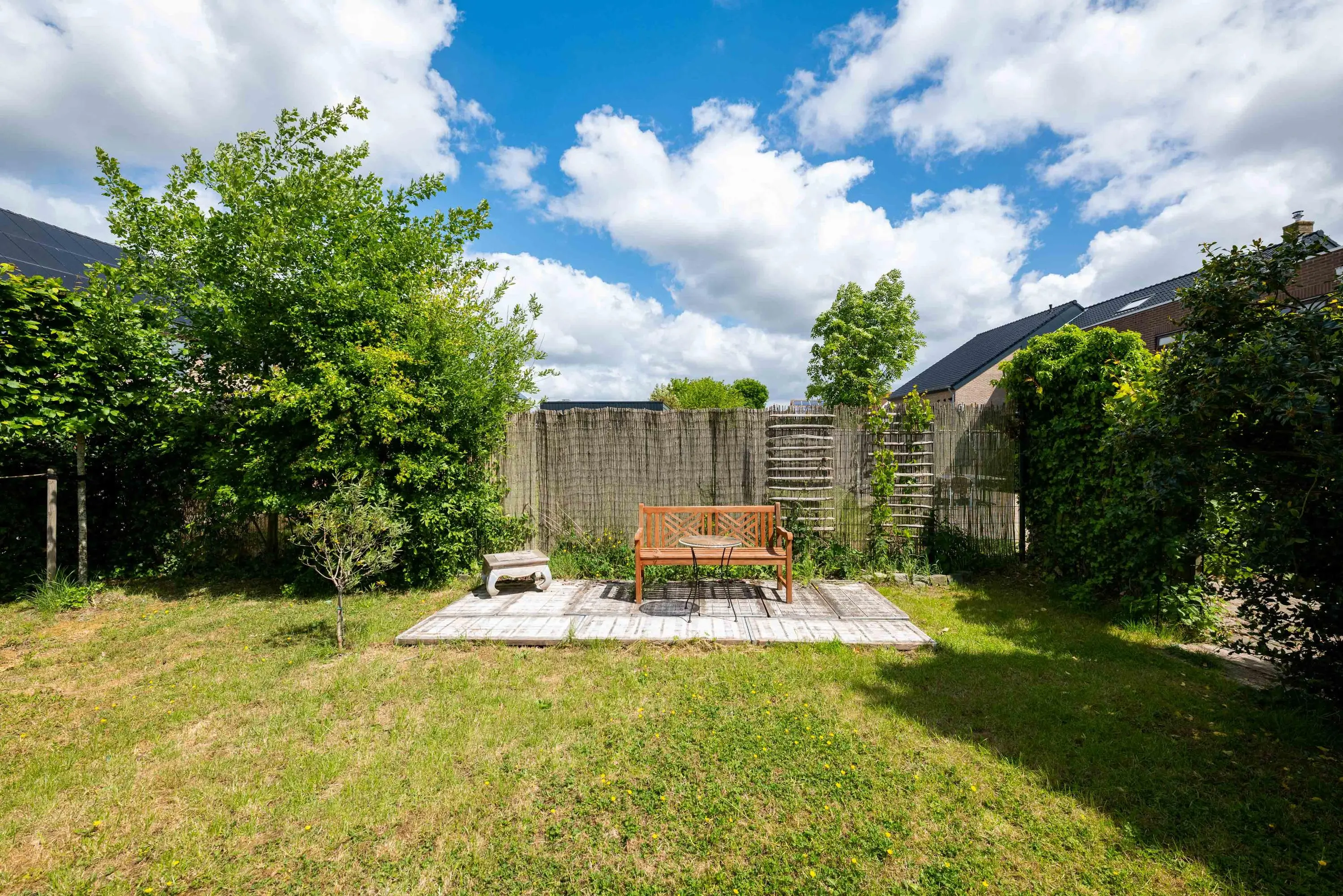 De grote achtertuin is ingericht met een gazon, terrassen, houtopslag en enkele bomen. Dat geeft dit huis een extra reden om fijn te kunnen wonen.